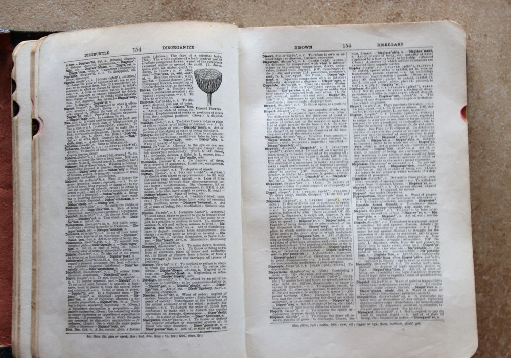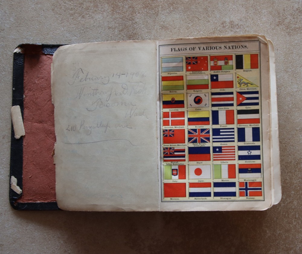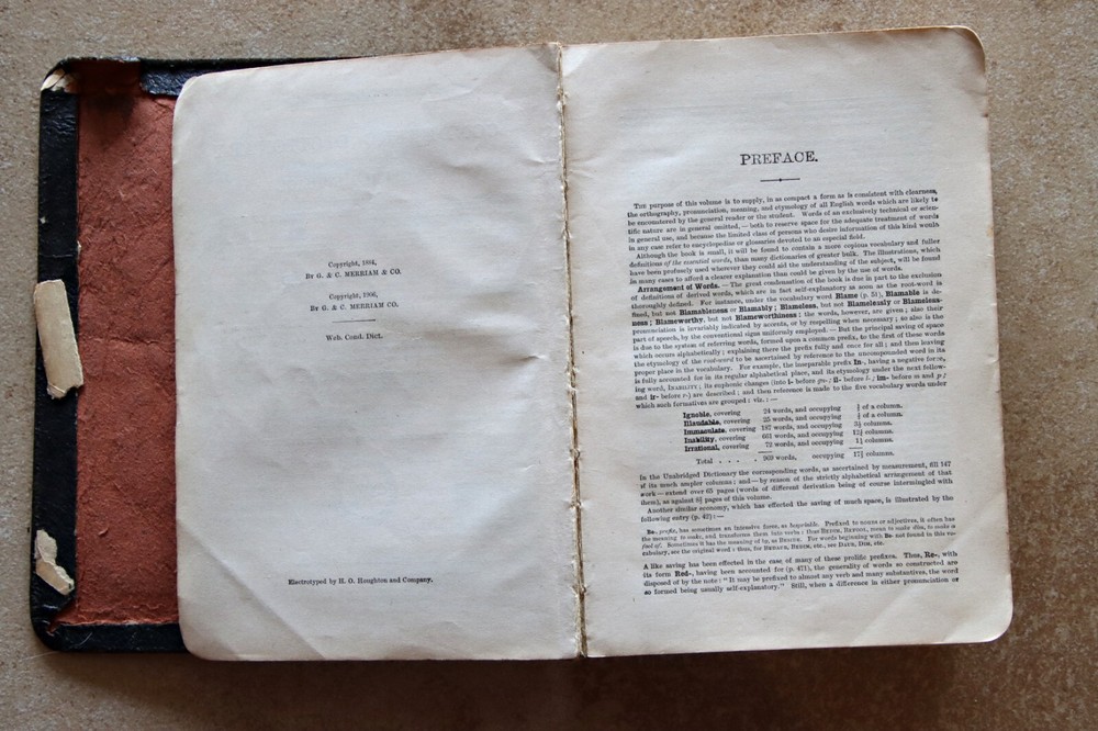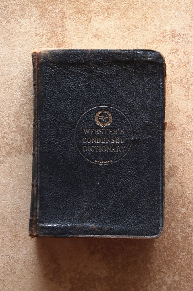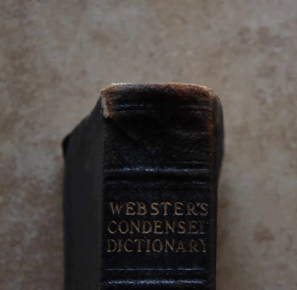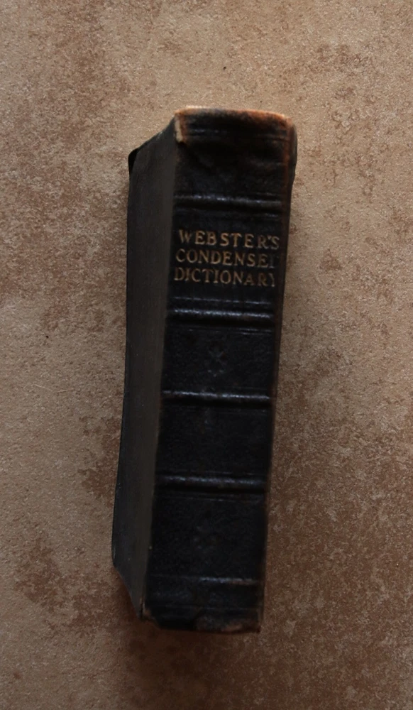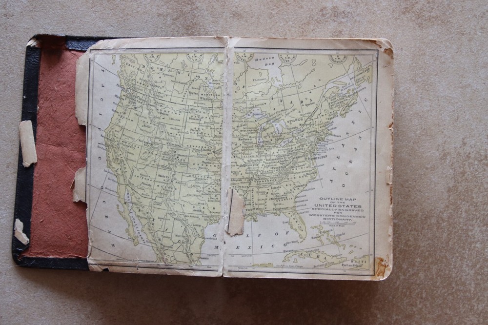 Antique Webster’s Condensed Dictionary Leatherbound Copyright 1906 G & C. Merriam & Co. Description: Antique Webster’s Condensed Dictionary · Leatherbound · Copyright 1884 · Published 1906 G & C. Merriam & Co. · Tabbed · Illustrations · Dimensions: 7.75” x 5.5” x 1.75” · Pronouncing Vocabulary of Biblical, Classical, Mythological, Historical and Geographical Proper Names in back · Arbitrary Signs Used in Writing and Printing in back · Number of pages: 794 · Maps in front and back · Flags of Various Nations in front · Electroplated by H.O. Houghton and Company · Language: English Condition: Good Antique Binding Intact, Pages Intact no mars of markings Note: Leather bound cover has pulled away from front page Front page has tiny parts missing on edging. Tiny tear top outer spine, Prior Owners name and date (1908) inscribed inside. See close up photos Price: $28 Shipping: $6