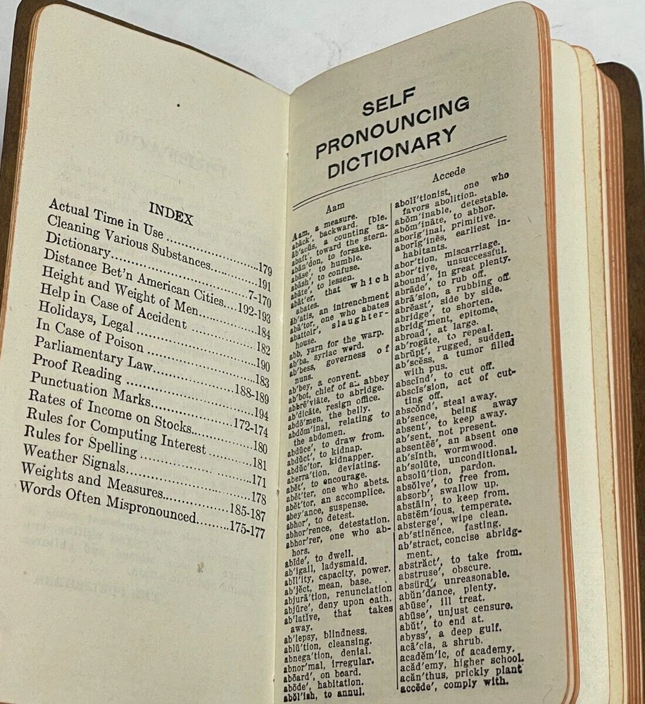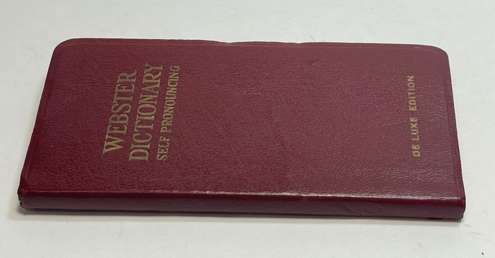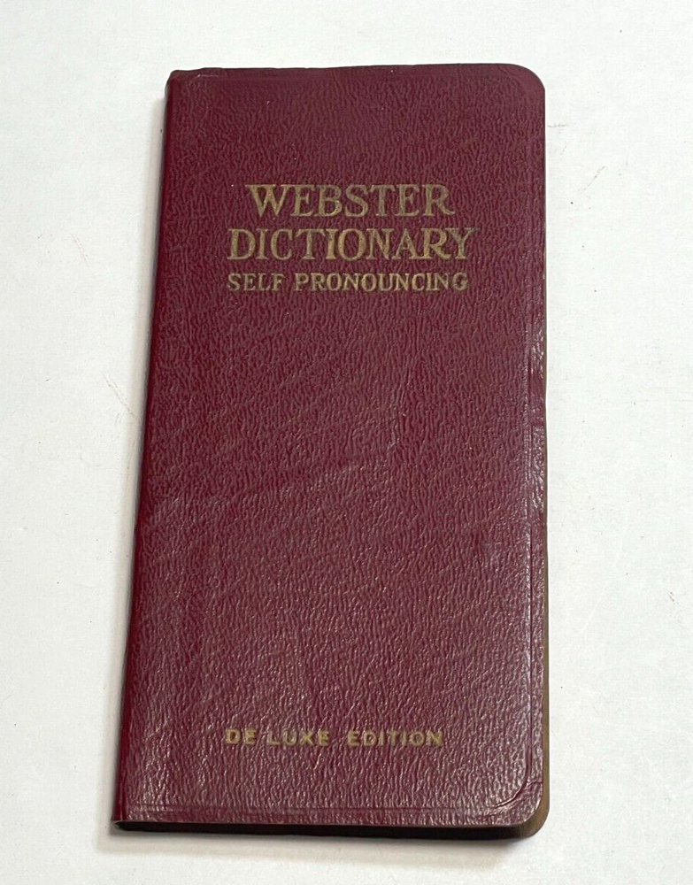Antique Websters Vest Pocket Dictionary Self Pronouncing De Luxe Edition Approx. 5.5” x 2.75” Leather binding No date provided Previous owner’s information inside front cover and writing inside back c...