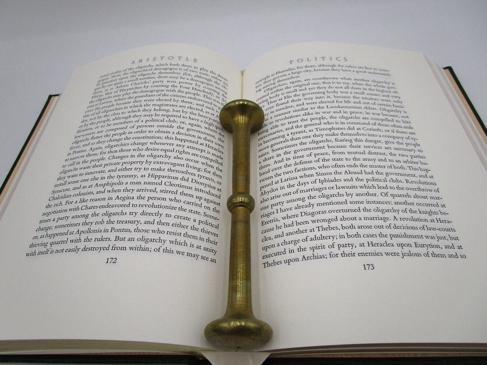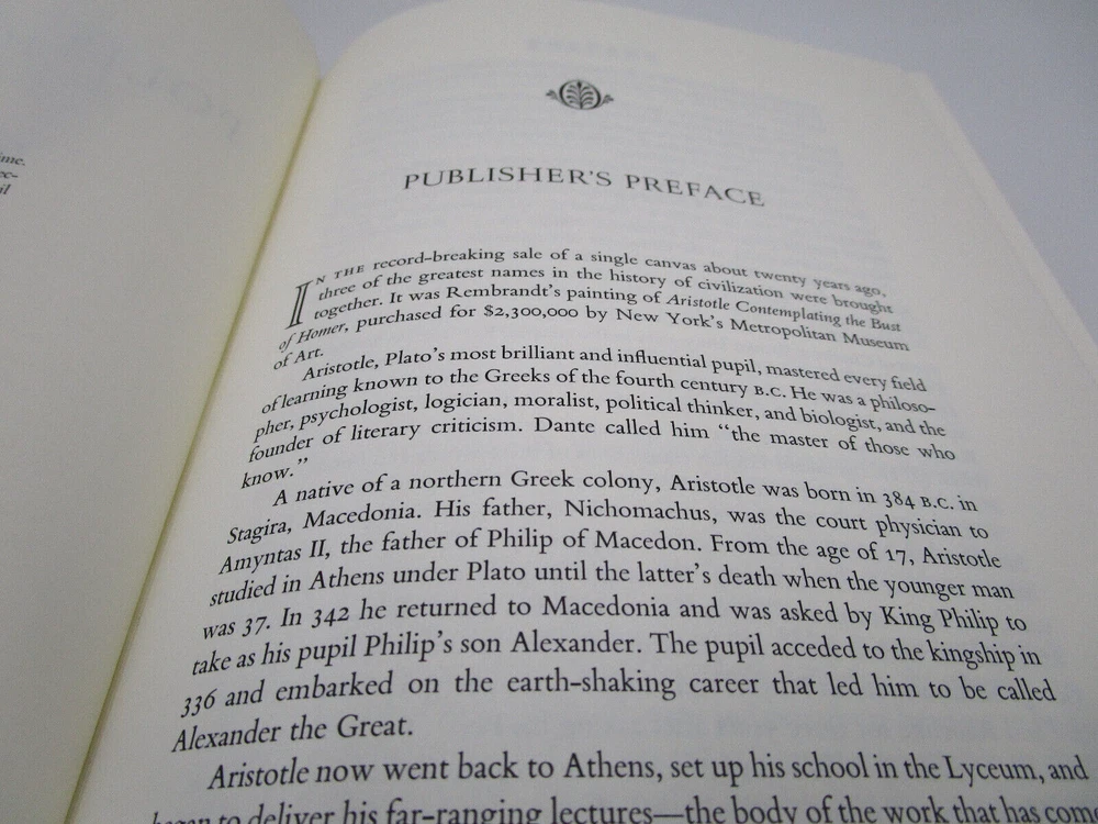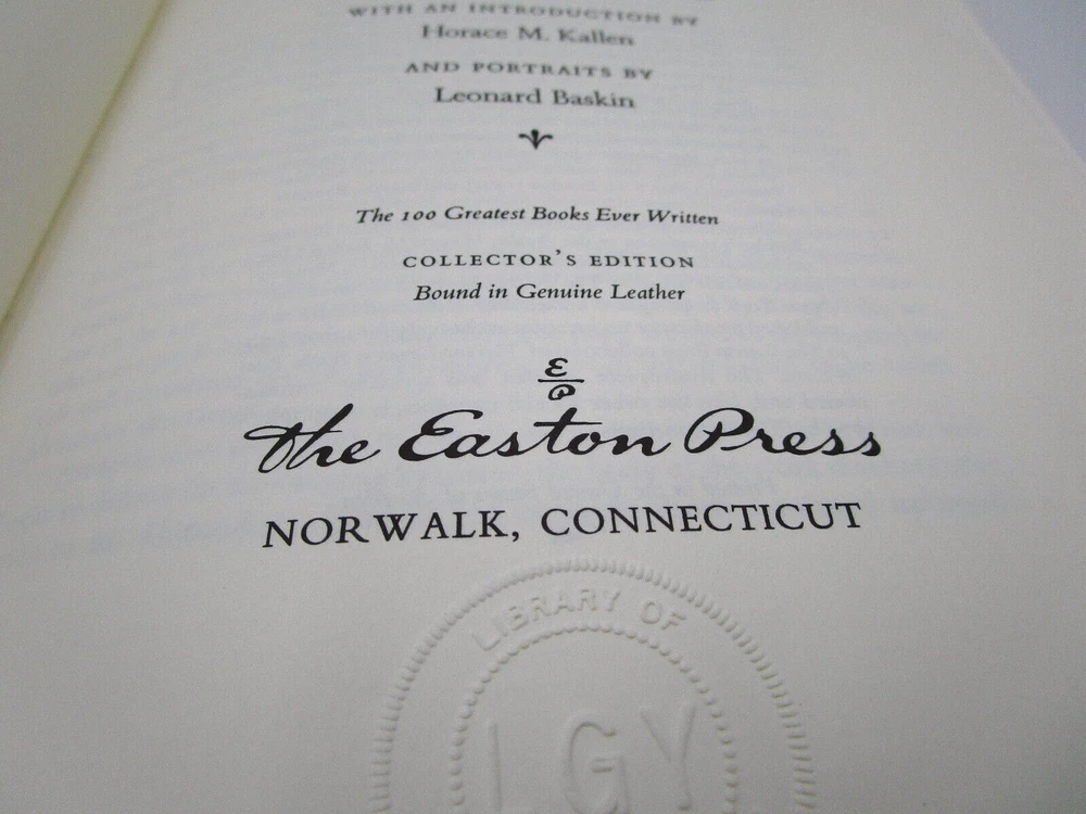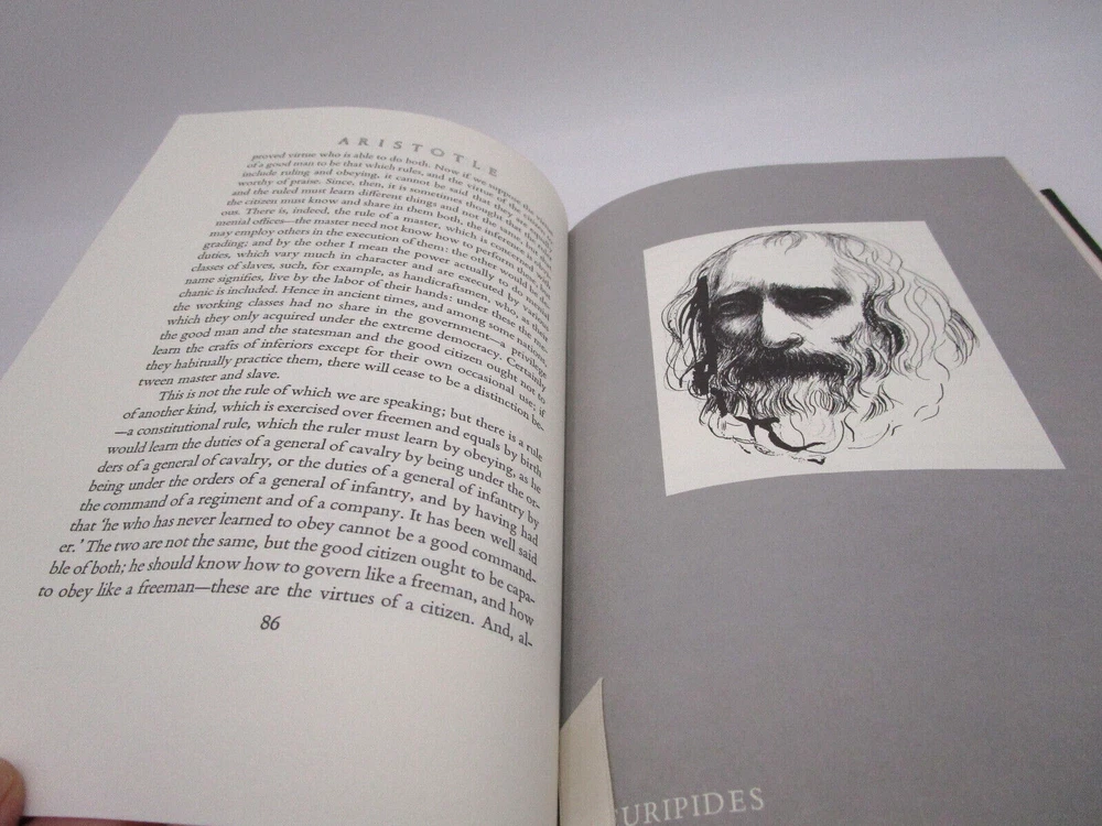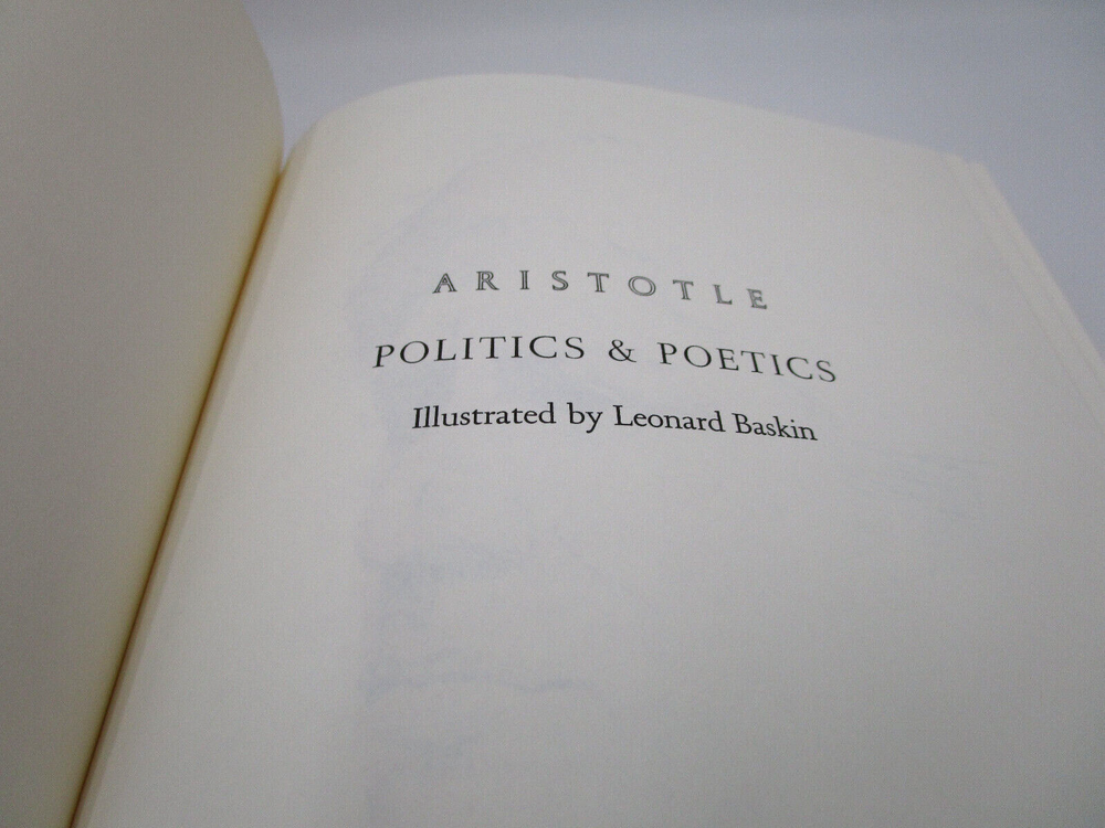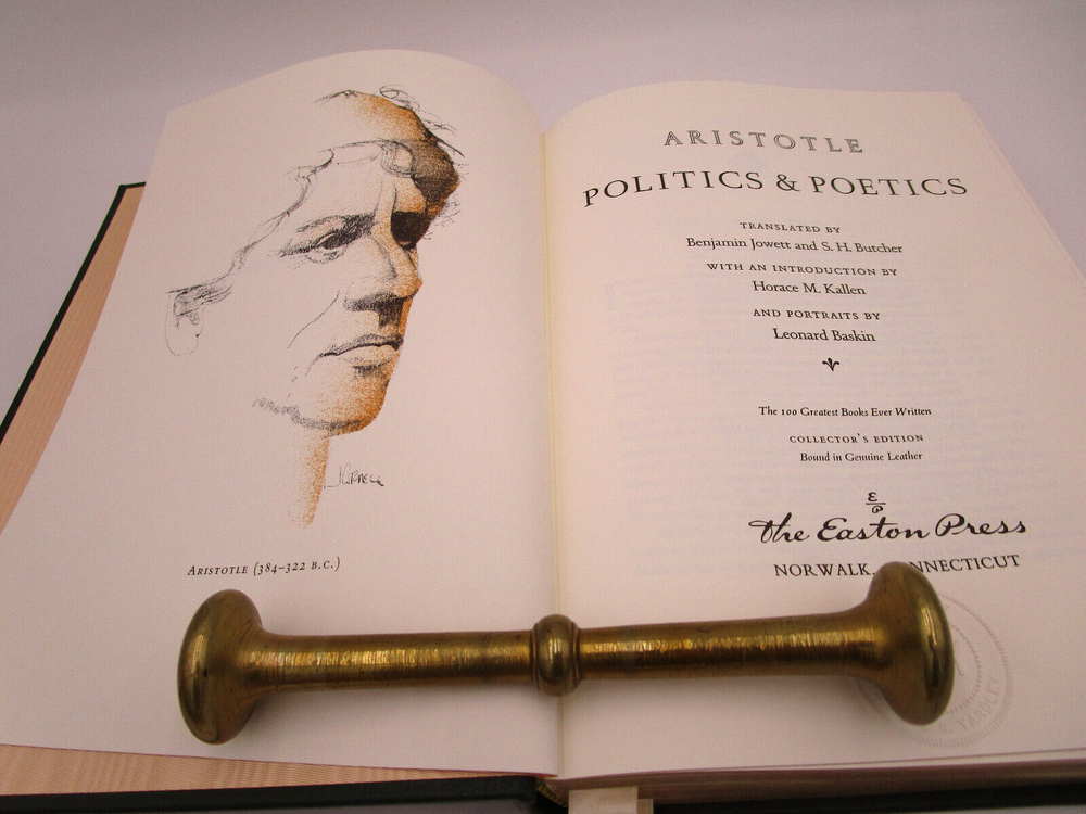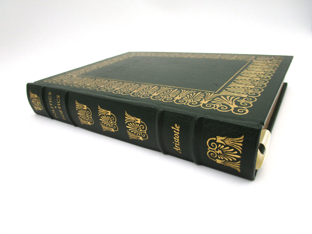 Gorgeous gilded leather bound edition of Aristotle's Politics and Poetics. The Easton Press produced a collectors edition of the 100 greatest masterpieces in Literature and this is one of the volumes. It is is very nice condition: no stray marks or soiling. It does have the original owners book plate and embossed library stamp. High quality paper and wonderful illustrations make this an excellent addition to any collection.