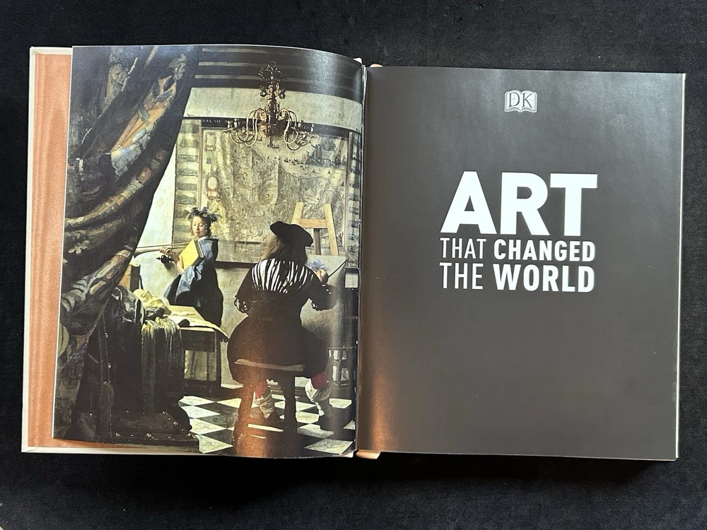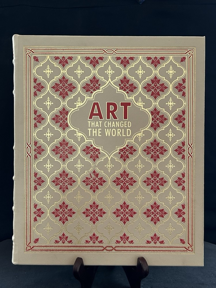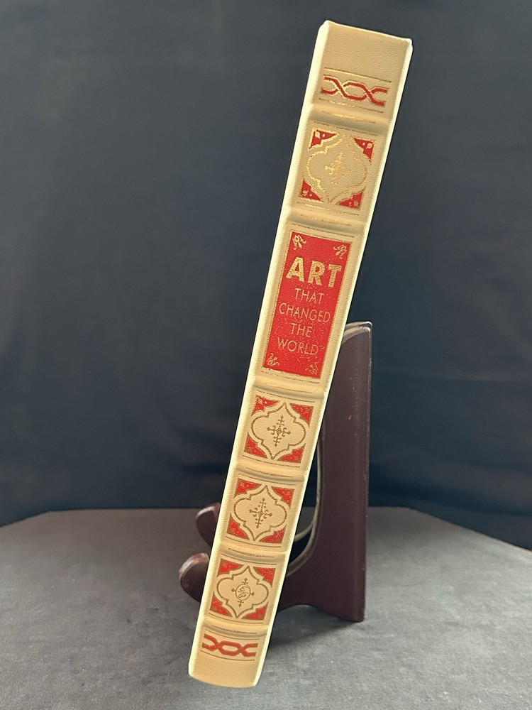 This volume is in excellent condition. Though it has been unwrapped, it has never been read. I am the only person who has ever owned this book and it’s been in my bookcase undisturbed for years. The book still cracks when you open it and has not been handled much at all. In fact I am the only person to ever touch this book. The only way it has ever been cleaned is a light dusting with a clean, dry microfiber cloth. It is bound in white leather and it appears to be a little dirty. I have not and will not attempt to clean the dirt off. I would not want to accidentally damage the book in any way. Featuring acid-neutral archival quality paper, 22k gold accents, a satin ribbon page marker, moire fabric end sheets, and beautiful white leather binding; this book is a fantastic addition to any collector’s library. This first American edition of Art That Changed The World is a must-have for any art enthusiast. Feel free to ask any questions you may have as there are no returns on this purchase. It has a shipping weight of about 6 pounds. I will pack it with extreme care to ensure you will receive the book in the same beautiful condition it is in now. Your satisfaction is important to me. I appreciate your interest in my wares and look forward to doing business with you. Thank you. -Steve