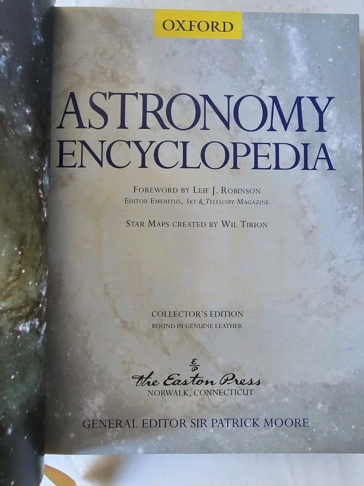 464pp. Original boards; decorative black leather binding with golden cover design; attached silk ribbon bookmark . Measured by 9" x 11 3/4". Collector's Edition bound in genuine leather by The Easton Press. Foreword by Leif J. Robinson, Editor Emeritus, Sky & Telescope Magazine. Star Maps created by Will Tirion. Pages are bright and clean (unmarked). Binding is tight and secure. Outer page edges are slightly finger soiled with minor rubbing to extremities. Please review the photographs to form your own opinion as to the condition. Thanks for looking.