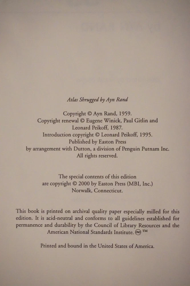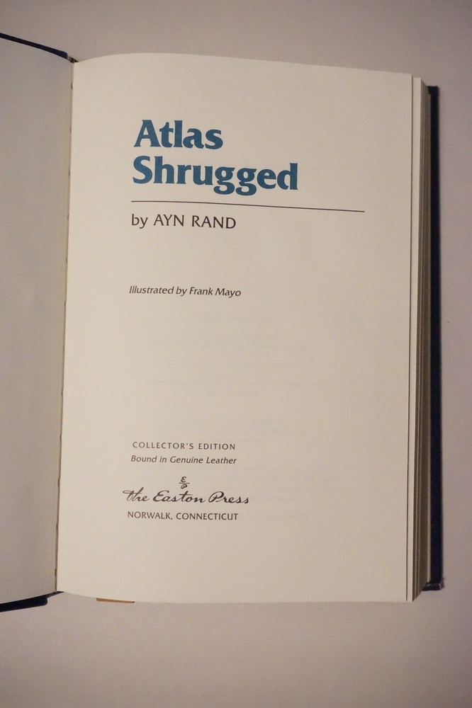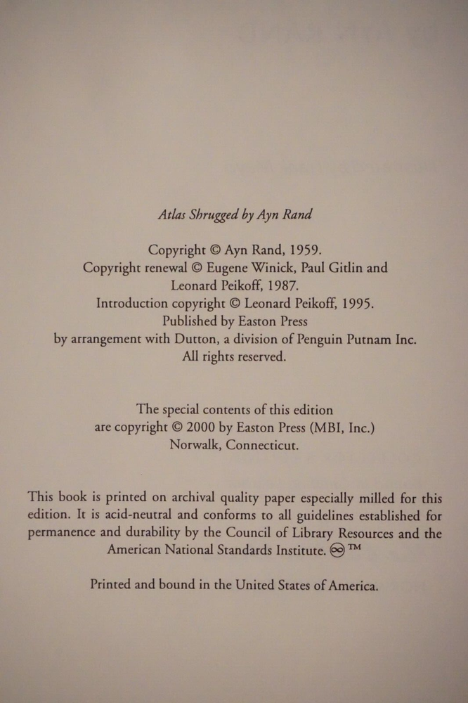 Wonderful copy of Atlas Shrugged - Volumes 1 and 2 by Ayn Rand. Published in 2000 by Easton Press of Norwalk, Connecticut. The leatherbound books are in very good condition, with minimal wear to the covers and edges. Great find at a great price! Please note the S&H charges, which include USPS postage, materials, and handling. Pictured bookends are not included in the sale. This item will be shipped insured and will require signature confirmation upon receipt. View our other eBay listings at Weiss Lane Books! https://www.ebay.com/str/Weiss-Lane-Books