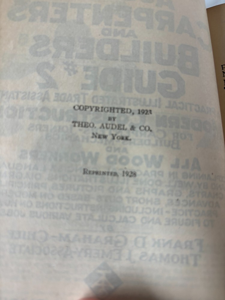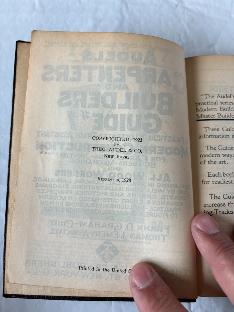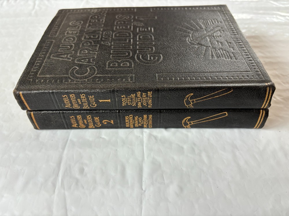 This is a rare and valuable find for collectors and enthusiasts of antique books. The Audels 1928 printing Carpenters and Builders Guide Volumes 1+2 is a beautifully bound leather books written by Theo Audel & Co. and published by the same company. The book is in its original form and is not a facsimile. The book is written in English and is a great reference for those interested in carpentry. It covers various topics related to carpentry and is a valuable resource for those interested in the subject. The book is in very good shape and will make a great addition to any antique book collection.