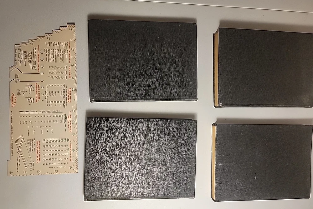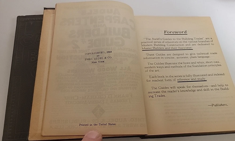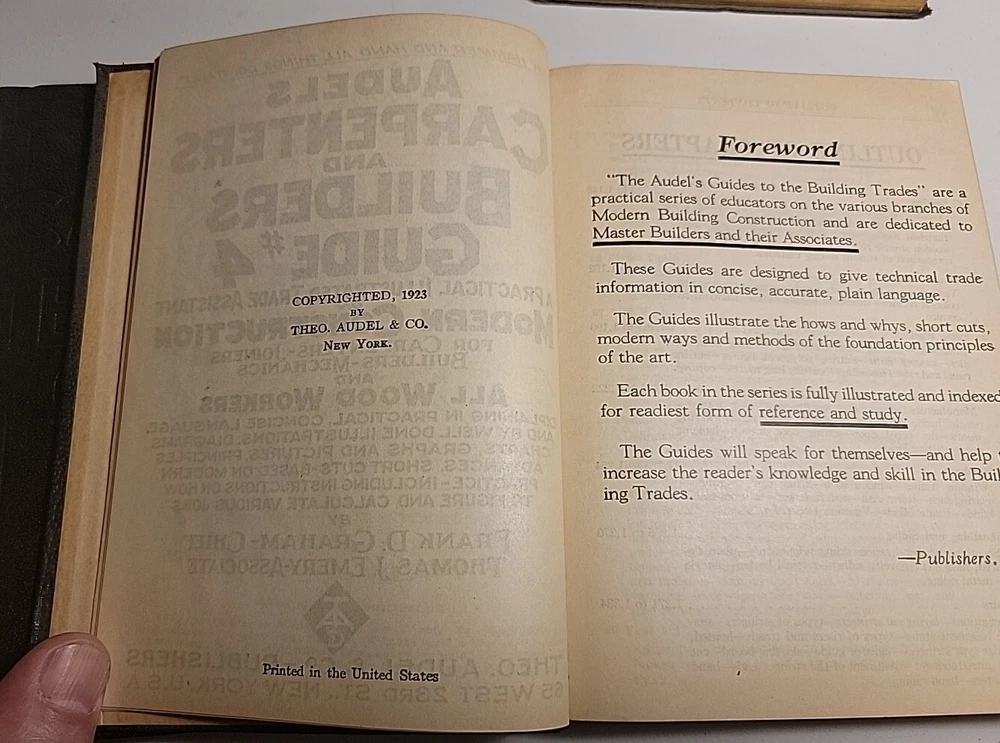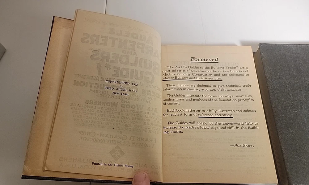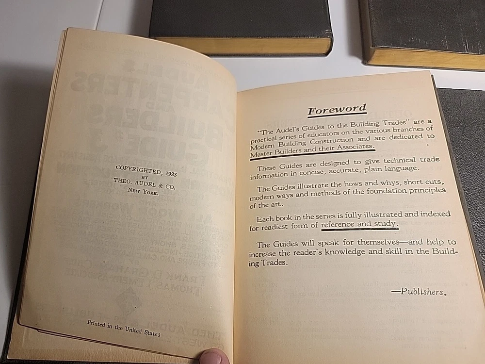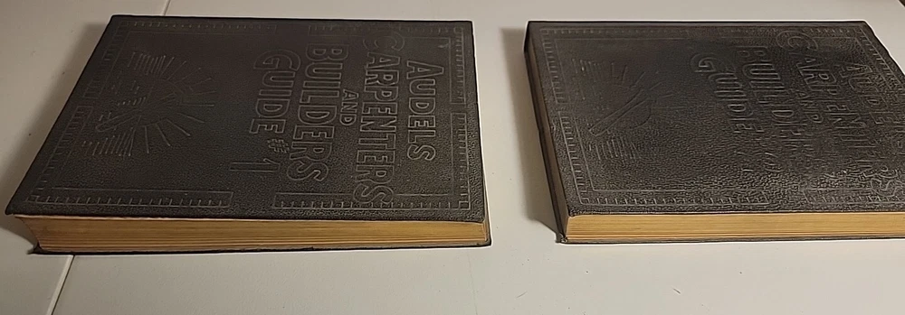 This is a rare and valuable first edition of Audels Complete Carpenters and Builders Guide in four volumes from 1923, published by Theo Audel & Co. The leather binding and illustrated pages make this set a beautiful addition to any collection. The books cover a variety of topics related to carpentry and building, making it an essential reference for professionals and enthusiasts alike. The books are in wonderful condition and have been well-preserved over the years. A small tear in book #1 on the first page, but other than that pages are all fine. A must-have for collectors of rare and valuable books. Also included popular science monthly protractor from 1966 Books will be well package and sent via media mail.