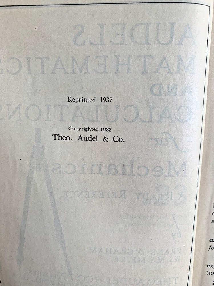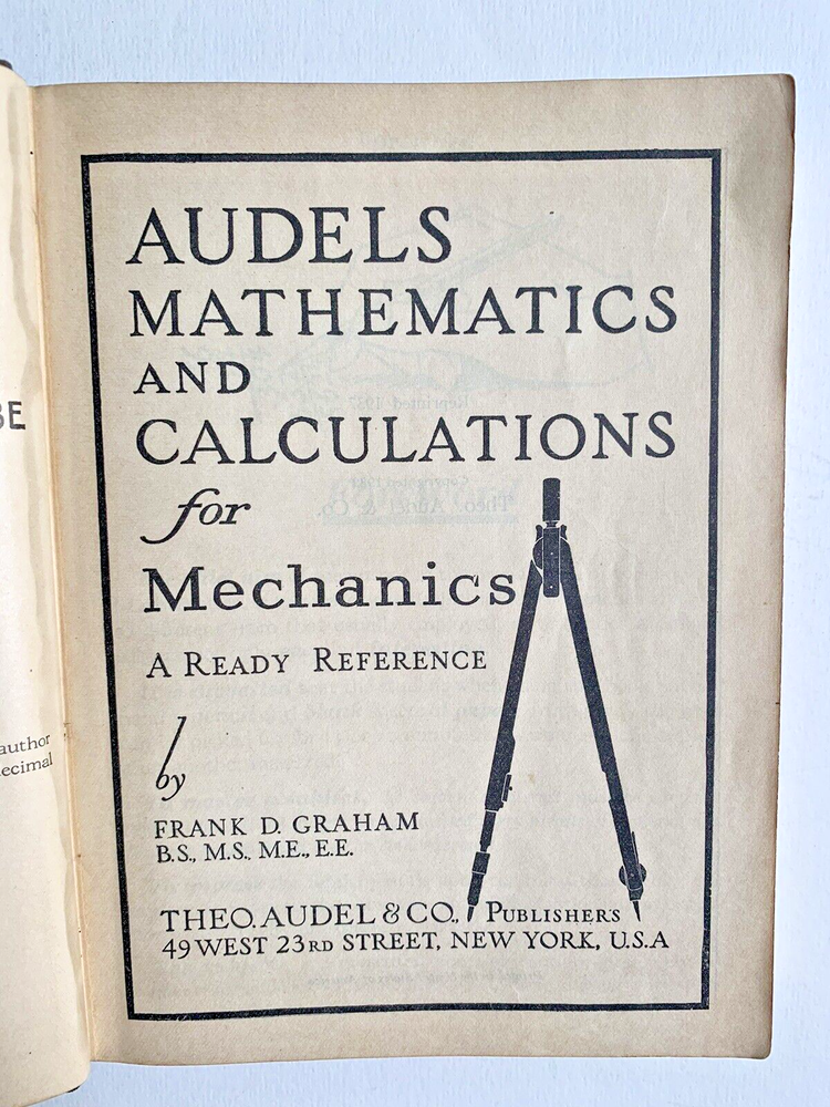 Audel's Mathematics and Calculations for Mechanics, published in 1937. This classic reference book is a valuable resource for anyone working in the field of mechanics, engineering, or any trade that requires mathematical calculations. Title Audels Mathematics and Calculations For Mechanics Author Frank D. Graham Publisher Theo. Audel & Co, Edition 1937 Features Illustrated. Includes Section D "How to Use a Slide Rule" Format Embossed bonded leather. Gilt edging on pages. Condition Good Size 6 1/2" x 5" 234 pages.