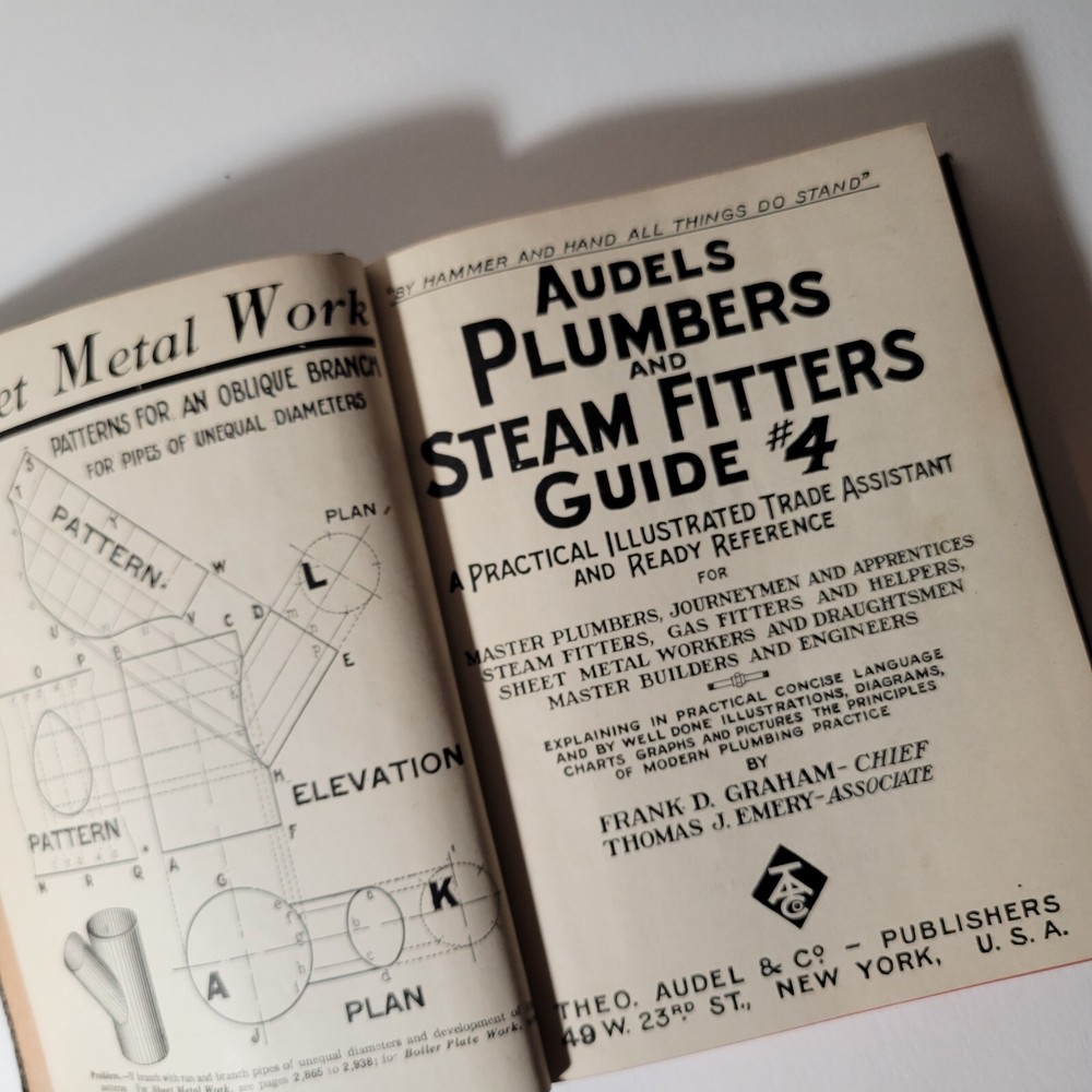Audels Plumbers and Steam Fitters Guide Vol 4 Illustrated Leather 1945 Reprinted Amazing condition for age. Dated 1945. No markings or writings, all pages are clean. Solid binding. Audels Plumbers and Steam Fitters Guide Vol 4 Illustrated Leather 1945 Reprinted. Condition is Very Good++ Shipped with USPS Media Mail .