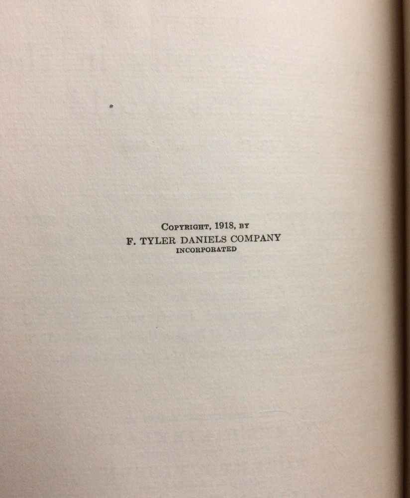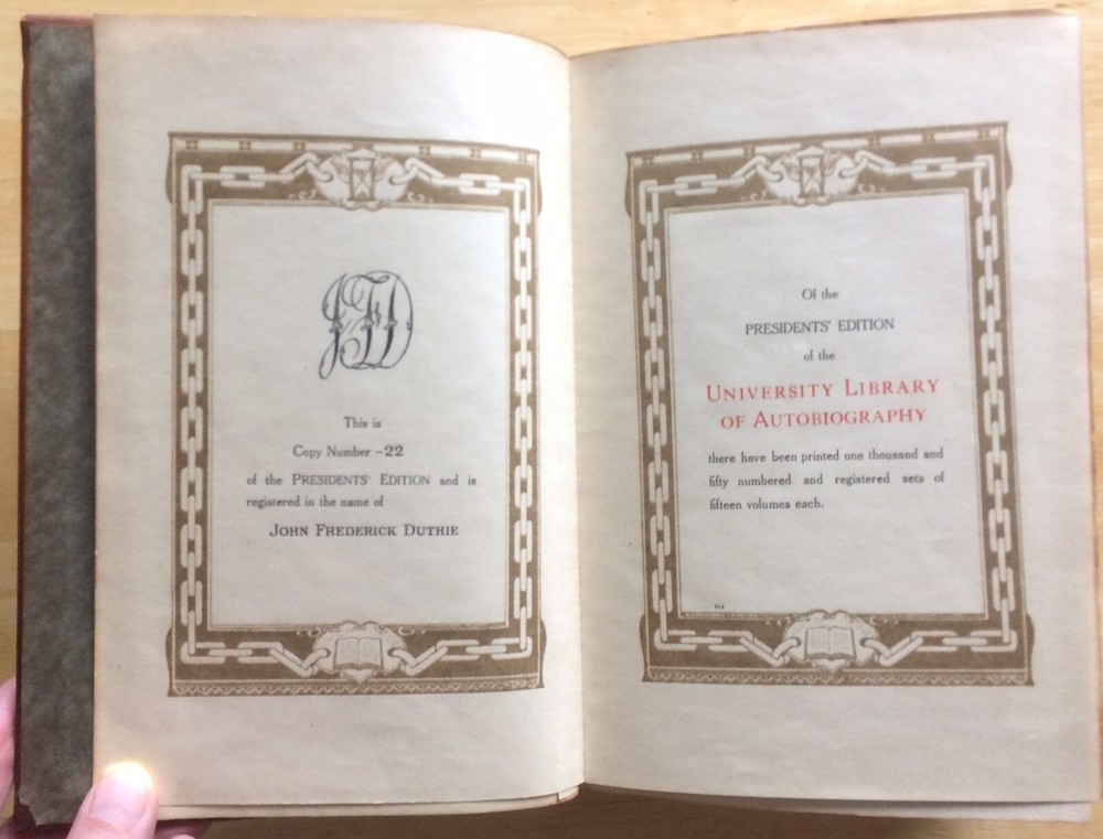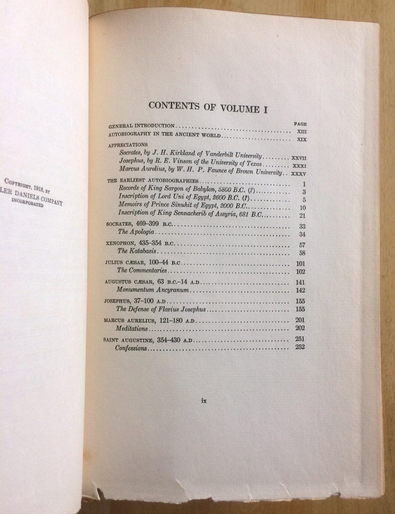 Found at an estate sale, this handsome leather-bound copy of Autobiography in the Ancient World, Volume 1 (F. Tyler Daniels, 1918) has unfortunately suffered a bit from the ravages of time (see photos). It’s copy 22 of the Presidents Edition and is registered in the name of John Frederick Duthie. One thousand and 50 numbered and registered sets of the original 15-volume Presidents Edition were published. Unfortunately this volume was the only one of the set at the estate sale. The colors of the embossed leather cover have faded and the top of the spine has torn (see photos). The binding is tight and since some of the pages have never been cut apart it appears that this book may never have been read. The pages are yellowed and the bottoms of the first few page are torn (see photos), perhaps due to a defect in printing. This volume covers the period 3800 B.C.E.-430 A.D. It begins with King Sargon and ends with Saint Augustine. The publisher is F. Tyler Daniels Company (New York). The Presidents Edition is part of the University Library of Autobiography. If you're dissatisfied with this book in any way, you can return it in the same condition in which you received it within 30 days for a full refund. Shipping will be by USPS Media Mail with no additional handling charge. Washington state residents pay 10% state and local sales tax.