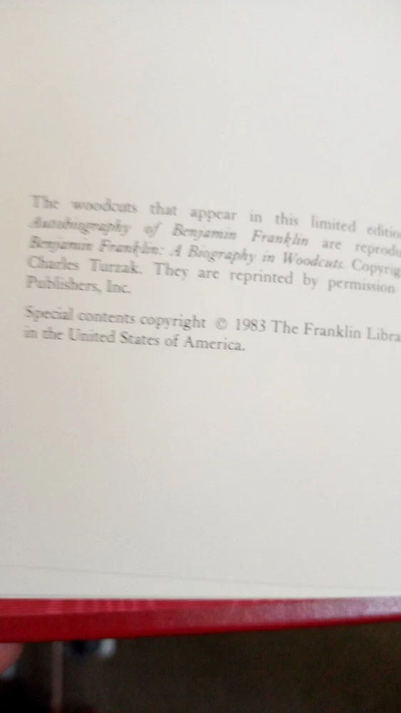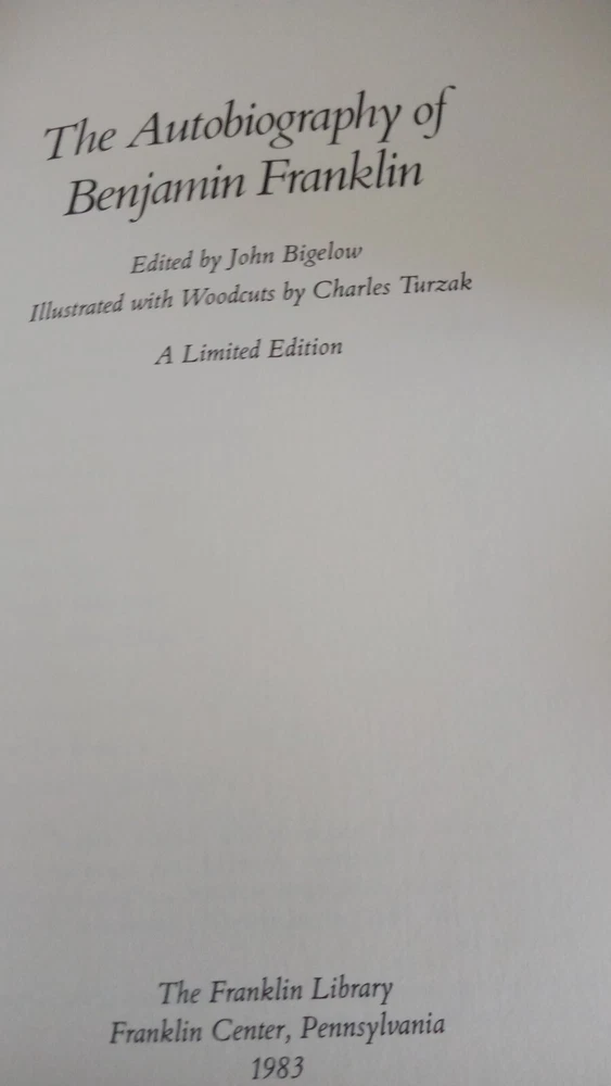 Autobiography of Benjamin Franklin,Franklin Library,Ltd Collection1983,good. no marks or wriitng in any of the pages except for the Library name where it was displyed for a while. will ship securely in a box