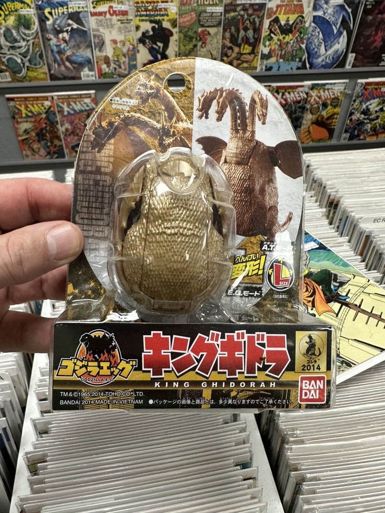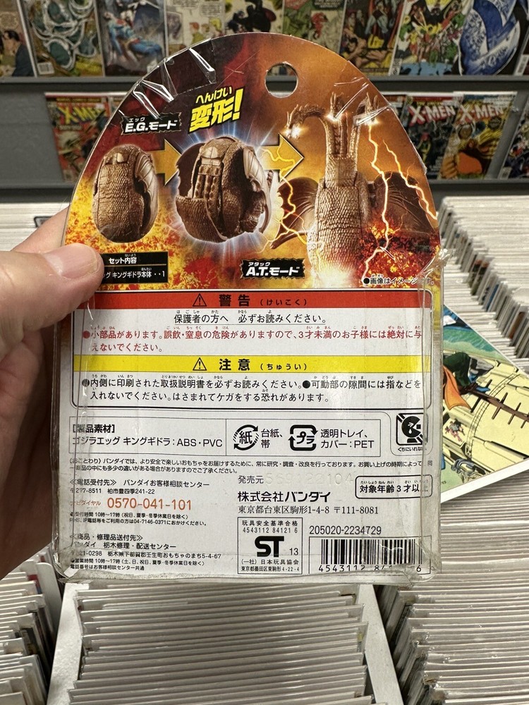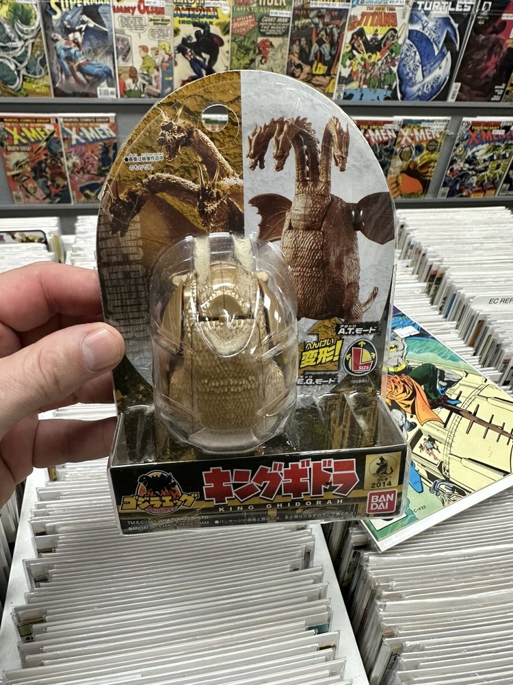 This is a Bandai King Ghidorah 2014 figure from the Transforming Egg Series, part of the Godzilla theme. The figure is from the year 2014 and comes in mint condition on card (MOC). King Ghidorah is a popular monster character from the Godzilla franchise, known for its three heads and powerful abilities. The transforming egg aspect likely refers to a unique feature of the figure, possibly transforming from an egg shape into the full King Ghidorah form, adding an interactive element to the toy.