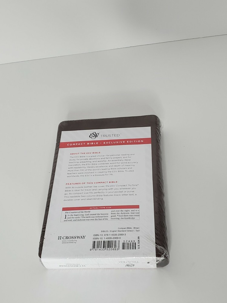 BIBLE ESV COMPACT BIBLE CROSSWAY TRUSTED BROWN. BRAND NEW. Size = 6 1/4 in. X 4 1/4 in. X 3/4 in....