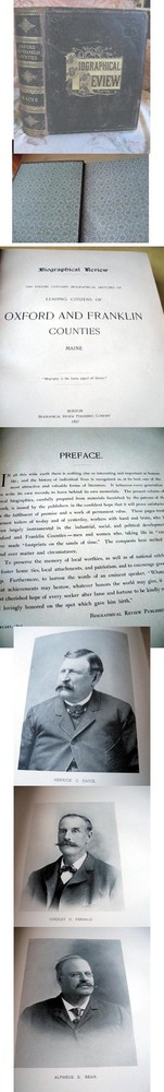 ENLARGED PICTURES!!! Please scroll ALL the way down to view LARGER images. bb897. Leading Citizens of Oxford & Franklin Counties, Maine in 1897. Many Portraits. Pub. Biographical Review Pub. Co., Boston, 1897. Quarto, 639 pages with index. Full leather. Bright gilt titles. All edges gilded. Very strong and square.....unusual in such a heavy book. Very Good condition. Please do not hesitate to e-mail with any questions. As Always, Satisfaction Guaranteed! PAYMENT: PayPal, because eBay requires sellers to list electronic payments exclusively. I expect to receive payment within 10 days, unless we have made other arrangements. MEDIA MAIL: The majority of my books are sent Media Mail to U.S. customers. I add $1.00 for shipping materials, etc. (The shipping price that you see at the top of the page includes the handling fee.) PRIORITY MAIL: I will send both Media cost and Priority cost with invoice, on books which seem to warrant Priority service or when buyer requests it. Tracking numbers will be included on purchases of $49.99 or more. I'm glad to combine multiple purchases in order to minimize shipping costs. I WILL SHIP INTERNATIONALLY, and I try to be as economical as possible with the shipping costs. Whenever a book will fit comfortably in a Priority Flat Rate Envelope, I'll send it this way for $14.00. RETURN POLICY: Satisfaction Guaranteed! Payment I accept the following forms of payment: PayPal Shipping & Handling I'm glad to combine multiple purchases for less expensive shipping costs. Please check eBay's Shipping & Payment tab USPS Media Mail® FREE scheduling, supersized images and templates. Get Vendio Sales Manager. FREE scheduling, supersized images and templates. Get Vendio Sales Manager. Over 100,000,000 served. Get FREE counters from Vendio today! Track Page Views With Auctiva's FREE Counter