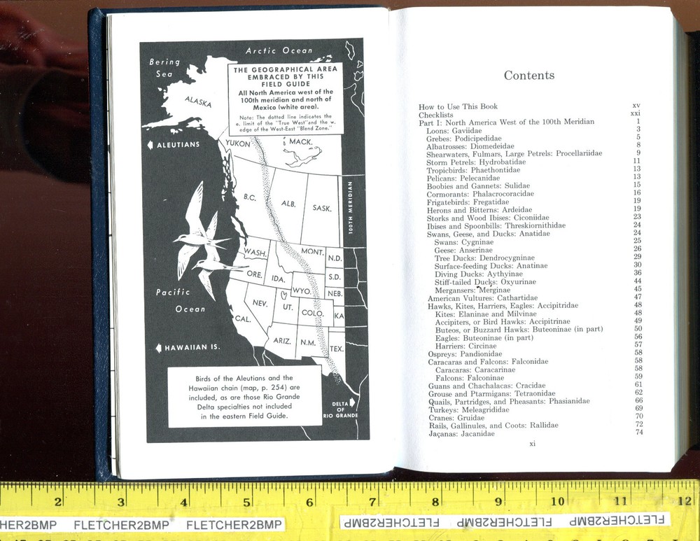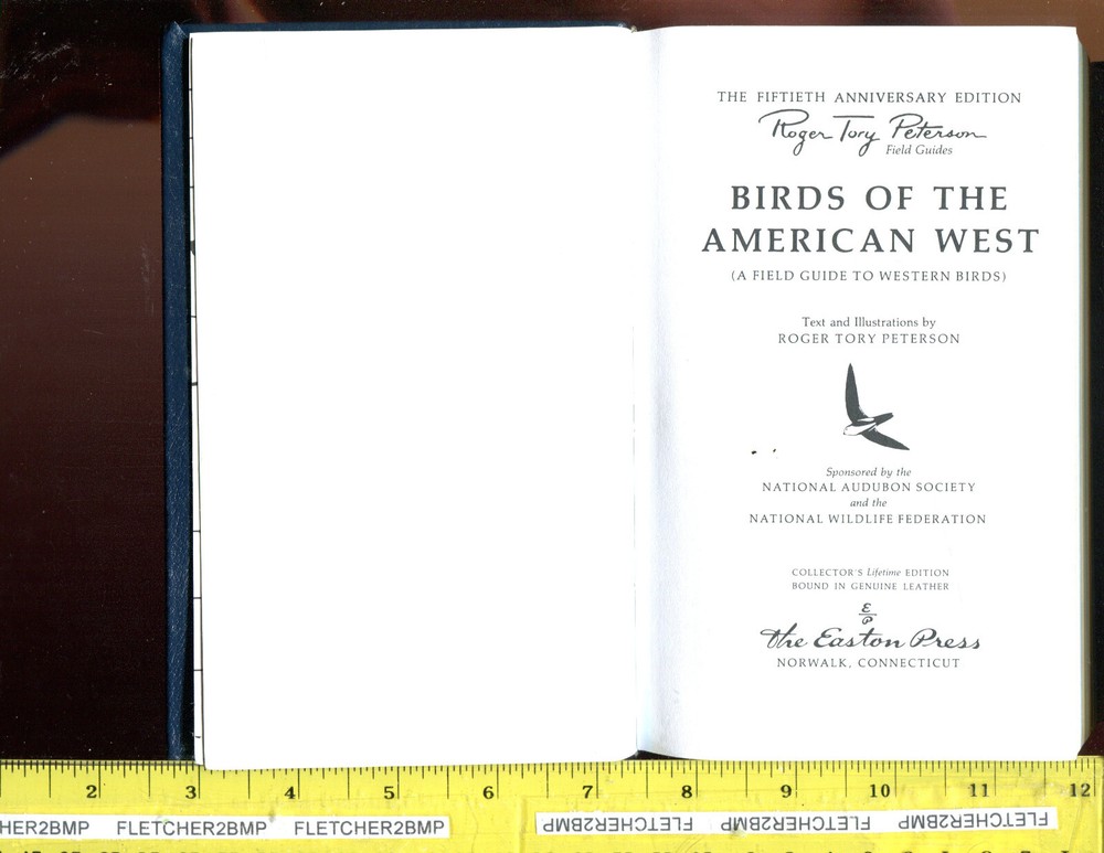 FREE shipping to any USA address - FREE media postage - FREE tracking - BIRDS OF THE AMERICAN WEST - A Field Guide to Western Birds - Fiftieth Anniversary Edition - by Roger Tory Peterson - Text and Illustration by Peterson - Collector's Lifetime Edition - Bound in Genuine Leather - Easton Press - numerous b/w and color illustrations, etc, throughout text - Typical Easton Press Quality - Bound in full dark blue LEATHER with extensive gilt decoration on front, and spine - Moire end-papers - Accented in 22kt gold, printed on archival paper with gilded edges, smyth sewing and concealed muslin joints, bound ribbon marker - BOOK COVERS, SPINE, EDGES, CORNERS, ETC, ALL VERY GOOD CONDITION - 'EXCEPT' EX-OWNERS BOOKPLATE, STAMPED, AND ATTACHED TO FRONT END-PAPER - ALL INTERIOR PAGES LIKE NEW CONDITION - BOOK APPEARS UNREAD - book approx 4 3/4" x 7 1/2" x 309 pages - Pub: Easton Press, CT - 1984 - printed in the USA - NOTE: a number of other title's of Peterson's Field Guides are also offered on this auction - Remember: FREE shipping to any USA address - FREE media postage - FREE tracking