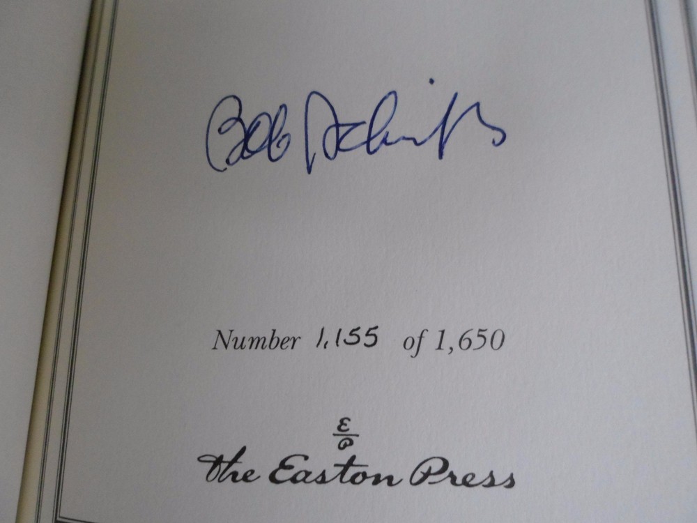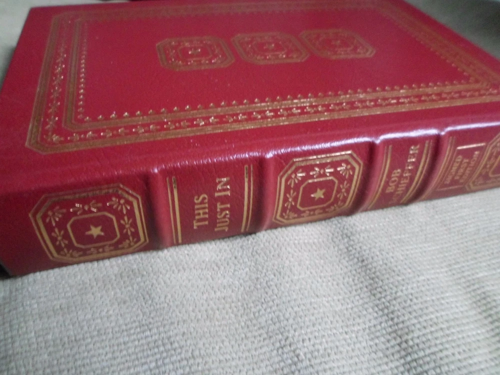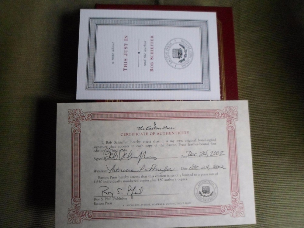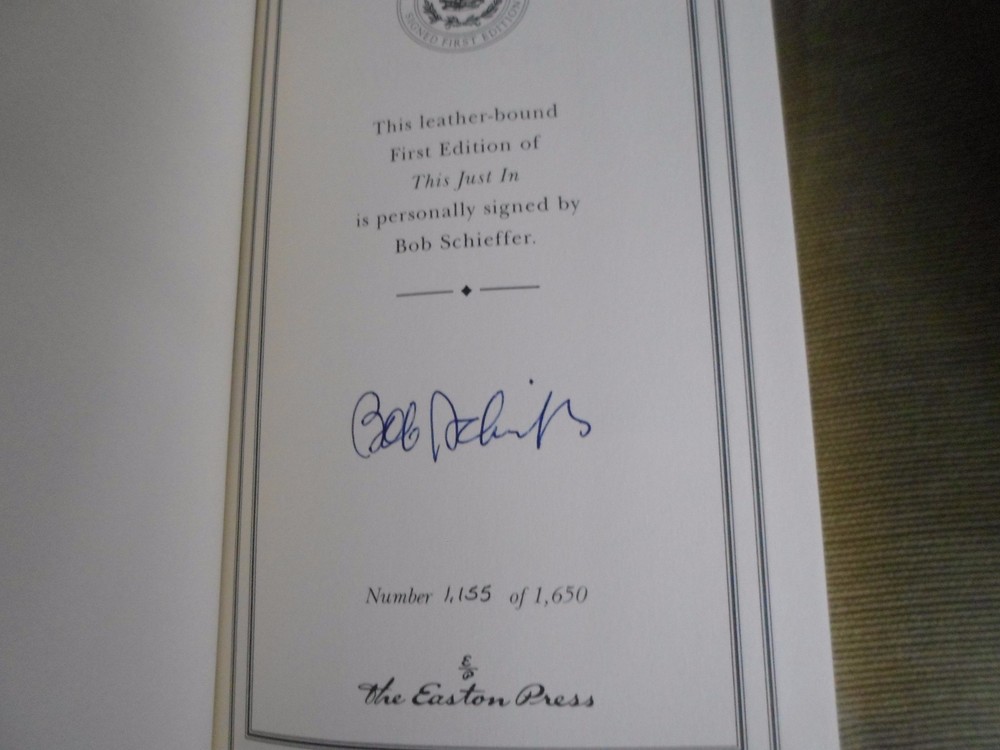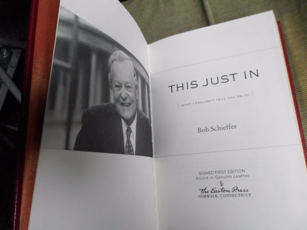 This is a leather bound signed numbered first edition of Bob Schieffer's best seller - "This Just In - What I Couldn't Tell You On TV" . Bob Schieffer started his reporting career in Texas when he was barely old enough to buy a beer, joined CBS News in 1969, and became one of the few correspondents ever to have covered all four major Washington beats: the White House, the Pentagon, the State Department, and Capitol Hill. Over the past four decades, he's seen it all-and now he's sharing the after-hours tales only his colleagues know. The book is unread and in great condition. Signed by the author on the limitation page, this is book number 1155 one of only 1650 numbered copies ever printed. The signed and dated certificate of authenticity and the publisher's note card are also included. Easton Press books are the golden standard in the publishing industry, highly collectible and lasting generations. Easton Press Full Genuine Leather Dubbed Spine Accented Wit 22 kt. Real Gold Satin Ribbon Page Marker Distinctive Cover Design Gilded Page Edges To Protect Against Humidity High Quality Acid - Free paper Smyth-Sewn Pages Silk-Moire Endleaves I combine multiple items for savings on shipping charges. I ship worldwide. Please ask about international shipping charges and/or different shipping options. Thank you!