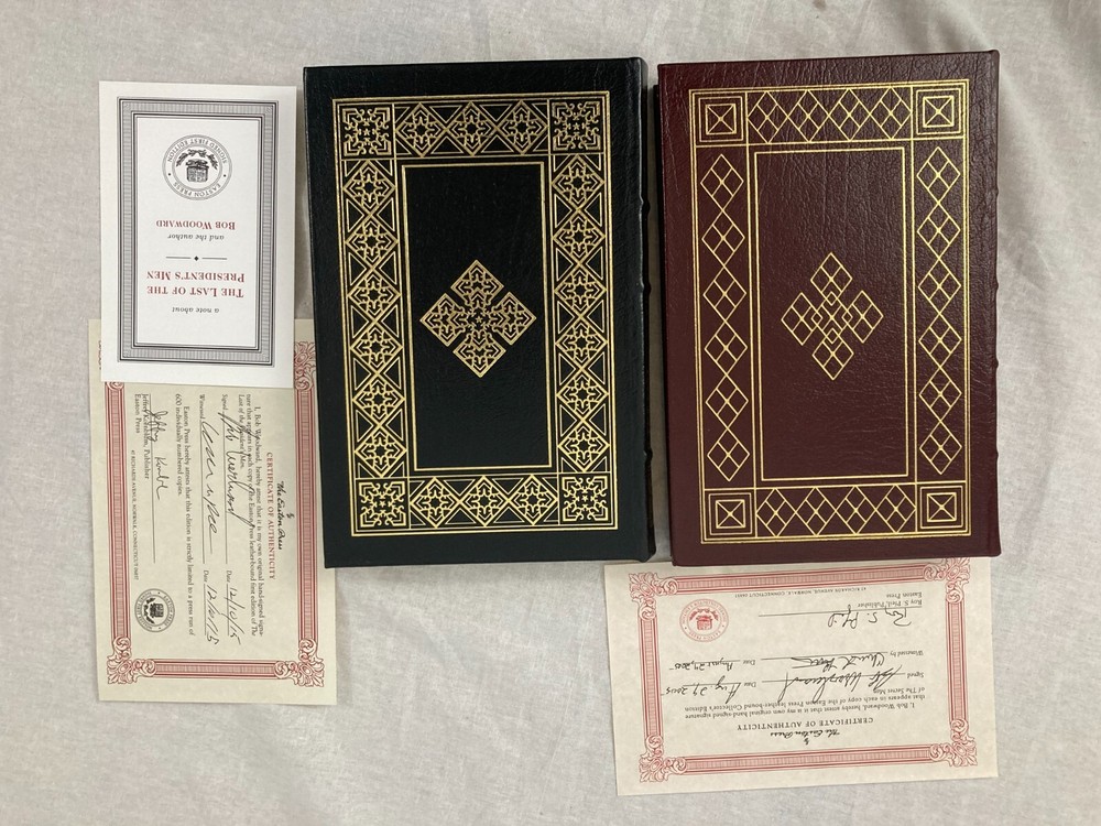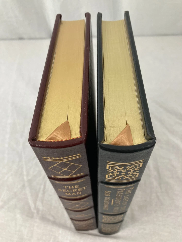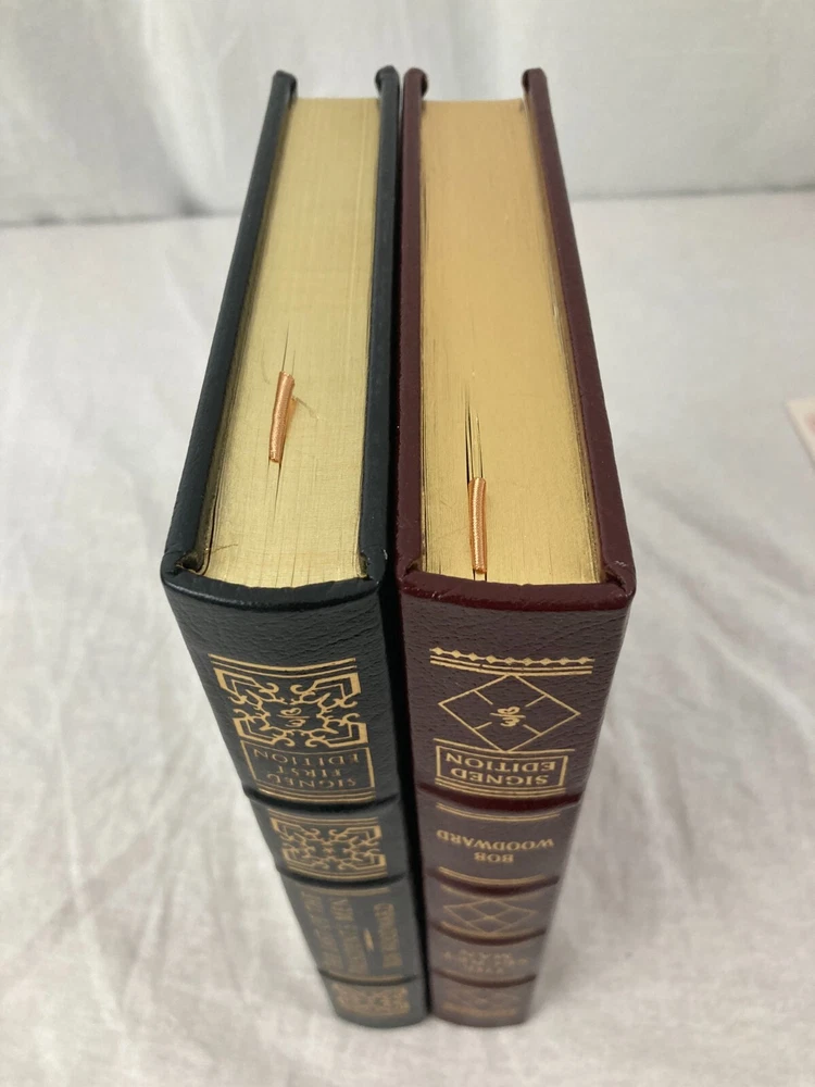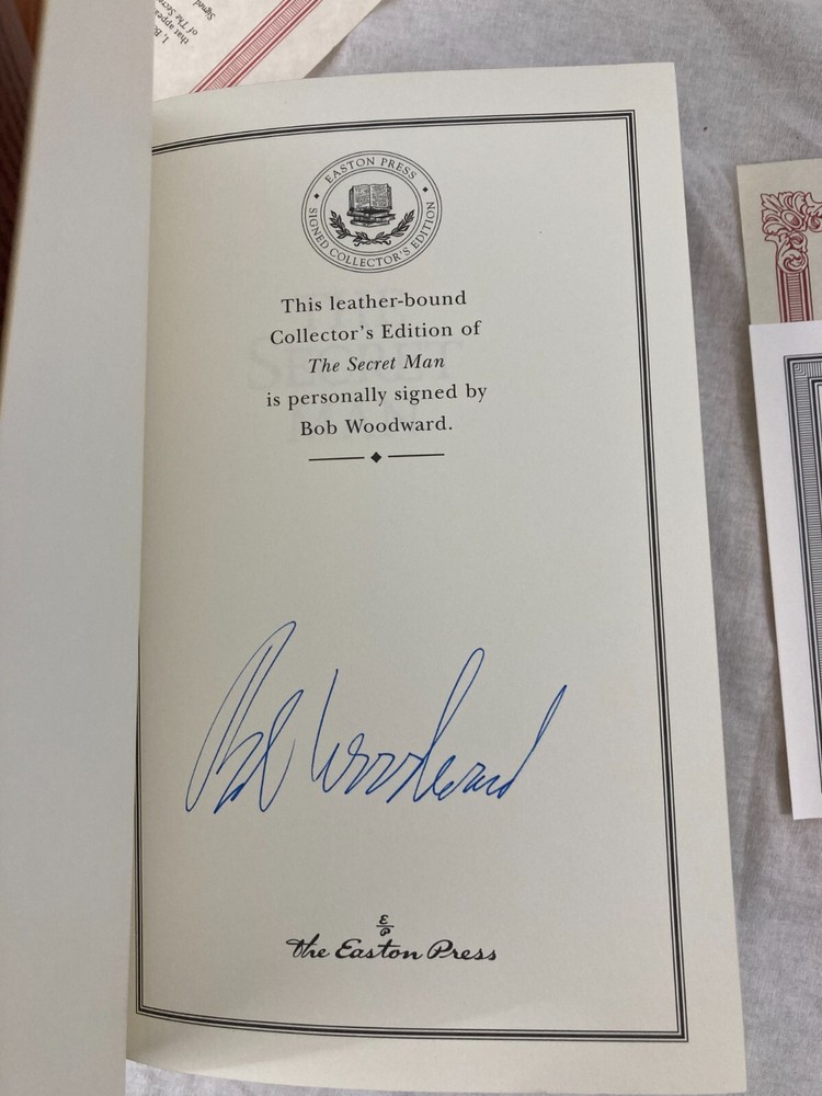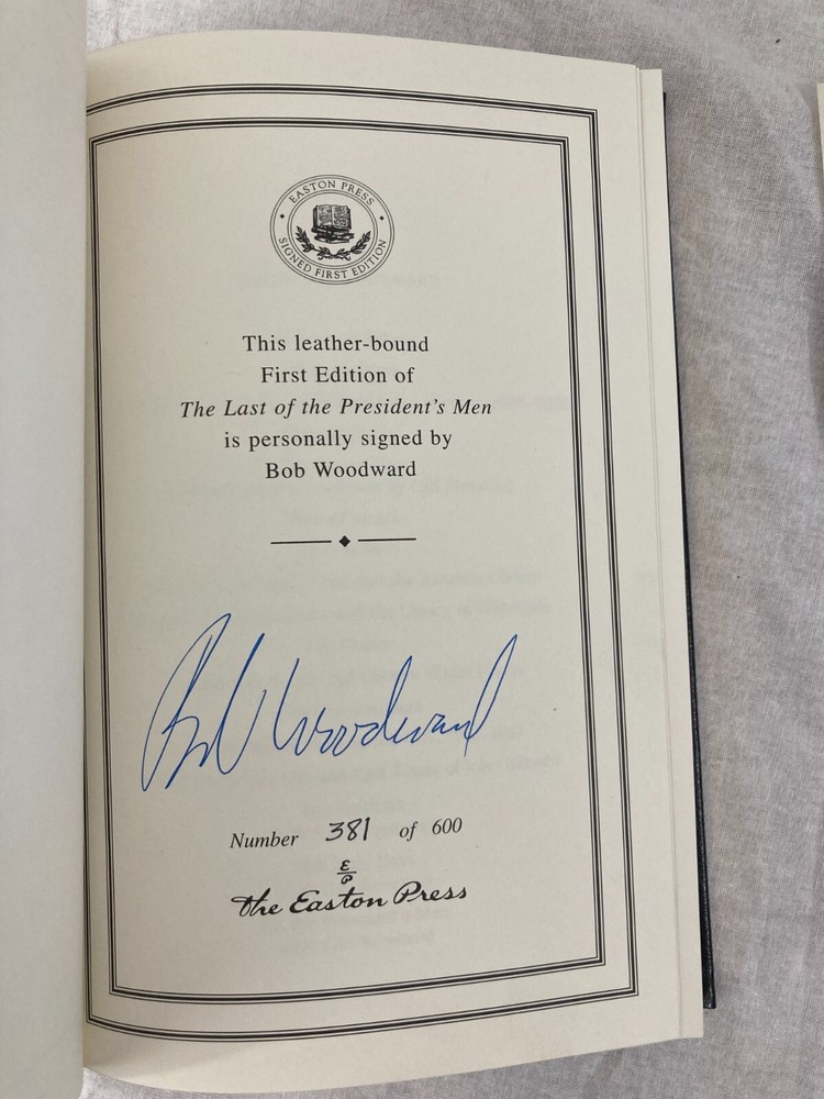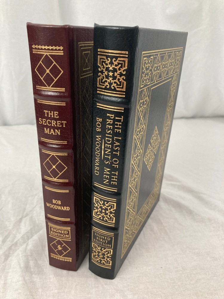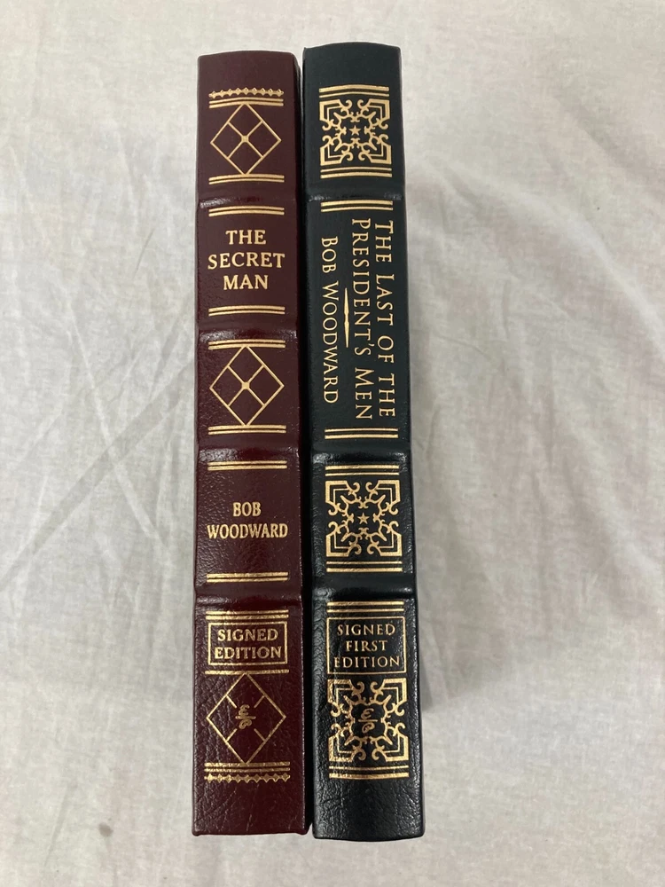 WRITIER/ARTIST : Bob Woodward (Geneva, Illinois, Washington, D.C. b. 1943)( TITLE : The Last of the President's Men, Easton Press, 2015, & The Secret Man, Easton Press, 2005 PUBLISHER : Easton Press DESCRIPTION : For sale are two signed, limited edition books by journalist Bob Woodward, The Secret Man and The Last of the President's Men both published by Easton Press. Both are signed leather-bound limited editions. The Last of the President's Men is number 381 of only 600 printed. CONDITION : Both books are in near-fine condition with minor wear to the board edges, see photos. No internal markings other than Woodward's signatures. No previous owner's bookplate. The spine and boards are square and straight. The book's gilt page edges are in near-fine condition with some scratches and wear, see photos. Let me know if you have any questions. Don't forget to take a look at my other signed, limited edition books and prints for sale. Thank you