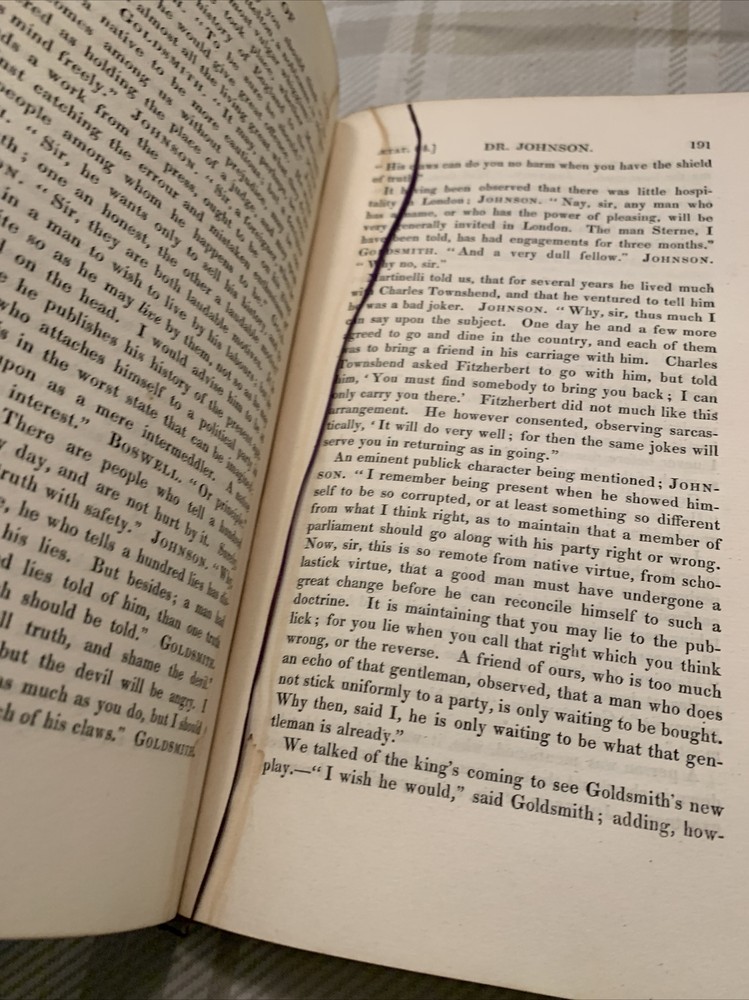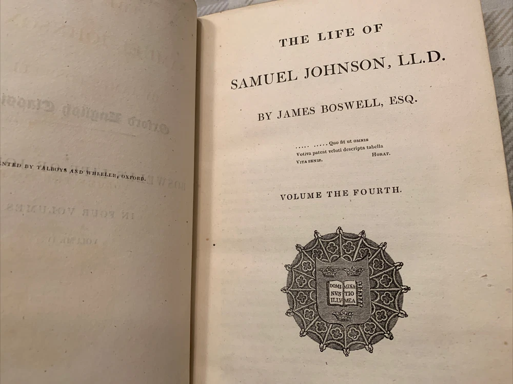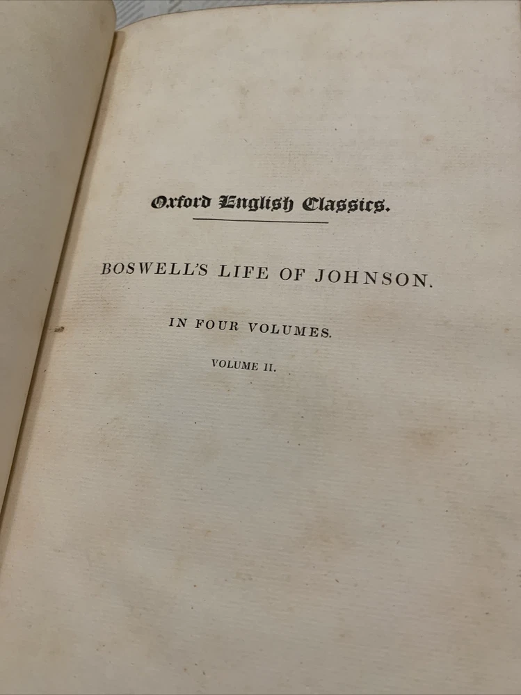 BOSWELL’S THE LIFE OF SAMUEL JOHNSON VOL II & IV- 1826. Oxford English Classics-. Both books are in very good condition for its age. Pages seem clean with very minor soiling on both. Minor soiling left from bookmark on one page and previous owner name written in pencil on first blank page. Soiling stains on both books on first few blank pages. Some notes written in pencil on last blank page. See pics. Shipped with USPS Media Mail.