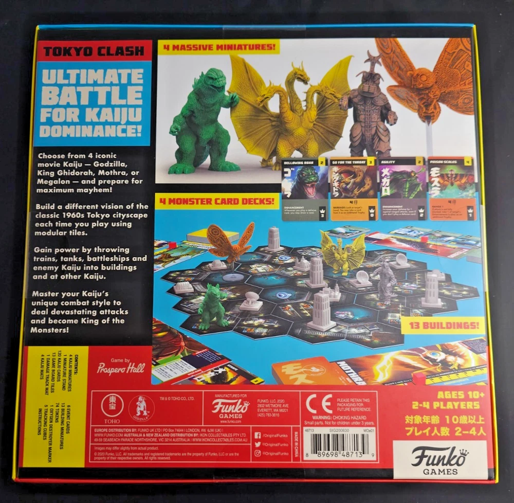 Funko Games: Godzilla Tokyo Clash Board Game In Godzilla: Tokyo Clash, you play as the Earth's most fearsome Kaiju — Godzilla, Mothra, King Ghidorah, and Megalon — battling for dominance as the most terrifying monster in Japan. With detailed miniatures of the legendary monsters and a modular cityscape of 3D buildings to destroy, it's an epic battle every time you play! In more detail, each player has their own deck of cards unique to the kaiju they control. As you throw trains and tanks at the opponents and attack them directly to cause damage, you can burn cards out of their deck, reducing their options on future turns. As you stomp through the city, you can earn energy, which can help you lay out permanent enhancements to your abilities. The Godzilla Tokyo Clash Strategy Board Game Includes: 4 Kaiju Miniatures 1 Miniature Stand 120 Kaiju Cards 13 Game Board Tiles 1 Damage Track Mat 4 Kaiju Matas 6 Event Cards 13 Building Miniatures 74 Tokens 1 Oxygen Destroyer Marker 5 Tracking Cubes Instruction Manual Contact Us Please feel free to contact us with any questions or concerns through eBay messages. We strive to respond within 6-8 hours and will always do everything we can to accommodate you! Shipping: We strive to ship all order with a two-day handling time. If your order requires more time to ship, we will reach out and provide accommodations. Returns: Product: We offer 30-day returns for unopened product. All products sold are in sealed and mint condition. We will not ship out damaged product.