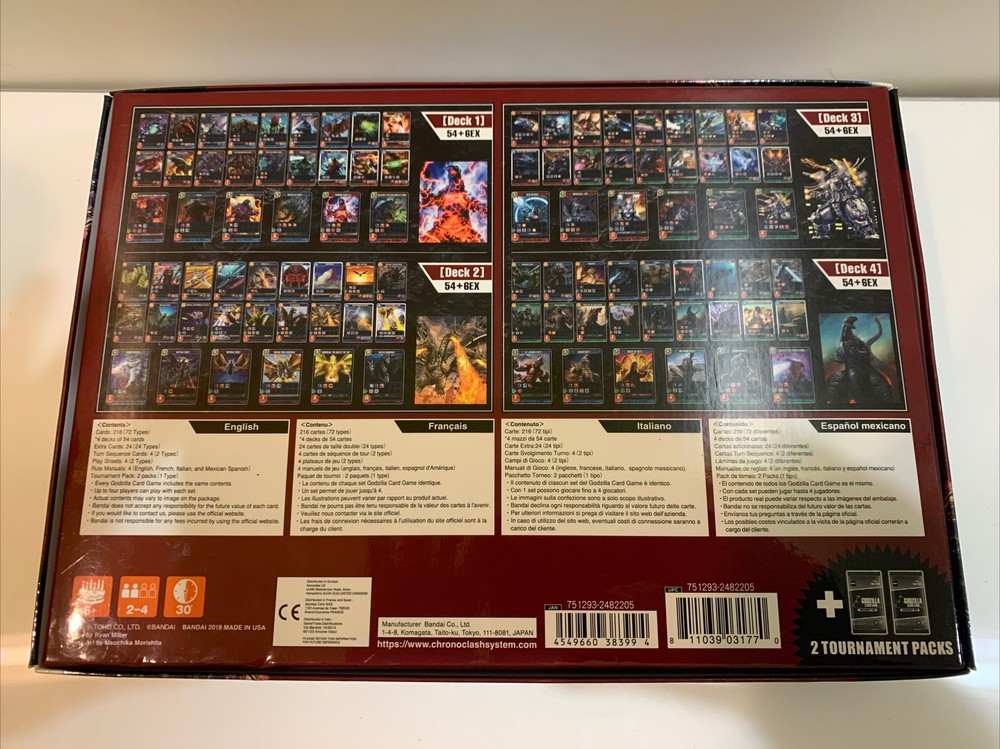 Take your card game experience to the next level with the Bandai Godzilla Card Game Chrono Clash System. This deck of 240 cards is perfect for tournament play or casual gaming with friends. Each card is made of durable card stock material and features the iconic Godzilla character in an Archetype that will help you dominate your opponents. The set includes four decks with standard sized cards and a tournament playmat, all manufactured by Bandai in Japan. Whether you're a fan of collectible card games or just a fan of the Godzilla franchise, this game is suitable for players aged 8 and above. So gather your friends, unleash your inner gamer, and get ready for an epic battle of the Titans!