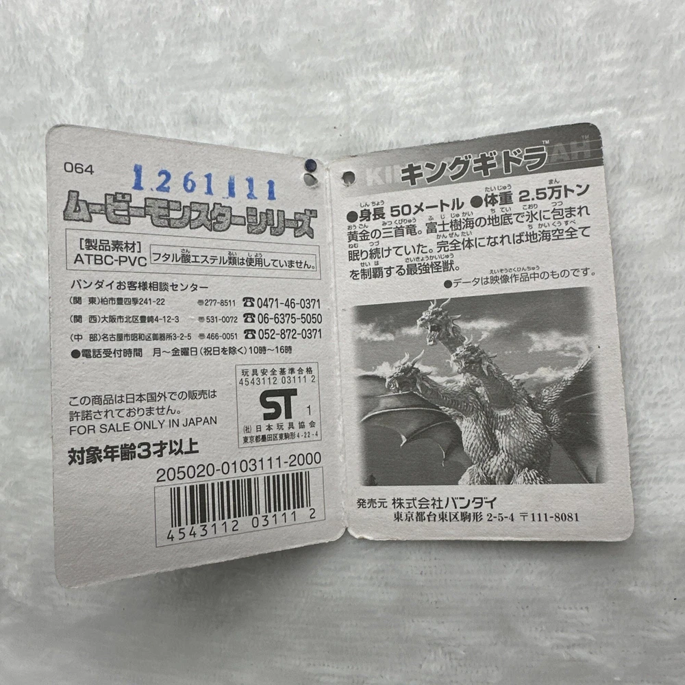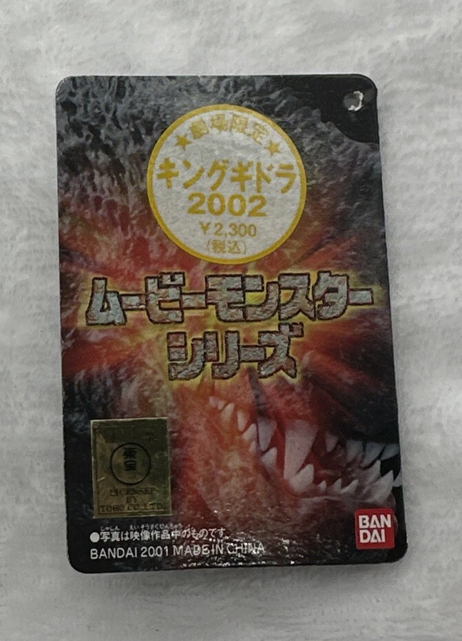 FIGURE CARD ONLY… This limited edition Bandai Movie Monster Series figure features The King of the Monsters, Godzilla, Mothra, and King Ghidorah. The figure is accompanied by a tag, which is heavily damaged. Measuring 13.78 x 16.54 x 7.09in (350 x 420 x 180mm) and weighing 11.29oz (0.705lb 320g), this item is a must-have for fans of monster movies. With a theme of movies and a franchise of monsters, this figure captures the essence of the genre. The 2002 year of manufacture adds to the collectability of this item. Don't miss your chance to own this Bandai Movie Monster Series King Ghidorah 2002 theater limited CARD ONLY.