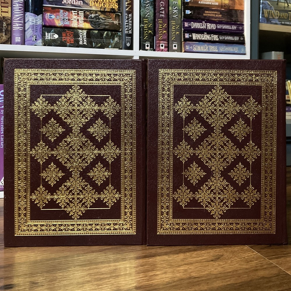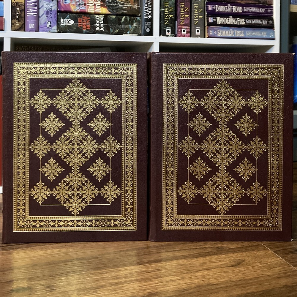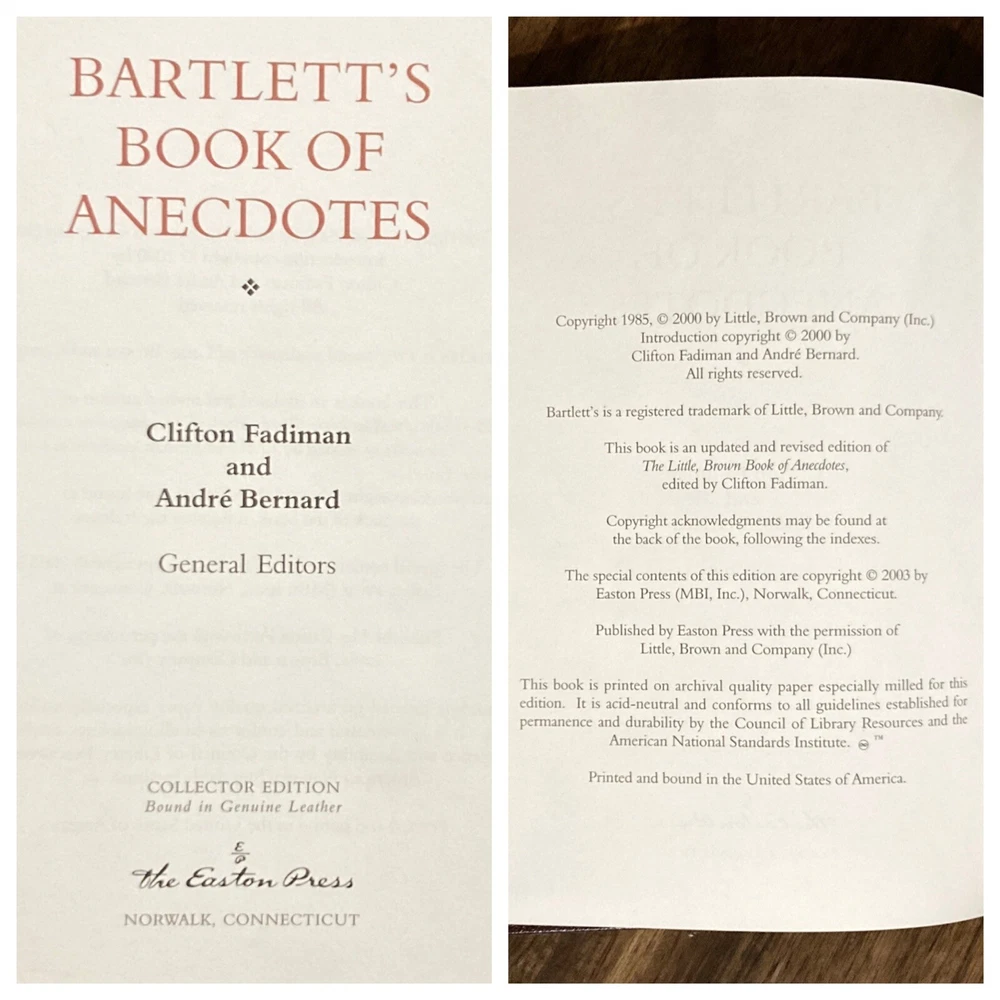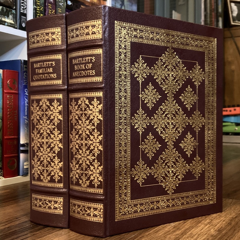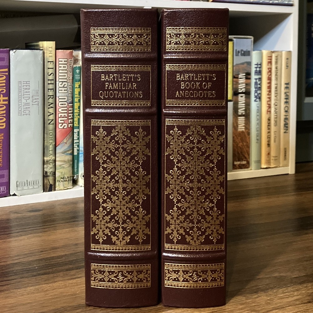 Collector’s edition leatherbound hardcover set of Bartlett’s Familiar Quotations & Bartlett’s Book of Anecdotes by John Bartlett (Easton Press, 2003). Beautiful special edition set of these classic literary companions. Burgundy leather bound boards with gilt lettering and design, decorative endpapers, gilt page edges and attached tassel ribbon bookmarks. Some mild shelf wear to covers, mostly to corners. Faint scuffing to gilt page edges. Binding material slightly visible in a few gutters near beginning/end of books, as is common with books of this size published by Easton. Spines remain straight and binding firm. All pages clean and unmarked. See photos for condition. Packaged with care and shipped via USPS Media Mail
