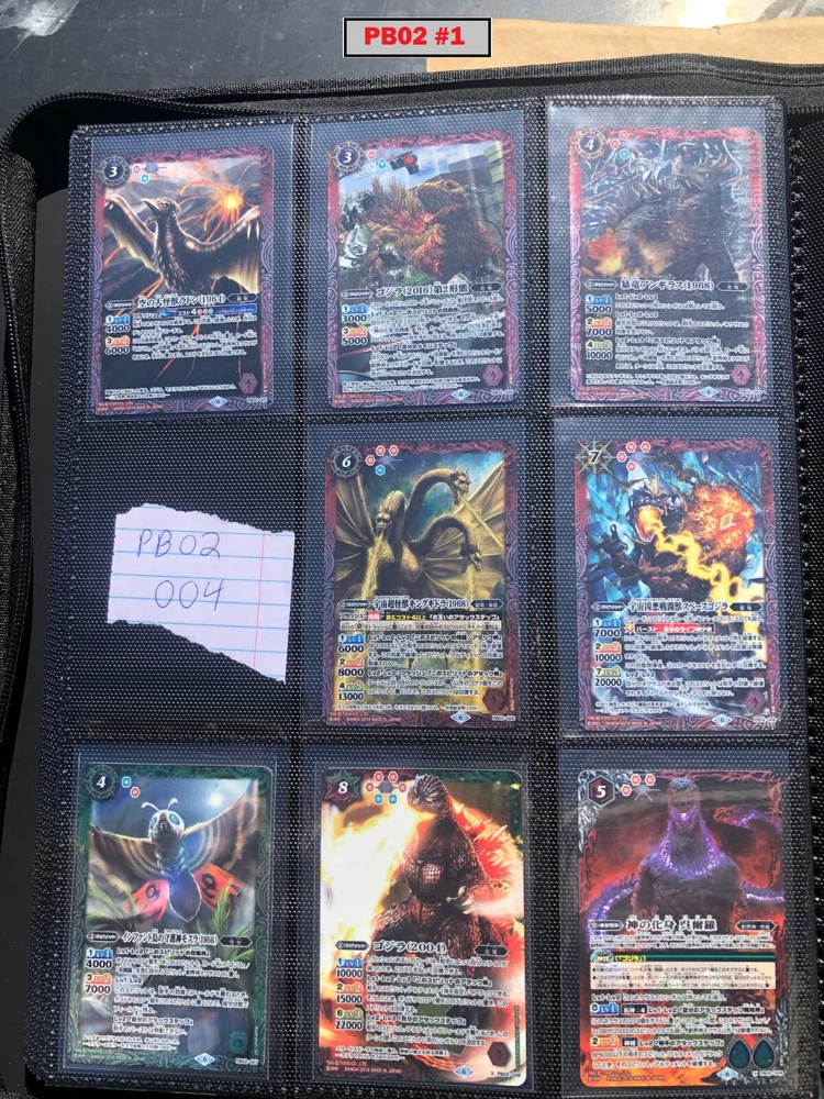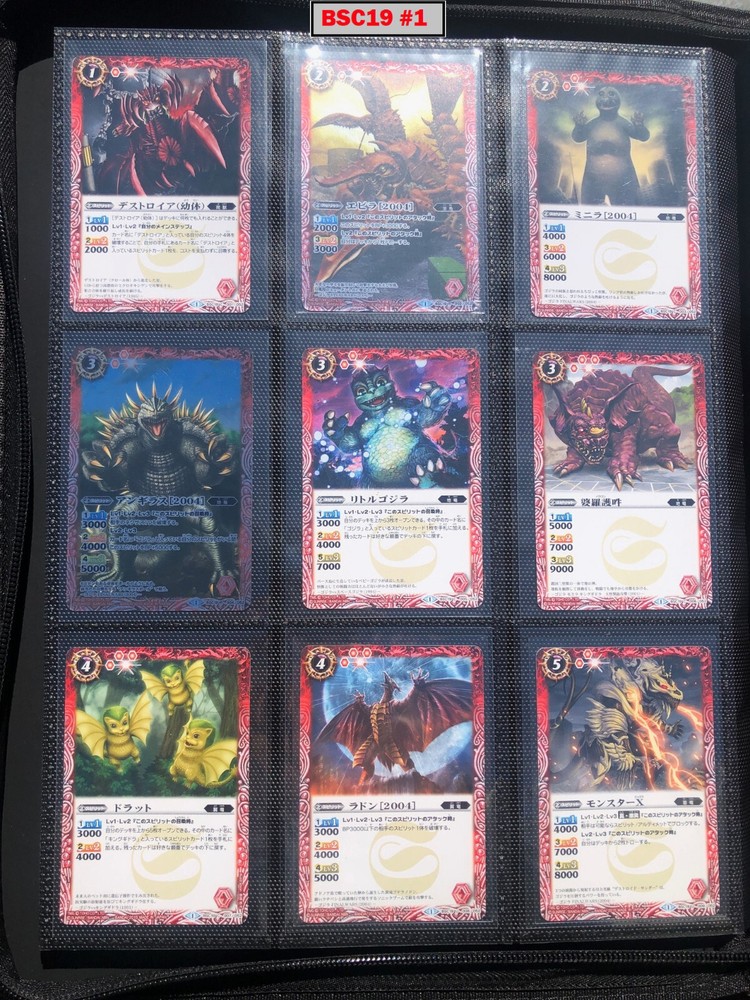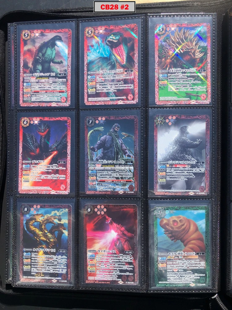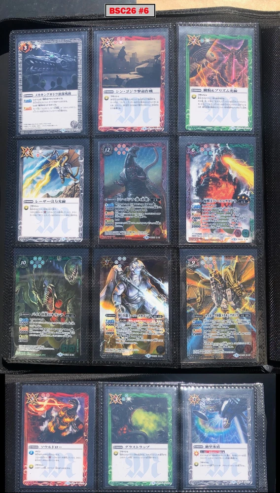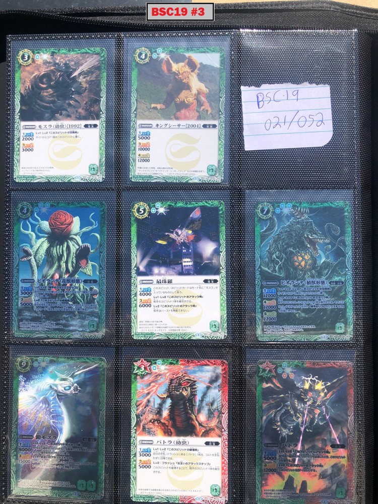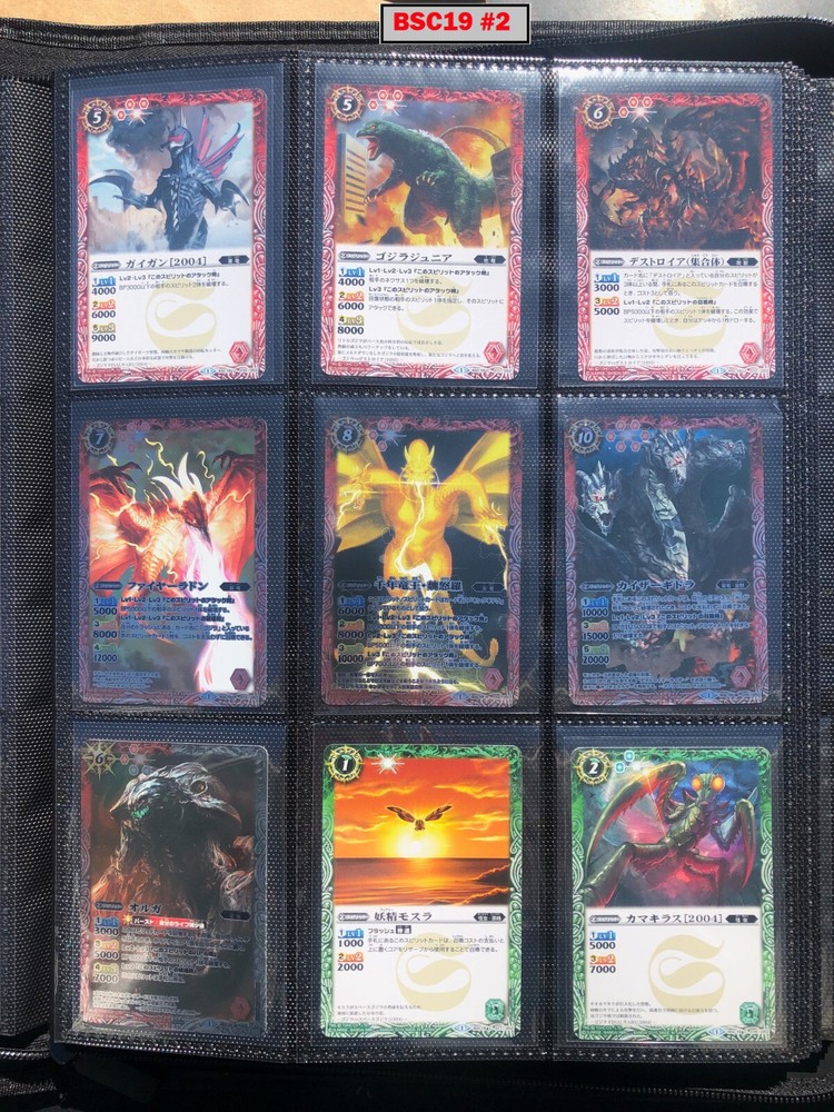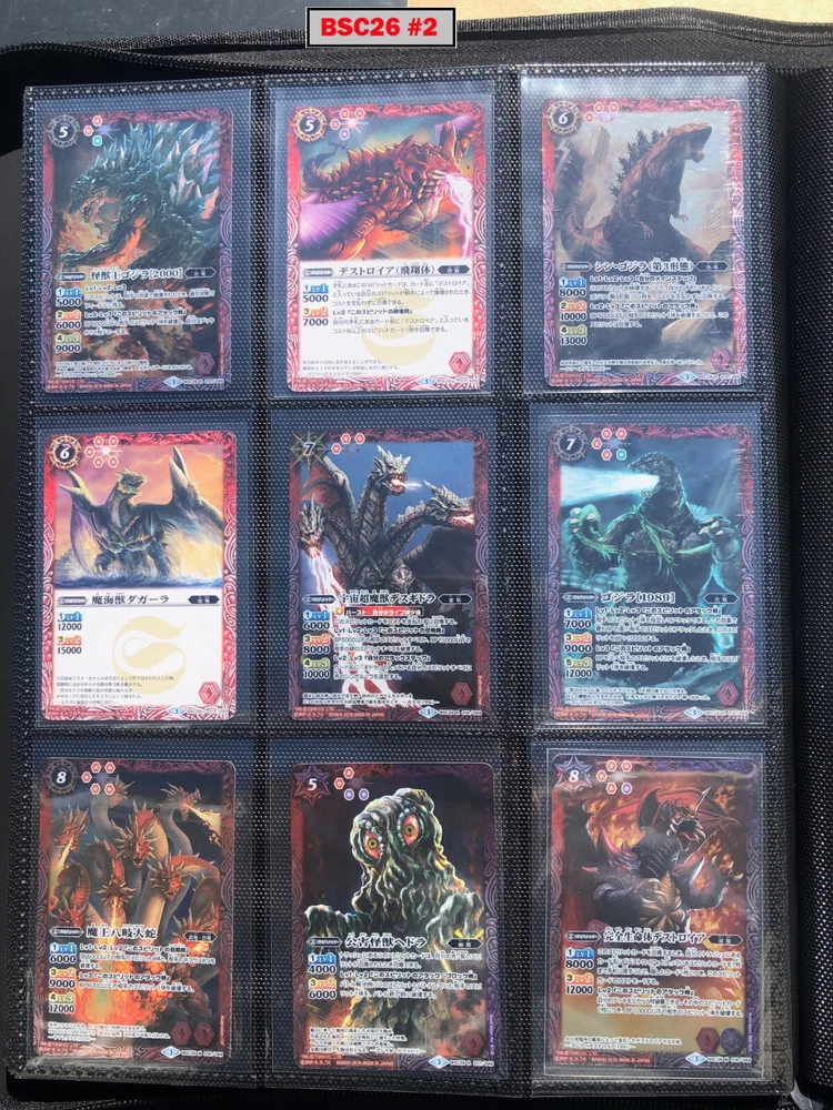 This is a collection of amazing Battle Spirits Japanese Godzilla cards from all 5 Godzilla Japan-only releases. The original set: BSC19 - Toho Kaiju's Great Battle released in 2015. The Kaiju included are from the original Toho Godzilla movies through Godzilla: Final Wars and the Rebirth of Motha trilogy. The follow up: BSC26 - Roar of the King of Kaiju released in 2016. The Kaiju in this release are from the Toho Godzilla films through Shin Godzilla, War of the Gargantua, Manango, Orochi and The Mysterians. A small set within a set: LM18G - Kaiju King Premium Card Set released 2018. This small set is 7 Godzilla cards. The fourth set: PB02 - Destroy All Toho Kaiju released 2019. This small set includes Kaiju from the Toho Godzilla films through Shin Godzilla. The final, most recent and largest by far: CB28 - Godzilla - Return of the Kaiju King released 2023. The Kaiju in this release are from the Toho Godzilla films through Shin Godzilla and the Netflix shows Godzilla: Singularity Point and the Anime Trilogy that started with Godzilla: Planet of the Monsters. This collection is nearly complete, including 200 of 213 cards in total. All the cards are in near-Mint condition. Its the perfect addition to any Godzilla fans collection. Free US Shipping Below is a summary of what is included in each set and below that is a detailed breakdown of what's included: Set Category Included Set Total CB28 Collaboration Booster: Godzilla - Return of the Kaiju King 73 74 BSC19 Collaboration Booster: Toho Kaiju's Great Battle 53 57 BSC26 Collaboration Booster: Roar of the King of Kaiju 56 57 PB02 Collaboration Starter: Destroy All Toho Kaiju 13 18 LM18G Battle Spirits Kaiju King Premium Card Set 5 7 BSC19 - Collaboration Booster: Toho Kaiju's Great Battle (Released 2015) The set has a total of 57 New cards (18 Commons, 15 Uncommons, 12 Rares, 7 Master Rares, and 5 X-Rares.) Included Card # Name Type Rarity Yes BSC19-001 Destoroyah (Juvenile Form) Standard Common Yes BSC19-002 Ebirah [2004] Standard Rare Yes BSC19-003 Minilla [2004] Standard Common Yes BSC19-004 Anguirus [2004] Standard Rare Yes BSC19-005 Little Godzilla Standard Common Yes BSC19-006 Baragon Standard Common Yes BSC19-007 Dorat Standard Common Yes BSC19-008 Rodan [2004] Standard Uncommon Yes BSC19-009 Monster X Standard Uncommon Yes BSC19-010 Gigan [2004] Standard Uncommon Yes BSC19-011 Godzilla Junior Standard Common Yes BSC19-012 Destoroyah (Aggregate Form) Standard Uncommon Yes BSC19-013 Fire Rodan Standard Master Rare Yes BSC19-014 Thousand Year Dragon King Ghidorah Standard Rare Yes BSC19-015 Keizer Ghidorah Standard Master Rare Yes BSC19-016 Orga Standard Master Rare Yes BSC19-017 Fairy Mothra Standard Common Yes BSC19-018 Kamacuras [2004] Standard Common Yes BSC19-019 Mothra (Larva Form) [1992] Standard Common Yes BSC19-020 King Caesar [2004] Standard Common MISSING BSC19-021 Megaguirus Standard Master Rare Yes BSC19-022 Biollante (Flower Beast Form) Standard Rare Yes BSC19-023 Mothra Standard Uncommon Yes BSC19-024 Biollante (Plant Beast Form) Standard Master Rare Yes BSC19-025 Armor Mothra Standard Master Rare Yes BSC19-026 Battra (Larva Form) Standard Common Yes BSC19-027 Battra Standard Master Rare Yes BSC19-028 Land Moguera Standard Common Yes BSC19-029 Star Falcon Standard Common Yes BSC19-030 Super X3 Standard Uncommon Yes BSC19-031 MOGUERA Standard Common Yes BSC19-032 MechaGodzilla [1974] Standard Common Yes BSC19-033 Jet Jaguar [1973] Standard Uncommon Yes BSC19-034 New Gotengo Standard Rare Yes BSC19-035 MechaGodzilla [1993] Standard Rare Yes BSC19-036 Modified Gigan [2004] Standard Uncommon Yes BSC19-037 Type-3 Kiryu Standard Master Rare Yes BSC19-038 Mecha-King Ghidorah Standard Rare Yes BSC19-039 Garuda Standard Common MISSING BSC19-040 The Crystal Zone Standard Common Yes BSC19-041 Planet Gorath Standard Uncommon Yes BSC19-042 The Time of Awakening Standard Uncommon Yes BSC19-043 The Infant Island Standard Common MISSING BSC19-044 The MechaGodzilla Hangar Standard Uncommon Yes BSC19-045 The G Summit Standard Common Yes BSC19-046 Gravity Beam Standard Uncommon Yes BSC19-047 Oxygen Destroyer Standard Rare Yes BSC19-048 Mothra's Emergence Standard Rare Yes BSC19-049 Mothra's Song Standard Uncommon MISSING BSC19-050 Shintoshin Collapse Standard Uncommon Yes BSC19-051 Type-3 Absolute Zero Cannon Standard Rare Yes BSC19-052 All Arms Attack Standard Rare Yes BSC19-X01 King Ghidorah [1991] Standard X-Rare Yes BSC19-X02 Space Godzilla Standard X-Rare Yes BSC19-X03 Destoroyah (Final Form) Standard X-Rare Yes BSC19-X04 Mothra [1992] Standard X-Rare Yes BSC19-X05 Modified Type-3 Kiryu Standard X-Rare BSC26 - Collaboration Booster: Roar of the King of Kaiju (Released 2016) The set has a total of 54 New + 3 Reprint cards (31 Commons, 2 Uncommons, 12 Rares, 7 Master Rares, and 5 X-Rares.) Included Card # Name Type Rarity Yes BSC26-001 The SeaDragon Manda Standard Common Yes BSC26-002 Shin-Godzilla (First Form) Standard Common Yes BSC26-003 Godzilla [1954] Standard Common MISSING BSC26-004 Godzilla [1965] Standard Rare Yes BSC26-005 Shin-Godzilla (Second Form) Standard Common Yes BSC26-006 The God of Destruction Space Godzilla Standard Common Yes BSC26-007 Godzilla [1971] Standard Common Yes BSC26-008 The Sky Giant Kaiju Rodan Standard Common Yes BSC26-009 The Space Super Kaiju King Ghidorah Standard Common Yes BSC26-010 The Kaiju King Godzilla [2000] Standard Rare Yes BSC26-011 Destoroyah (Flying Form) Standard Common Yes BSC26-012 Shin-Godzilla (Third Form) Standard Rare Yes BSC26-013 The Demonic Aqua Beast Dagahra Standard Common Yes BSC26-014 The Space Super Demonic Beast Desghidorah Standard Rare Yes BSC26-015 Godzilla [1989] Standard Rare Yes BSC26-016 The Demon King Yamata-no-Orochi Standard Master Rare Yes BSC26-017 The Smog Kaiju Hedorah Standard Rare Yes BSC26-018 The Complete Lifeform Destoroyah Standard Master Rare Yes BSC26-019 The Cyborg Kaiju Gigan Standard Master Rare Yes BSC26-020 Matango Standard Common Yes BSC26-021 