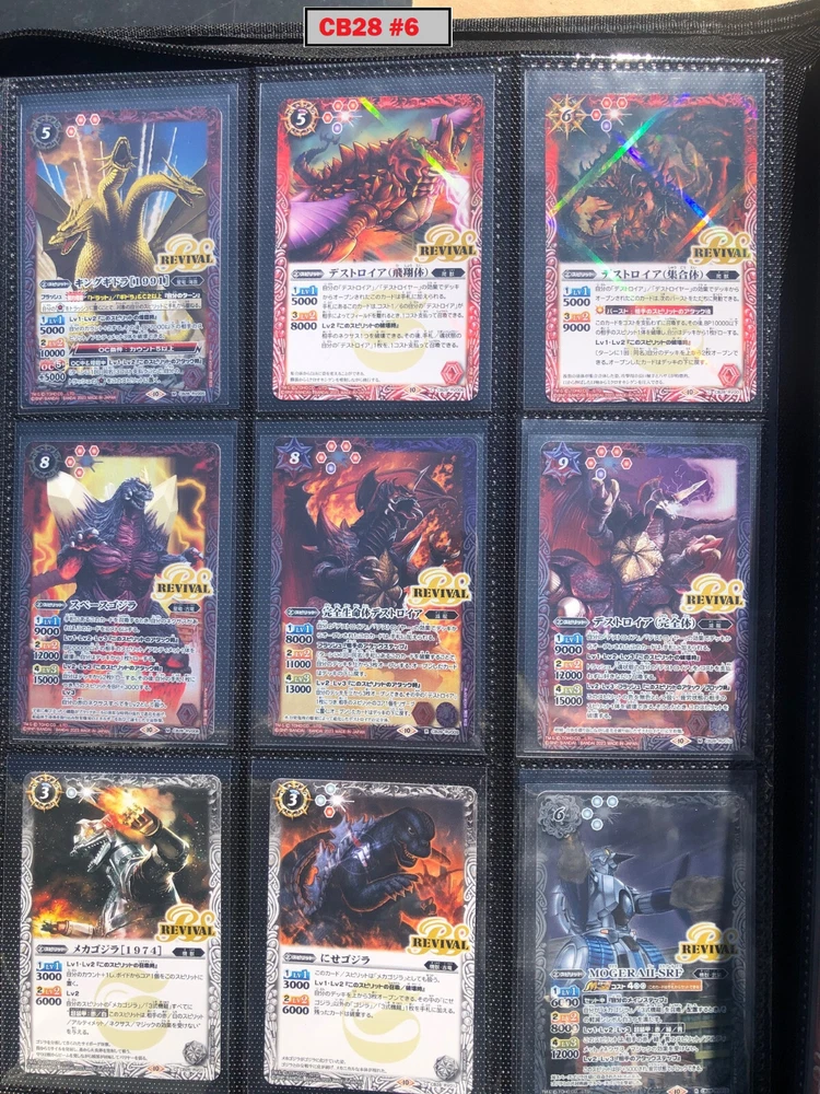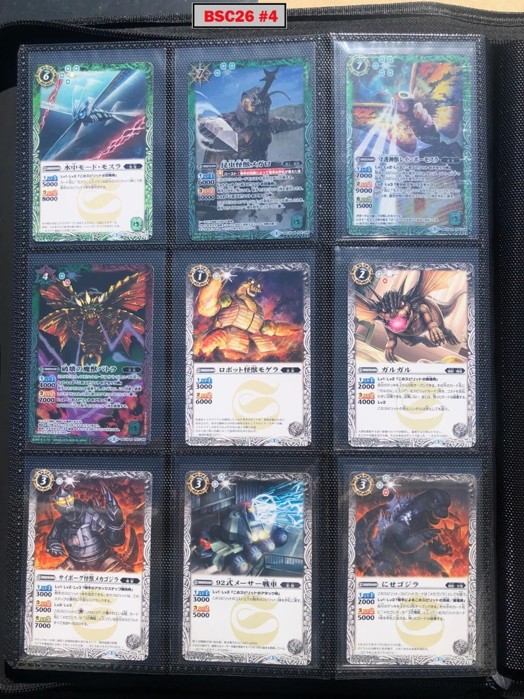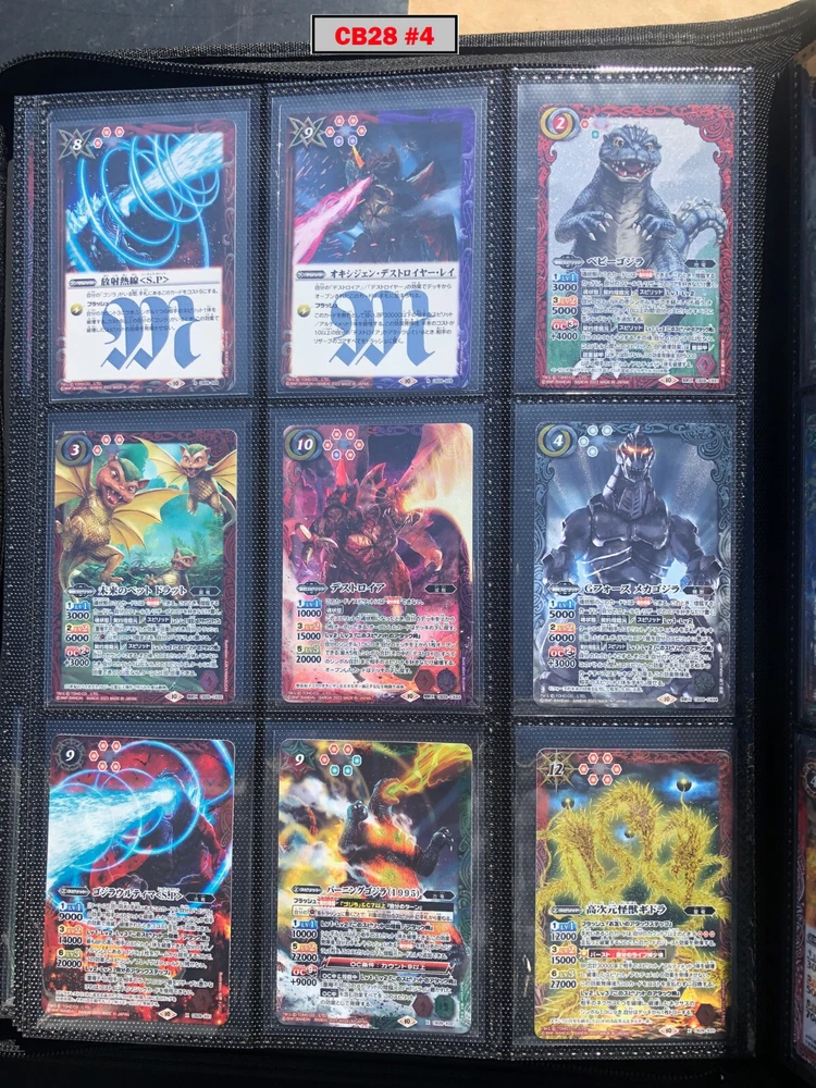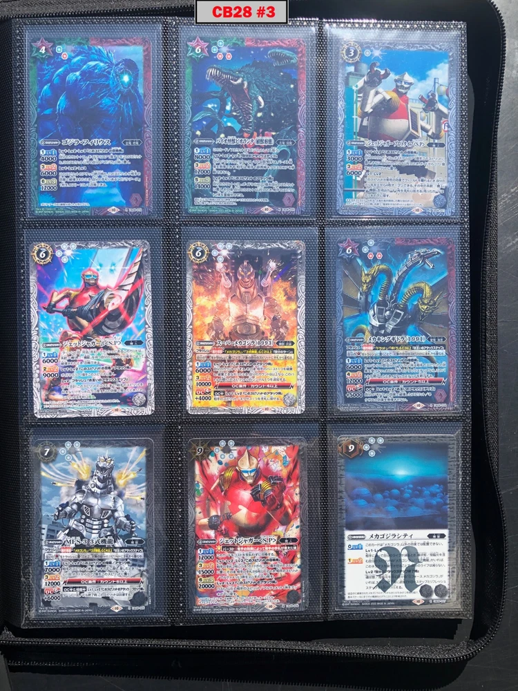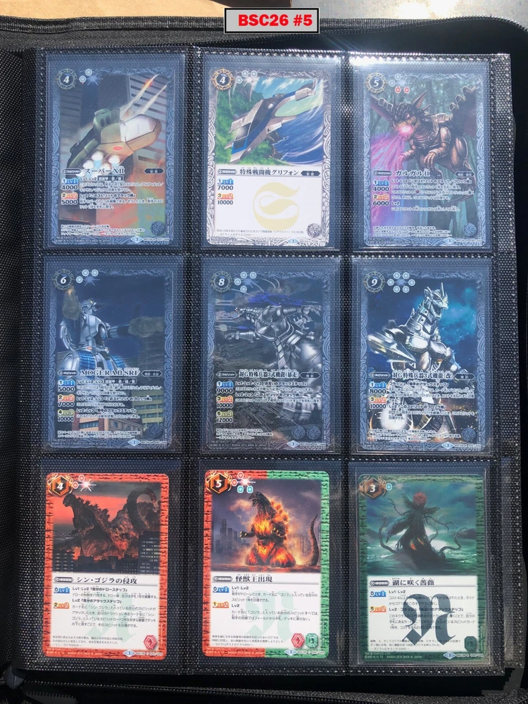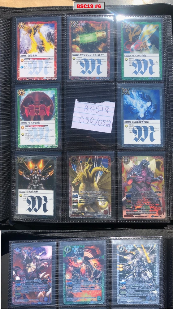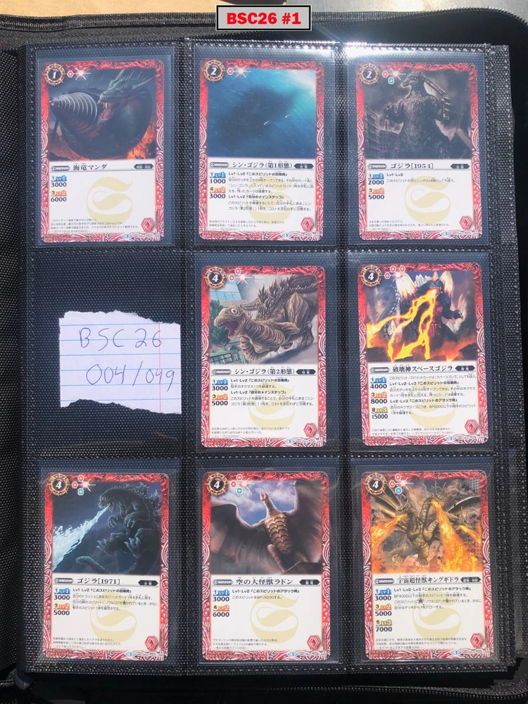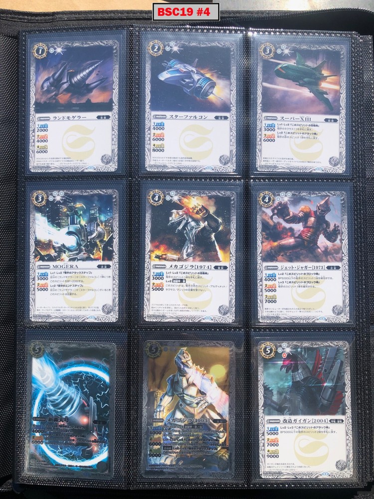 This is a collection of amazing Battle Spirits Japanese Godzilla cards from all 5 Godzilla Japan-only releases. The original set: BSC19 - Toho Kaiju's Great Battle released in 2015. The Kaiju included are from the original Toho Godzilla movies through Godzilla: Final Wars and the Rebirth of Motha trilogy. The follow up: BSC26 - Roar of the King of Kaiju released in 2016. The Kaiju in this release are from the Toho Godzilla films through Shin Godzilla, War of the Gargantua, Manango, Orochi and The Mysterians. A small set within a set: LM18G - Kaiju King Premium Card Set released 2018. This small set is 7 Godzilla cards. The fourth set: PB02 - Destroy All Toho Kaiju released 2019. This small set includes Kaiju from the Toho Godzilla films through Shin Godzilla. The final, most recent and largest by far: CB28 - Godzilla - Return of the Kaiju King released 2023. The Kaiju in this release are from the Toho Godzilla films through Shin Godzilla and the Netflix shows Godzilla: Singularity Point and the Anime Trilogy that started with Godzilla: Planet of the Monsters. This collection is nearly complete, including 200 of 213 cards in total. All the cards are in near-Mint condition. Its the perfect addition to any Godzilla fans collection. Free US Shipping Below is a summary of what is included in each set and below that is a detailed breakdown of what's included: Set Category Included Set Total CB28 Collaboration Booster: Godzilla - Return of the Kaiju King 73 74 BSC19 Collaboration Booster: Toho Kaiju's Great Battle 53 57 BSC26 Collaboration Booster: Roar of the King of Kaiju 56 57 PB02 Collaboration Starter: Destroy All Toho Kaiju 13 18 LM18G Battle Spirits Kaiju King Premium Card Set 5 7 BSC19 - Collaboration Booster: Toho Kaiju's Great Battle (Released 2015) The set has a total of 57 New cards (18 Commons, 15 Uncommons, 12 Rares, 7 Master Rares, and 5 X-Rares.) Included Card # Name Type Rarity Yes BSC19-001 Destoroyah (Juvenile Form) Standard Common Yes BSC19-002 Ebirah [2004] Standard Rare Yes BSC19-003 Minilla [2004] Standard Common Yes BSC19-004 Anguirus [2004] Standard Rare Yes BSC19-005 Little Godzilla Standard Common Yes BSC19-006 Baragon Standard Common Yes BSC19-007 Dorat Standard Common Yes BSC19-008 Rodan [2004] Standard Uncommon Yes BSC19-009 Monster X Standard Uncommon Yes BSC19-010 Gigan [2004] Standard Uncommon Yes BSC19-011 Godzilla Junior Standard Common Yes BSC19-012 Destoroyah (Aggregate Form) Standard Uncommon Yes BSC19-013 Fire Rodan Standard Master Rare Yes BSC19-014 Thousand Year Dragon King Ghidorah Standard Rare Yes BSC19-015 Keizer Ghidorah Standard Master Rare Yes BSC19-016 Orga Standard Master Rare Yes BSC19-017 Fairy Mothra Standard Common Yes BSC19-018 Kamacuras [2004] Standard Common Yes BSC19-019 Mothra (Larva Form) [1992] Standard Common Yes BSC19-020 King Caesar [2004] Standard Common MISSING BSC19-021 Megaguirus Standard Master Rare Yes BSC19-022 Biollante (Flower Beast Form) Standard Rare Yes BSC19-023 Mothra Standard Uncommon Yes BSC19-024 Biollante (Plant Beast Form) Standard Master Rare Yes BSC19-025 Armor Mothra Standard Master Rare Yes BSC19-026 Battra (Larva Form) Standard Common Yes BSC19-027 Battra Standard Master Rare Yes BSC19-028 Land Moguera Standard Common Yes BSC19-029 Star Falcon Standard Common Yes BSC19-030 Super X3 Standard Uncommon Yes BSC19-031 MOGUERA Standard Common Yes BSC19-032 MechaGodzilla [1974] Standard Common Yes BSC19-033 Jet Jaguar [1973] Standard Uncommon Yes BSC19-034 New Gotengo Standard Rare Yes BSC19-035 MechaGodzilla [1993] Standard Rare Yes BSC19-036 Modified Gigan [2004] Standard Uncommon Yes BSC19-037 Type-3 Kiryu Standard Master Rare Yes BSC19-038 Mecha-King Ghidorah Standard Rare Yes BSC19-039 Garuda Standard Common MISSING BSC19-040 The Crystal Zone Standard Common Yes BSC19-041 Planet Gorath Standard Uncommon Yes BSC19-042 The Time of Awakening Standard Uncommon Yes BSC19-043 The Infant Island Standard Common MISSING BSC19-044 The MechaGodzilla Hangar Standard Uncommon Yes BSC19-045 The G Summit Standard Common Yes BSC19-046 Gravity Beam Standard Uncommon Yes BSC19-047 Oxygen Destroyer Standard Rare Yes BSC19-048 Mothra's Emergence Standard Rare Yes BSC19-049 Mothra's Song Standard Uncommon MISSING BSC19-050 Shintoshin Collapse Standard Uncommon Yes BSC19-051 Type-3 Absolute Zero Cannon Standard Rare Yes BSC19-052 All Arms Attack Standard Rare Yes BSC19-X01 King Ghidorah [1991] Standard X-Rare Yes BSC19-X02 Space Godzilla Standard X-Rare Yes BSC19-X03 Destoroyah (Final Form) Standard X-Rare Yes BSC19-X04 Mothra [1992] Standard X-Rare Yes BSC19-X05 Modified Type-3 Kiryu Standard X-Rare BSC26 - Collaboration Booster: Roar of the King of Kaiju (Released 2016) The set has a total of 54 New + 3 Reprint cards (31 Commons, 2 Uncommons, 12 Rares, 7 Master Rares, and 5 X-Rares.) Included Card # Name Type Rarity Yes BSC26-001 The SeaDragon Manda Standard Common Yes BSC26-002 Shin-Godzilla (First Form) Standard Common Yes BSC26-003 Godzilla [1954] Standard Common MISSING BSC26-004 Godzilla [1965] Standard Rare Yes BSC26-005 Shin-Godzilla (Second Form) Standard Common Yes BSC26-006 The God of Destruction Space Godzilla Standard Common Yes BSC26-007 Godzilla [1971] Standard Common Yes BSC26-008 The Sky Giant Kaiju Rodan Standard Common Yes BSC26-009 The Space Super Kaiju King Ghidorah Standard Common Yes BSC26-010 The Kaiju King Godzilla [2000] Standard Rare Yes BSC26-011 Destoroyah (Flying Form) Standard Common Yes BSC26-012 Shin-Godzilla (Third Form) Standard Rare Yes BSC26-013 The Demonic Aqua Beast Dagahra Standard Common Yes BSC26-014 The Space Super Demonic Beast Desghidorah Standard Rare Yes BSC26-015 Godzilla [1989] Standard Rare Yes BSC26-016 The Demon King Yamata-no-Orochi Standard Master Rare Yes BSC26-017 The Smog Kaiju Hedorah Standard Rare Yes BSC26-018 The Complete Lifeform Destoroyah Standard Master Rare Yes BSC26-019 The Cyborg Kaiju Gigan Standard Master Rare Yes BSC26-020 Matango Standard Common Yes BSC26-021 