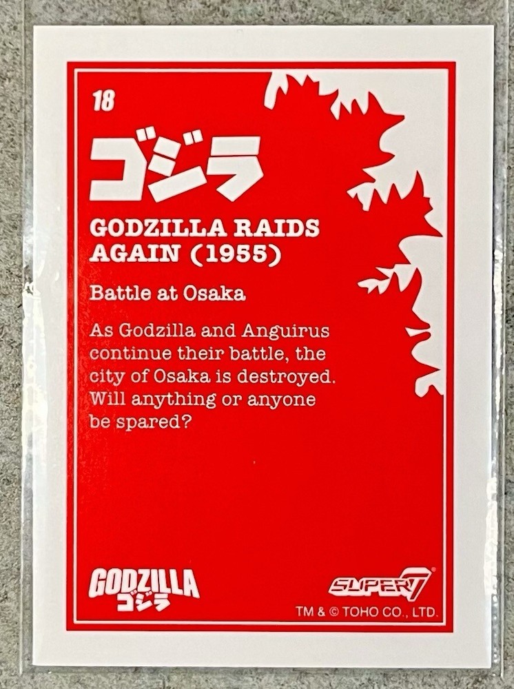 The Battle at Osaka 2024 SUPER 7 GODZILLA Toho Showa Series 1 #18 captures the iconic monster in all his glory, commemorating the classic 1955 film "Godzilla Raids Again." This non-sport trading card is a must-have for fans of the franchise and collectors alike, featuring the renowned Toho craftsmanship that has made the Godzilla series a beloved staple. With its vivid depiction of the legendary creature, this card is a standout piece from the Series 1 set. The 2024 year of manufacture ensures its place as a contemporary collectible, perfect for modern-era enthusiasts. Add this striking Godzilla card to your collection and own a piece of movie history.