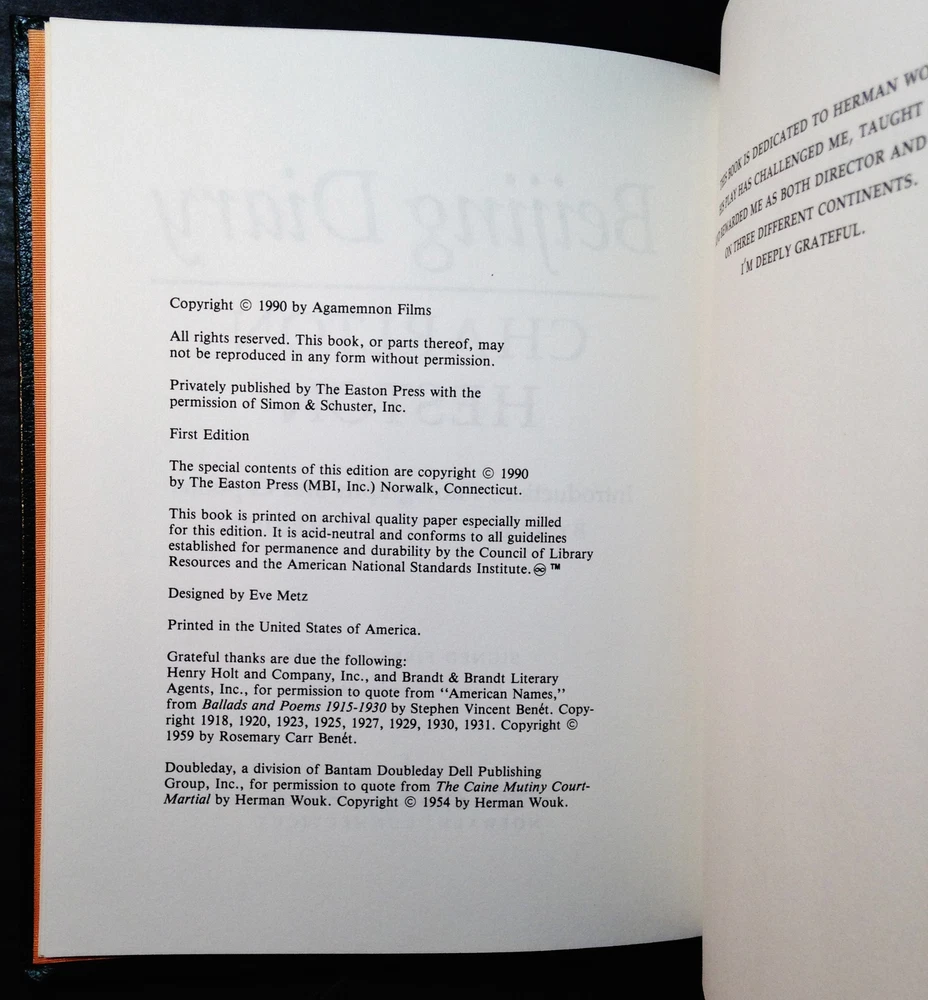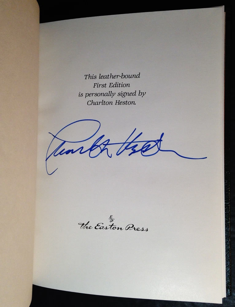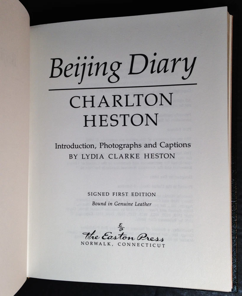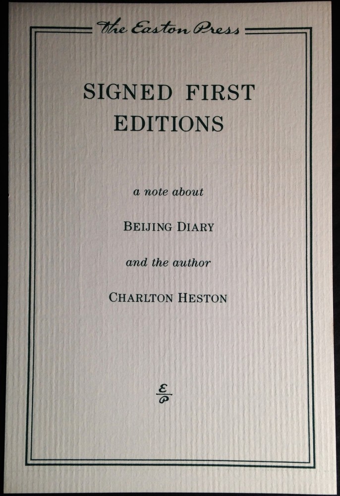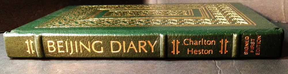 Beijing Diary by Charlton Heston, Easton Press SIGNED First Edition, Leather Beijing Diary by Charlton Heston, Easton Press SIGNED First Edition, Leather Beijing Diary by Charlton Heston, Easton Press Signed First Edition , Leather Part of the Signed First Editions of Non-Fiction collection of The Easton Press, Norwalk Connecticut, 1990. This book is in excellent unread condition, and includes a notecard from the Publisher. The Easton Press books are bound in genuine leather binding, with 22kt gold accents and hubbed spines, gilded page ends, acid-neutral paper, Moire fabric endsheets, and evocative illustrations and decorations. We will be happy to combine shipping, wherever possible. Some items cannot be combined because of their size, weight or because they are fragile. Please ask if you have any questions. Your order will ship by the next business day after receiving payment. All items are from a smoke-free environment. Thank you, and Happy Reading!