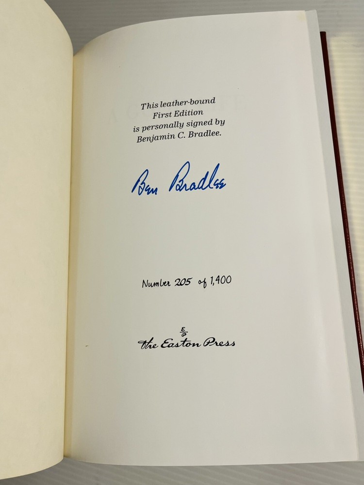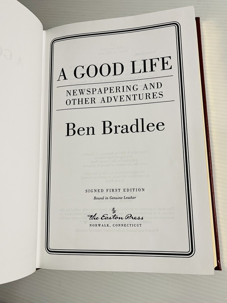 For Sale today: One Easton Press Printing in Limited Edition. One scarce Signed First Edition in fine Leather Binding. This book is titled: A Good Life Author: Ben Bradlee Publisher: Easton Press Year published: 1995 Condition description: A very clean book bound in fine decorated Leather. The book shows hardly any signs of wear and appears to have seen very little or no use. Please view the attached photos for details. Free shipping within the USA
