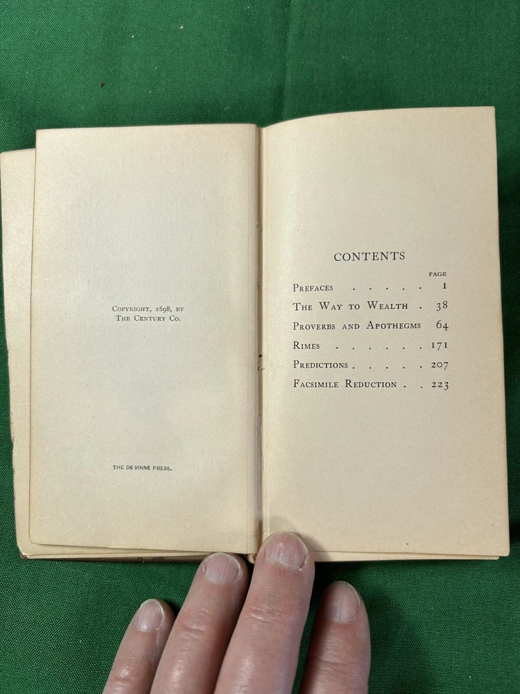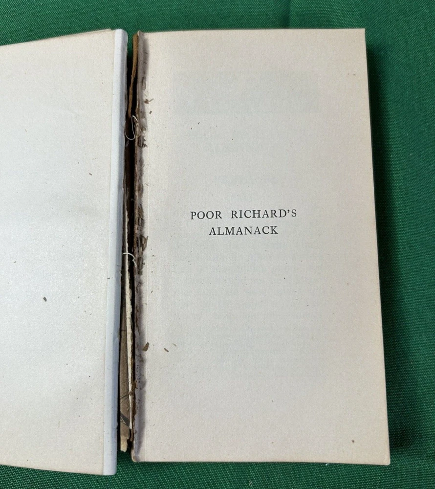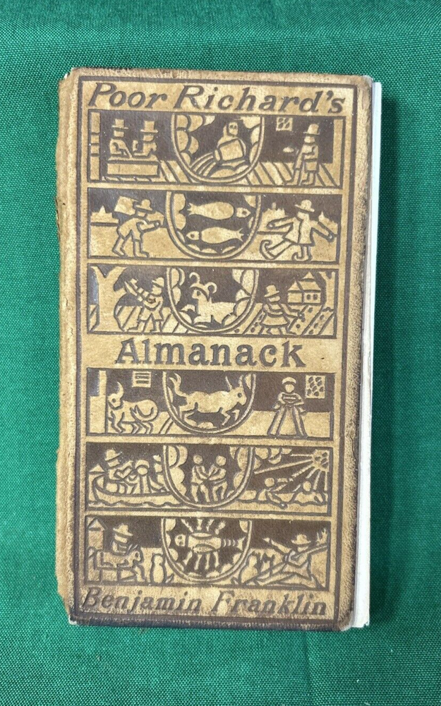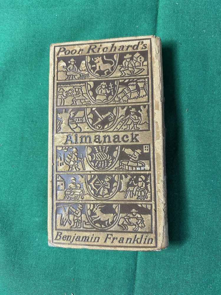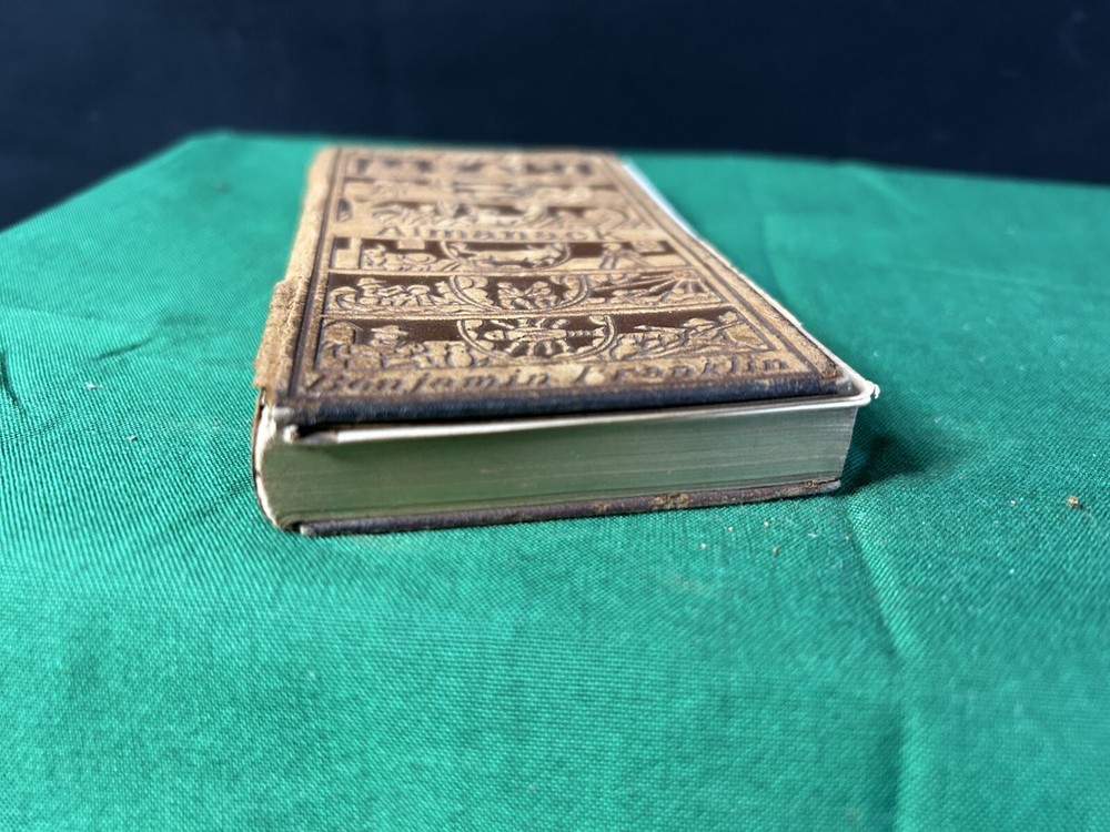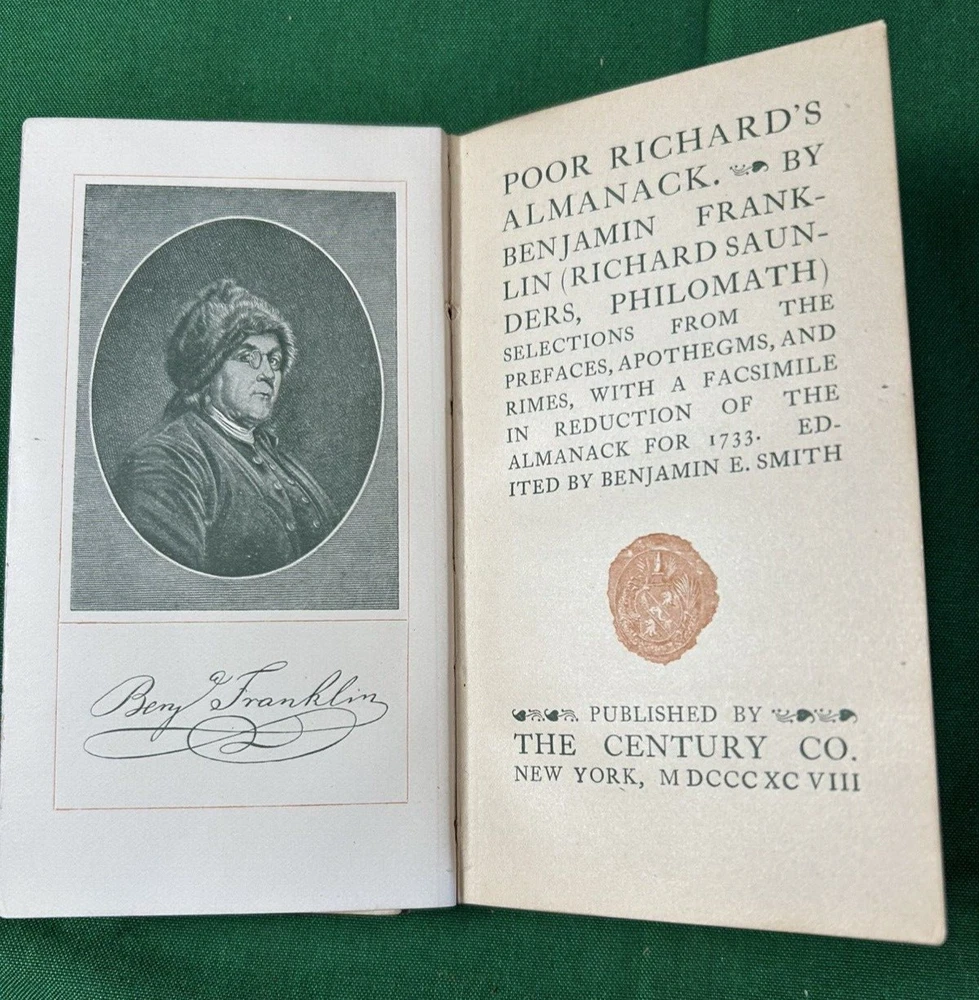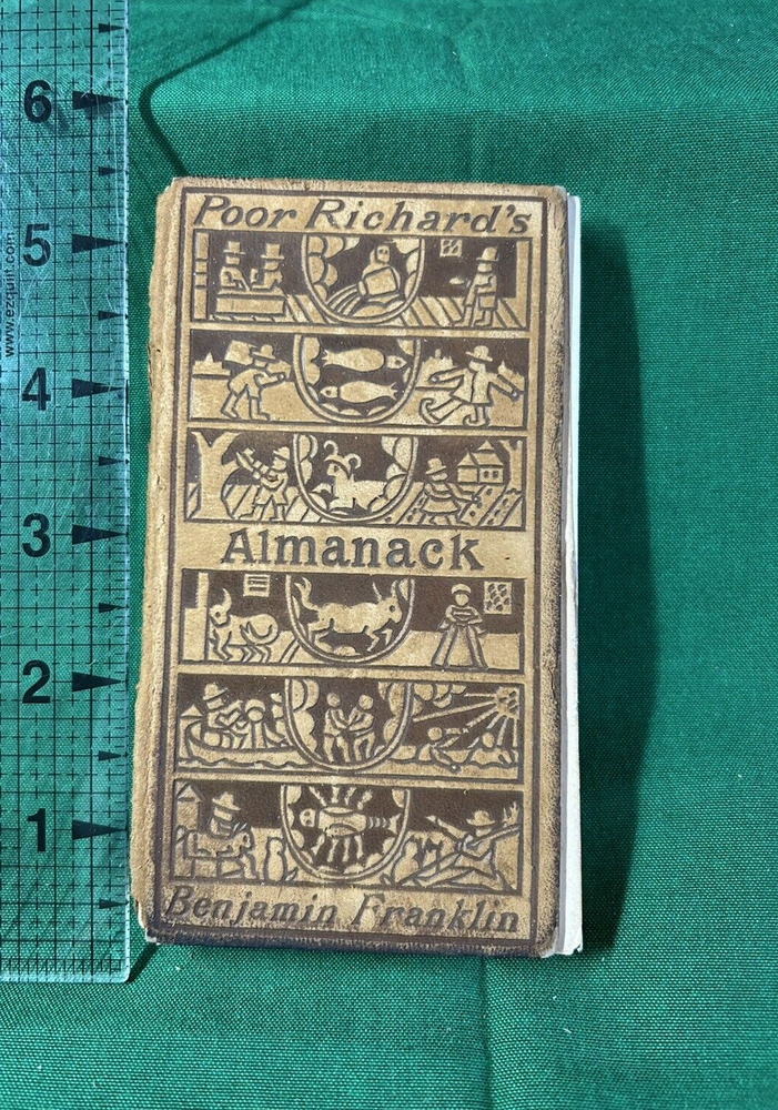 Ben Franklin POOR RICHARD’S ALMANACK Leather 1898 Edition Antique Vintage Inscribed and dated 1898 Binding is not in good condition, front few pages are detached. But cover is richly colored and embossing is still crisp and distinct. Please carefully check out all the pictures. All of our items are donated and 100% of the proceeds go to Best Friend Dog and Animal Adoption Inc. in NJ, supporting our rescued animals. Thanks for taking a look and please check out our other listings. You never know what you’ll find. ;-)