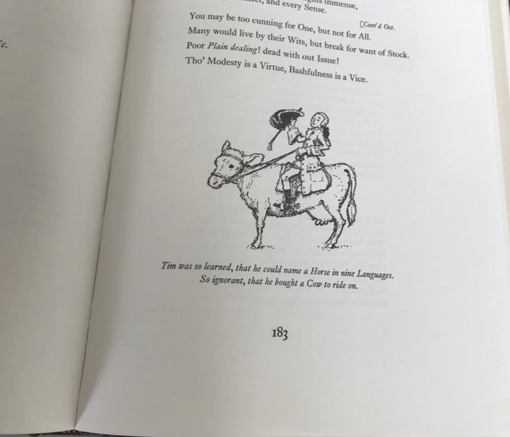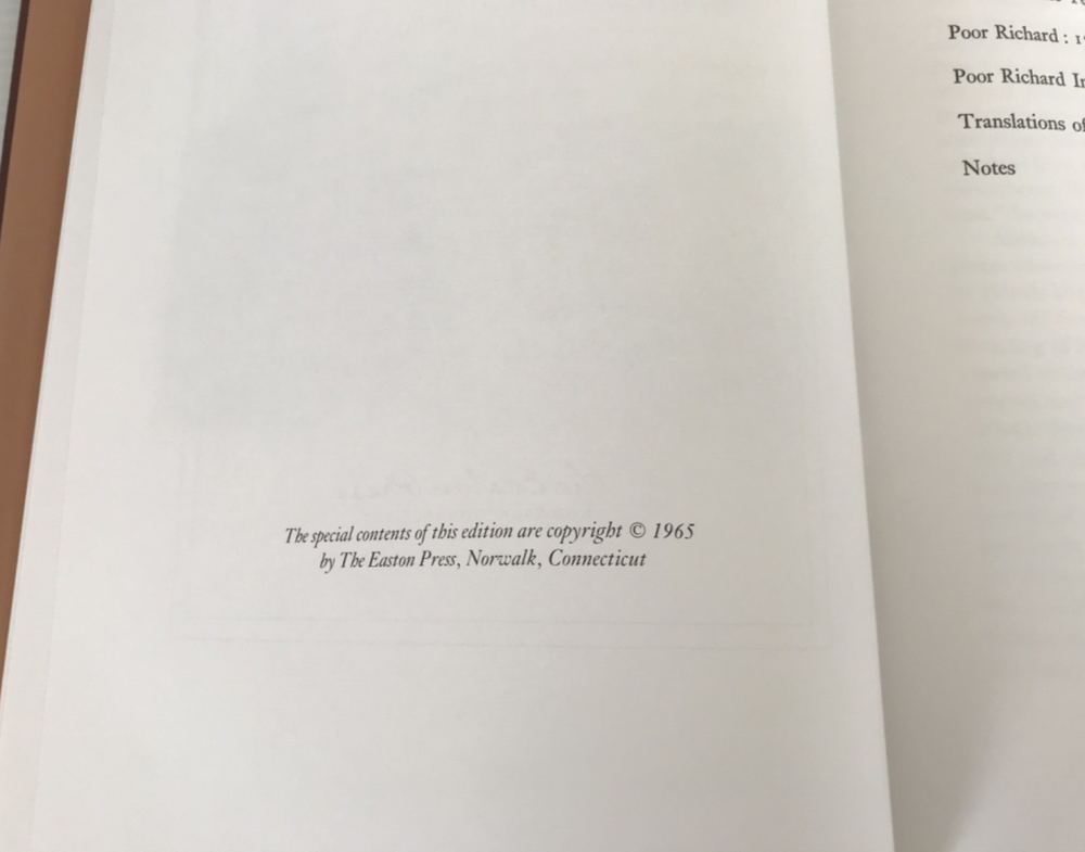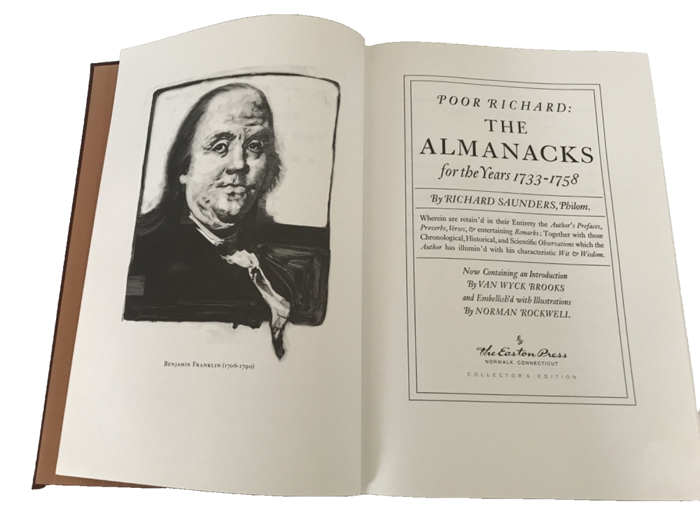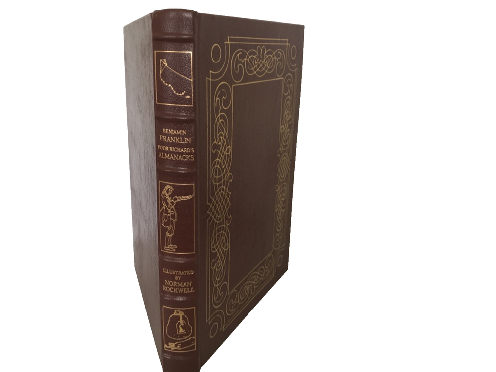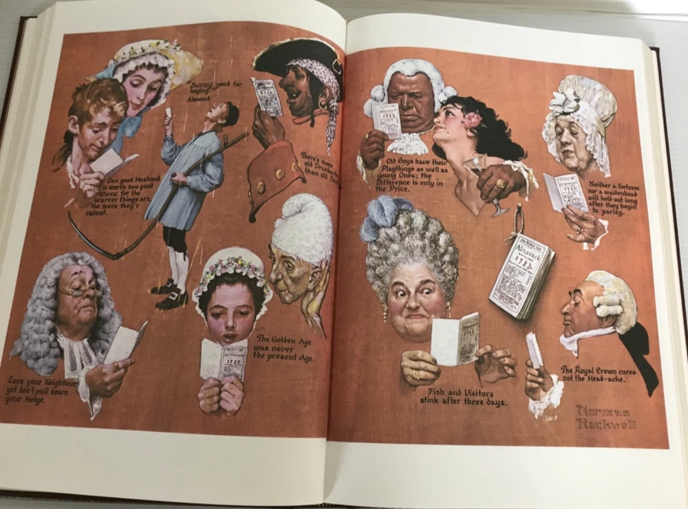 1965. Poor Richard's Almanac. Benjamin Franklin. 300pp. The Eaton Press. Collector's Edition. Illustrated by Norman Rockwell. Beautiful large volume covered in brown leatherette with lavish gilded borders on cover and illustrated on spine between raised bands. Orange/brown silk moire end pages. Gilded text block. Contains many b/w illustrations and 6 full colored illustrations by Rockwell.