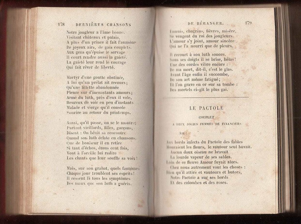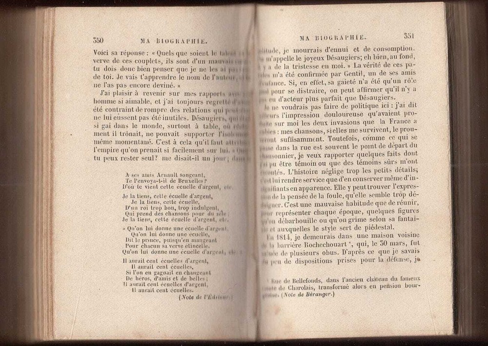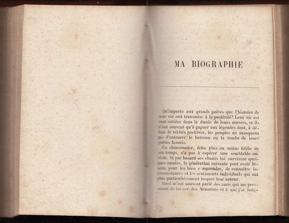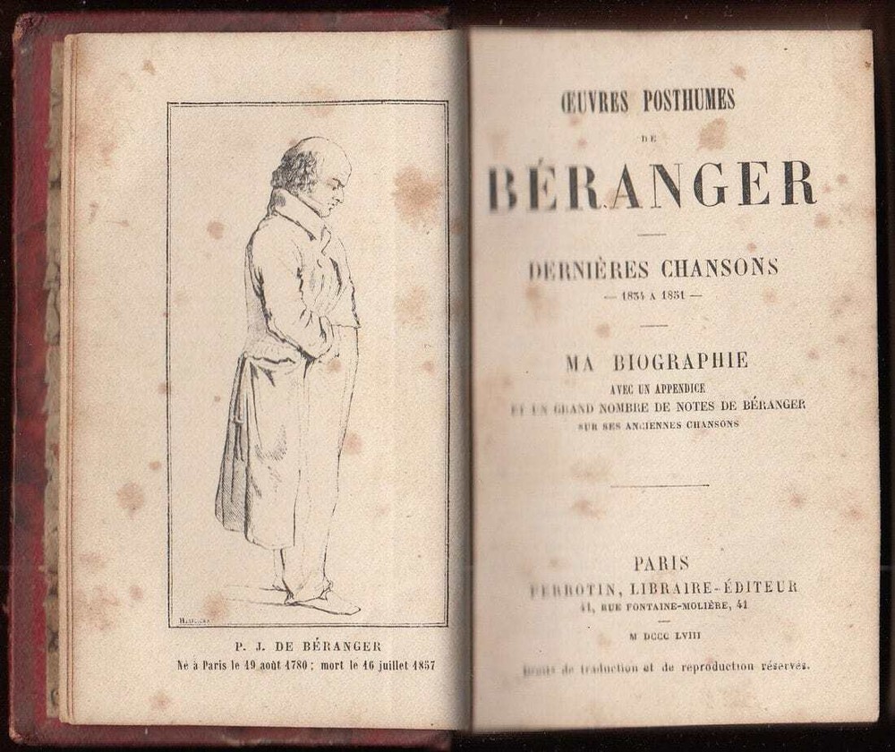 Beranger Oeuvres Posthumes Dernières Chansons Autobiography Beranger Oeuvres Posthumes Oeuvres Posthumesde BÉRANGER DERNIÈRES CHANSONS -1834 a 1851- By Pierre-Jean de Béranger. (Posthumous works of Beranger, Last Chansons, 1834-1851) – In the French language. *** Posthumous works of Pierre-Jean de Béranger, famous French poet and songwriter, containing his last chansons. Part of the book has an autobiographical character. A very beautiful pocket edition with a gorgeous binding, a joy to read from. *** Paris, Perrotin, 1858. *** Pp.: 568 + /2/. Size: 11 x 7,5 cm. *** Binding: Original half-leather binding. Giltstamped, signs of wear along the edges and on the panels (see scans). Condition: A title page with frontispiece stained. Minor stains and signs of aging. *** Worldwide DHL shipping is included. For condition and details see the scans. For any additional questions feel free to contact us, we are eager to respond to all of your questions! Shipping Shipping method: All items are shipped via Express Mail Service (EMS) or private couriers such as DHL and UPS. You will receive a tracking number with whom you can trace the item's location at any given time. All items will be packed safely and properly to avoid any damage during their voyage. Combined Shipping: We offer free shipping for books. For other items, it is possible to combine purchases. You just need to make a request for a separate invoice. Please note: If you have ordered more than one item from a different category, please wait for the combined shipping invoice . Shipping time: We send all the items within 24h of payment being received on a working day. In case we are on holiday the item will be shipped the first next working day. The estimated delivery time is 3-7 working days. Customs office: You may be charged by the customs office in your country. There are no hidden expenses like sales or export taxes unless specified in the item’s description. Please familiarize yourself with the import laws of your country before purchasing in case you are not entirely sure if an item is subject to customs taxes. For some items, an export license is needed and additional fees and time to get the export permit will be clearly stated in the item description. Some items may end up at customs inspections in Serbia so we will kindly ask you to be patient while such inspections take place because they can cause a delay in the delivery time. Payment Payments will be processed via: Paypal eBay Managed Payments Credit and debit cards will be processed via the mentioned processors as well. We kindly ask our buyers to pay within three working days of the order. After that, the buyers will be sent a reminder. If the payment is not received even after that, a case will be opened. Returns and refunds In case you would like to return/exchange the item for any reason you are free to do so. We ask all our buyers to contact us prior to sending an item back. The moment the item arrives back the buyer will be entitled to a refund. Exchange for another item from the store is also an option. It is possible to return an item within 30 days from the date of arrival. Feel free to contact us if you have any additional questions, we will be happy to answer them!