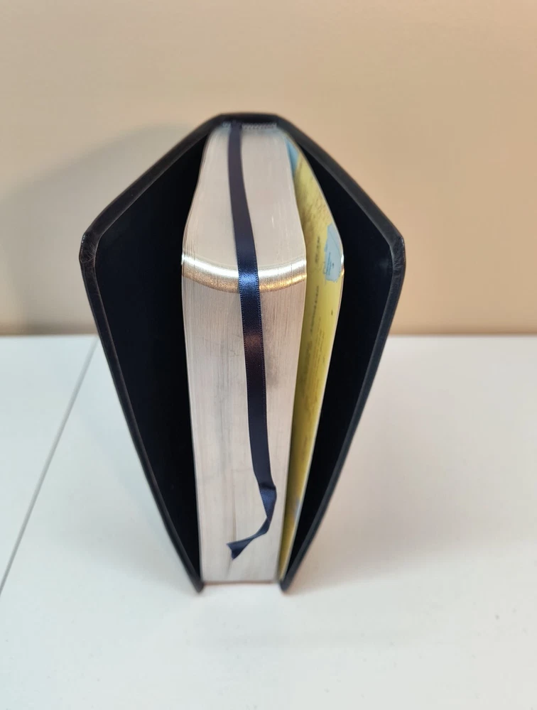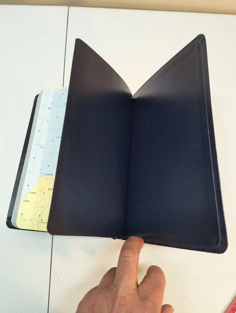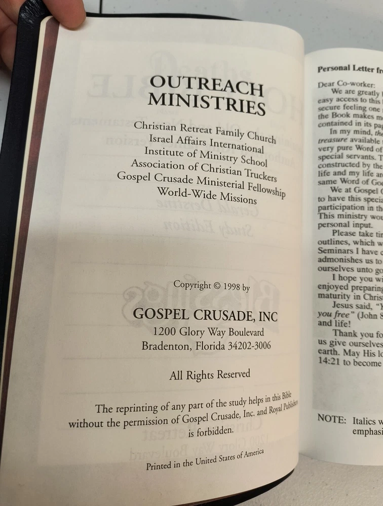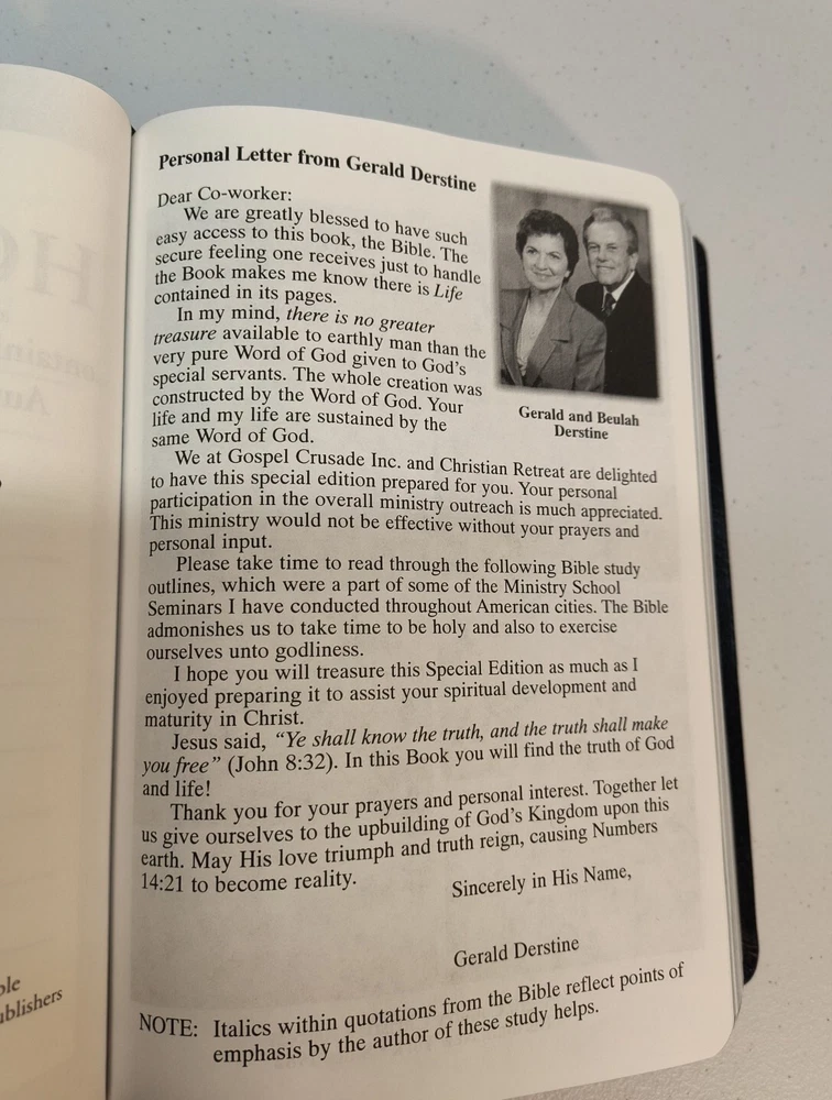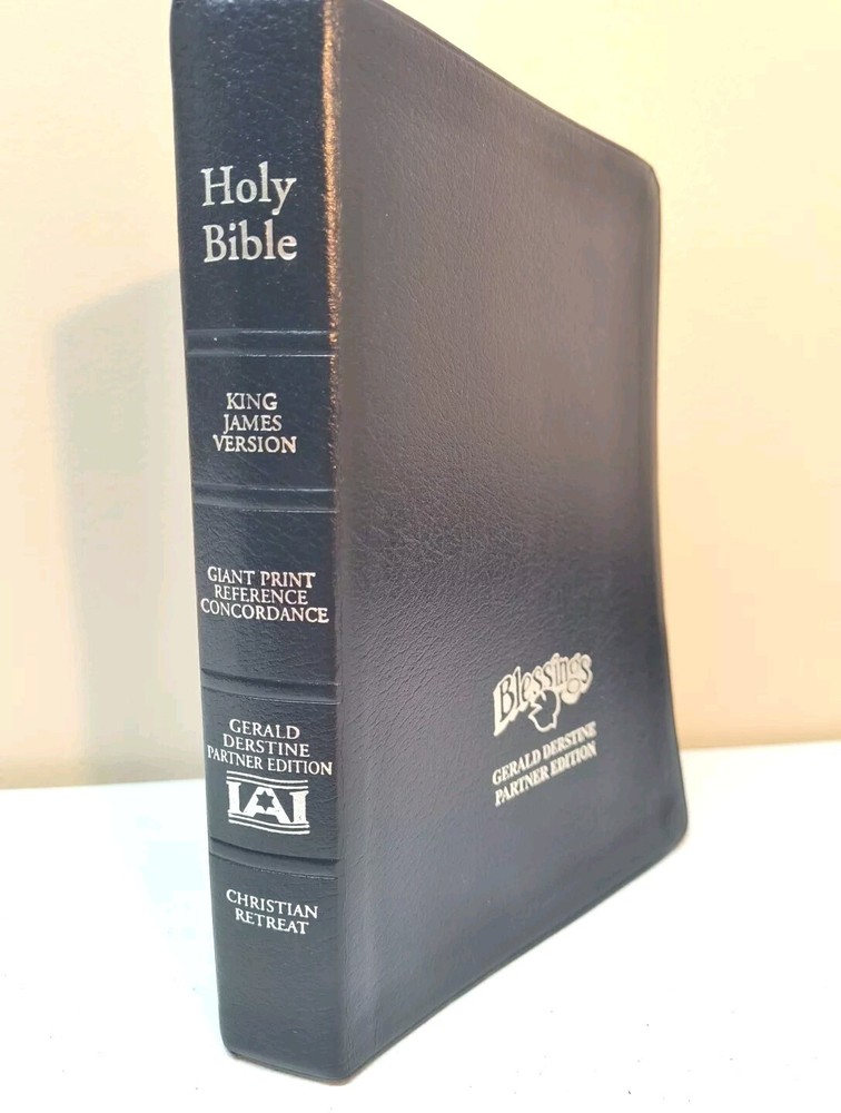 The "King James Giant Print Reference" Bible by Gerald Derstine published by Gospel Crusade in 1998. This partner edition features a vintage leather format with large print for easy reading. The book is intended for young adults and adults interested in spirituality and history, focusing on references to the Bible in a Christian retreat setting. Written in English as part of the Enlightenment literary movement, this Bible serves as a valuable reference for those looking to deepen their understanding of the scriptures. See pictures for writing inside