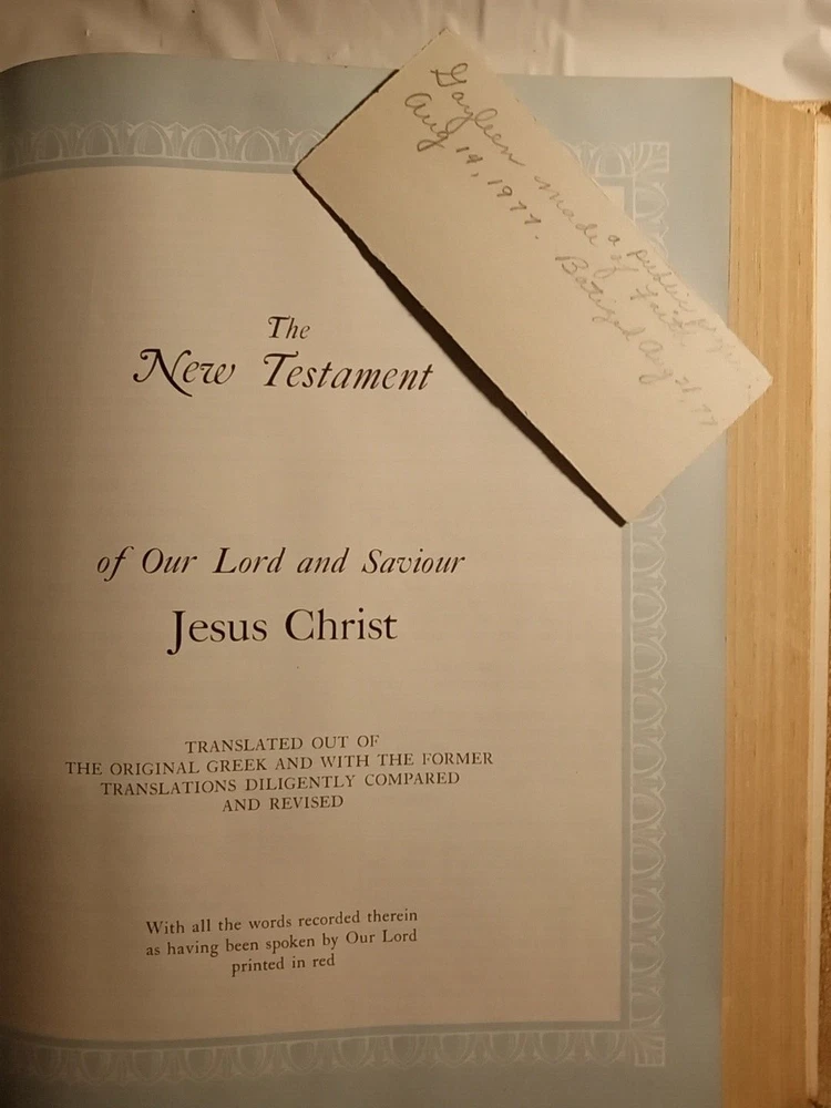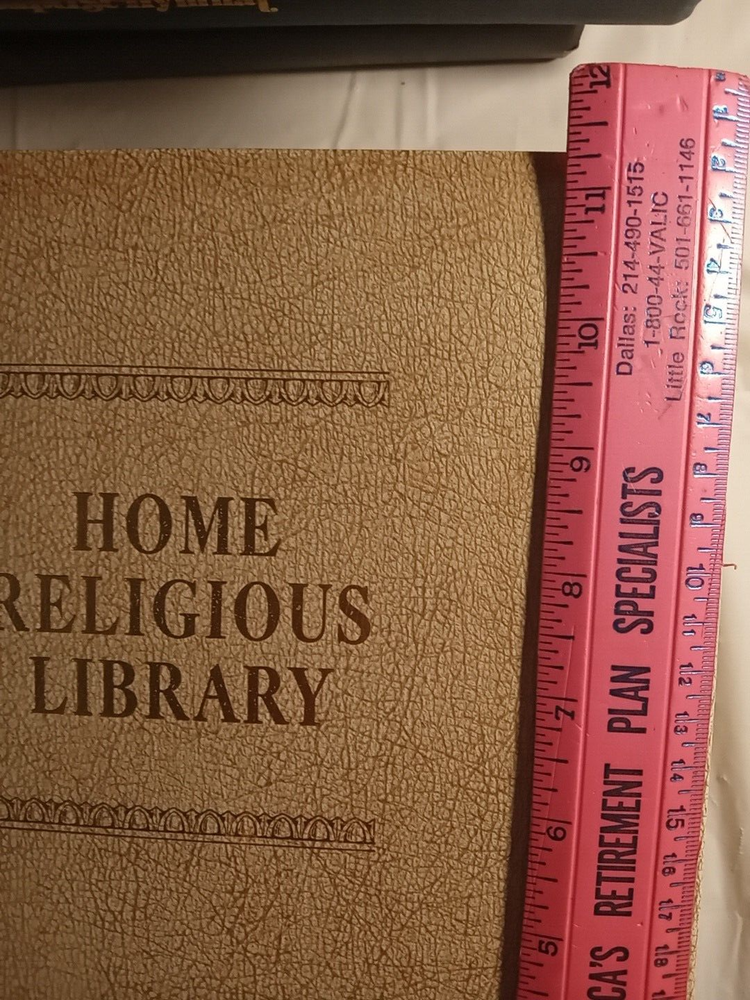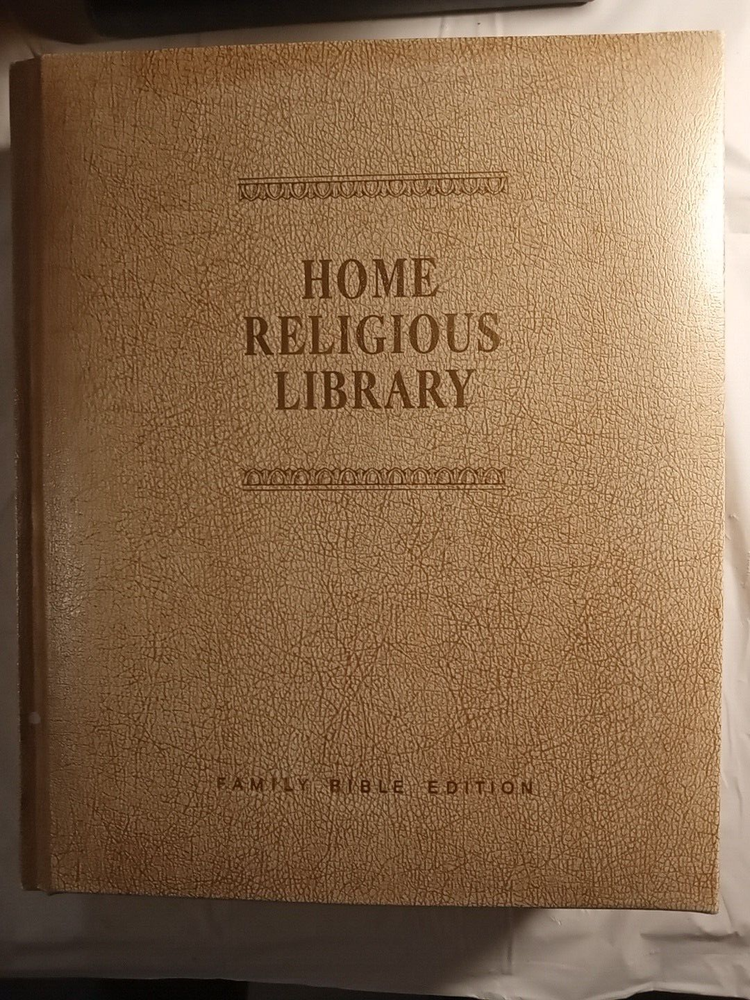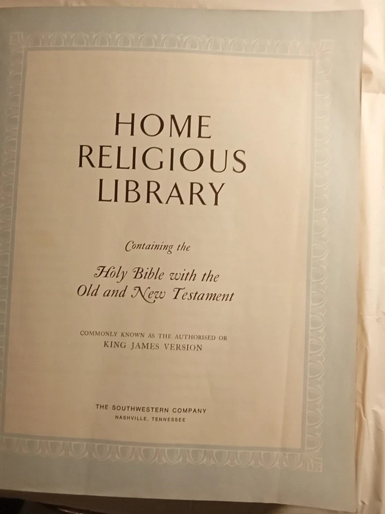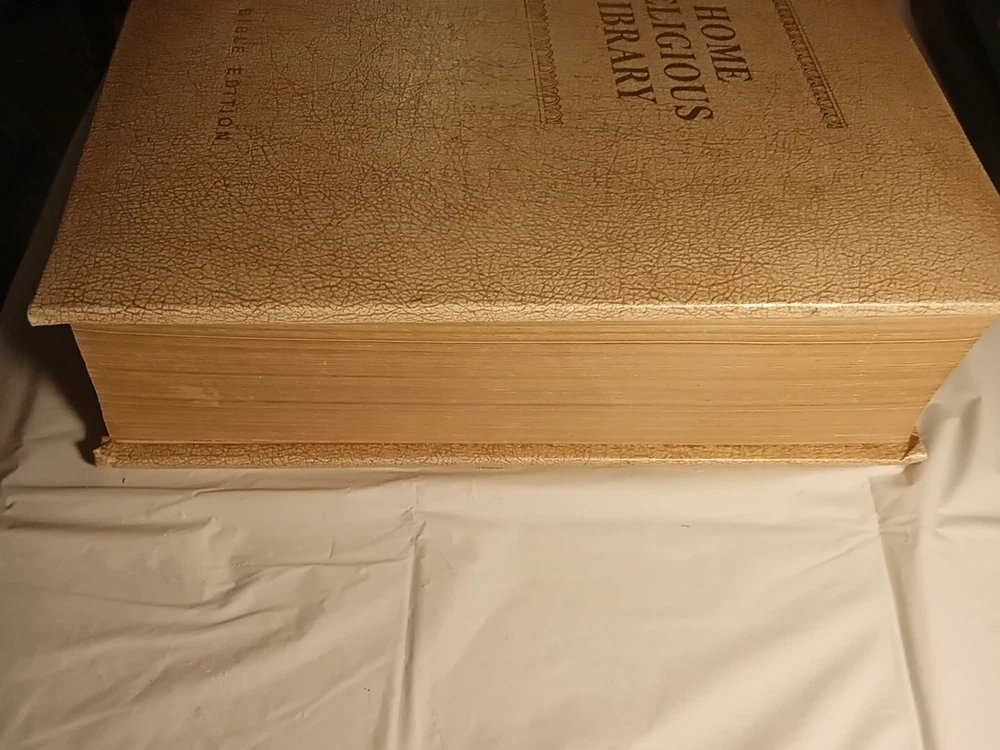 This is a vintage Family Bible Edition titled "The Home Religious Library" in King James Version. It measures 11.5" x 10" x 2.75" and was published in 1977 by The Southwestern Company in the United States. It features faux leather binding with gilt pages, maps, red-letter words of Jesus, reference guides, color pictures, indexes, and Bible stories for children. No markings on pages.