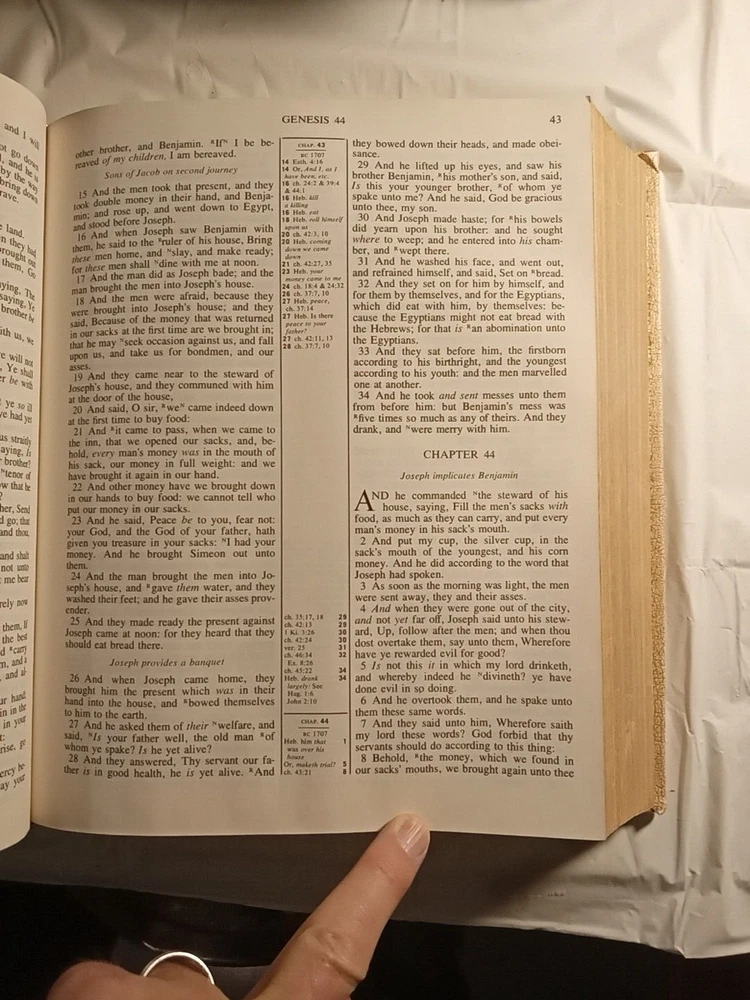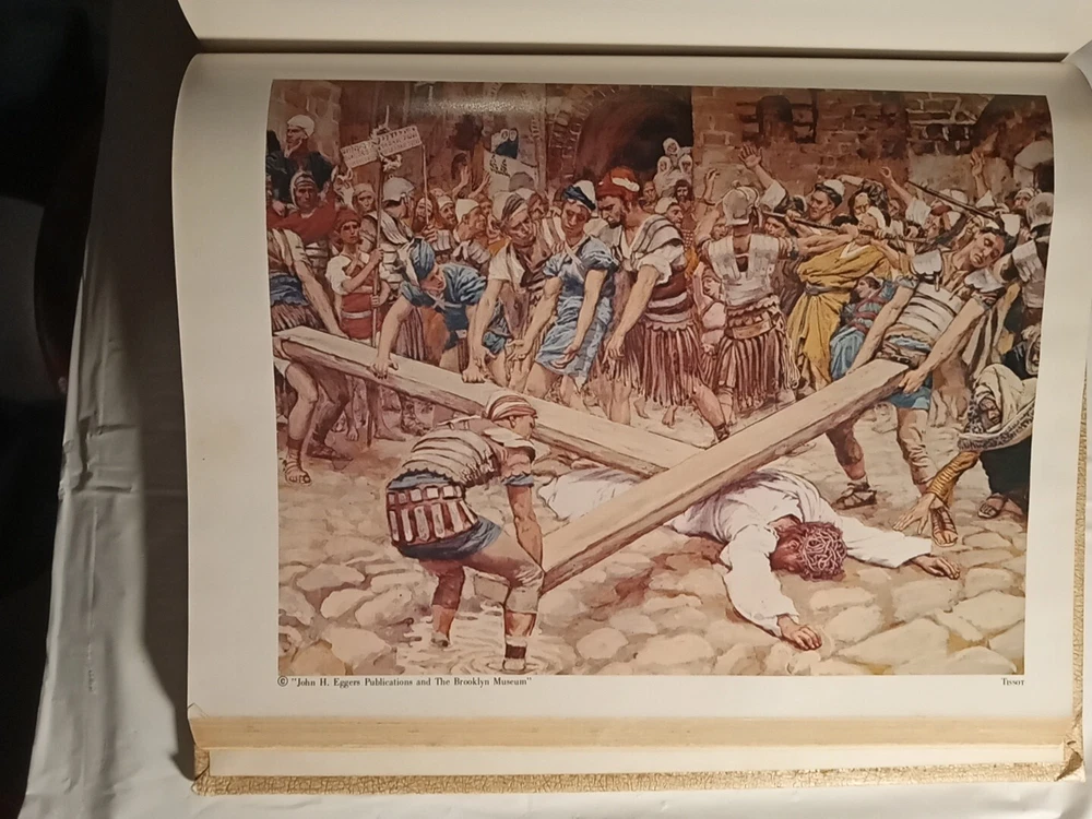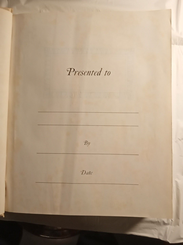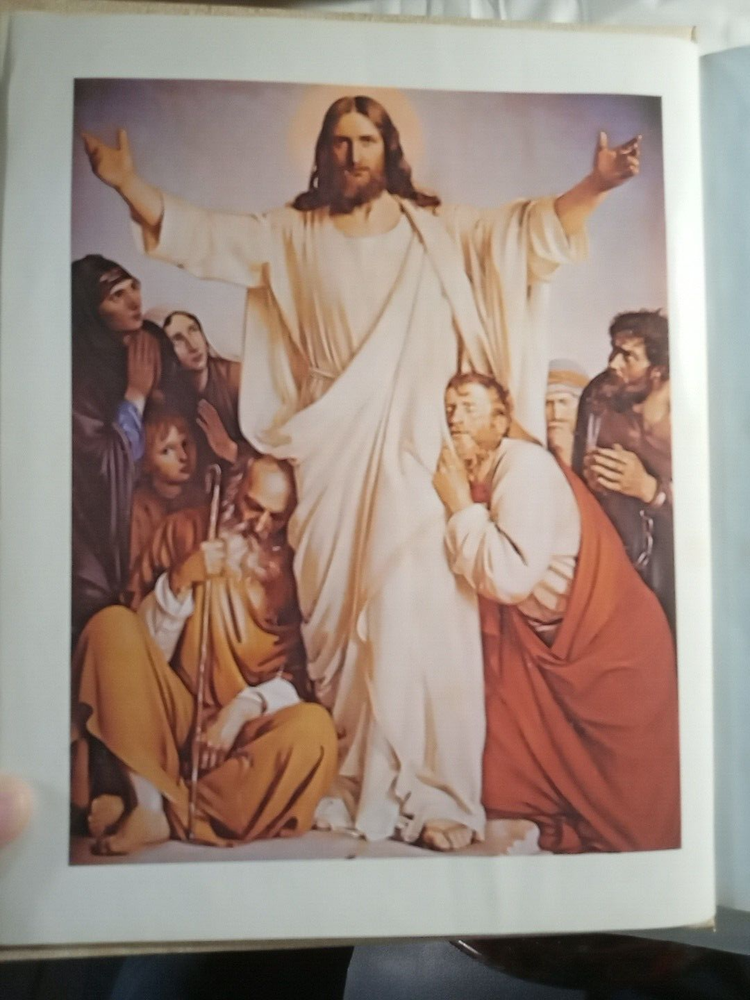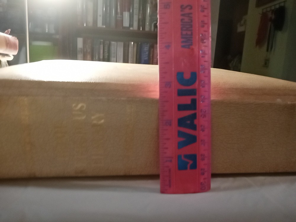 This is a vintage Family Bible Edition titled "The Home Religious Library" in King James Version. It measures 11.5" x 10" x 2.75" and was published in 1977 by The Southwestern Company in the United States. It features faux leather binding with gilt pages, maps, red-letter words of Jesus, reference guides, color pictures, indexes, and Bible stories for children. No markings on pages.