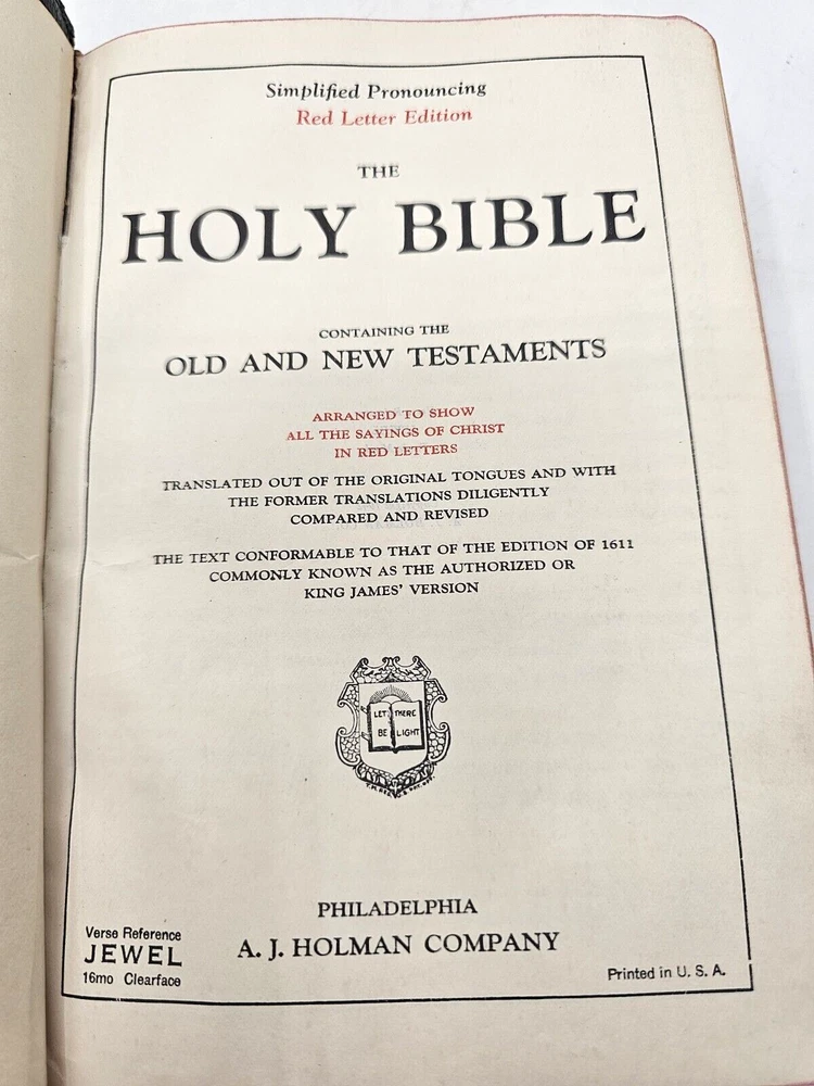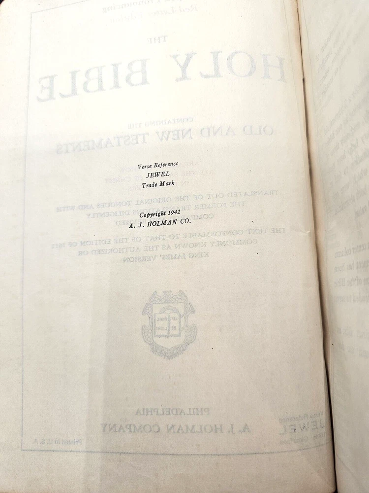 Bible KJV Holman Jewel Reference 1942 Morocco Leather Condition: Heavy wear on cover and spine edges. Presentation page has been removed. No writing within text.