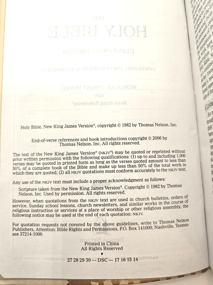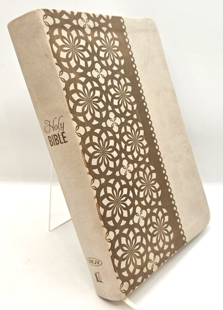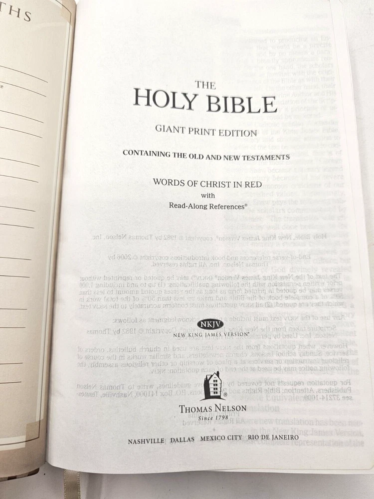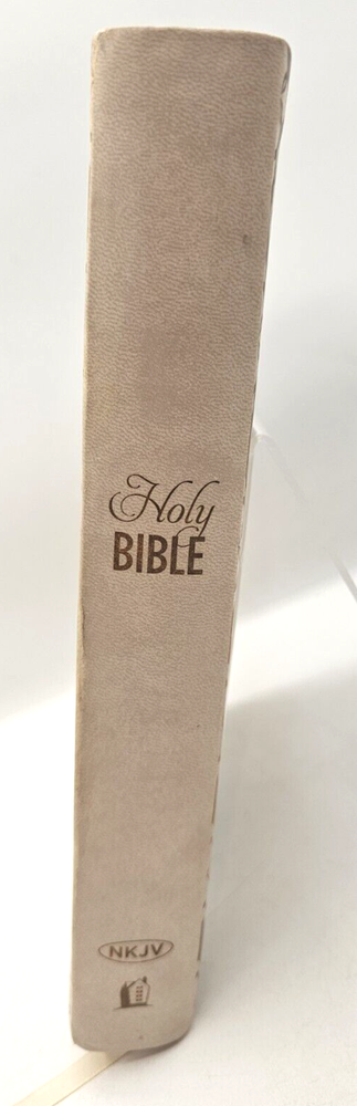 Bible NKJV Giant Print End Of Verse Reference 2006 Thomas Nelson Ivory Gold Condition: Wear on cover edges. No writing within text....