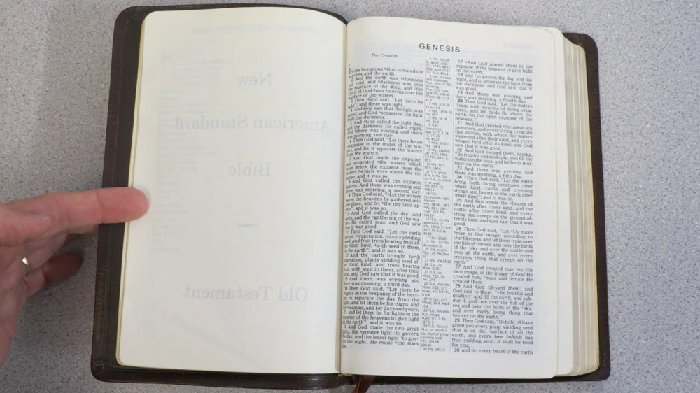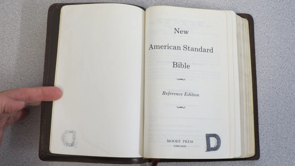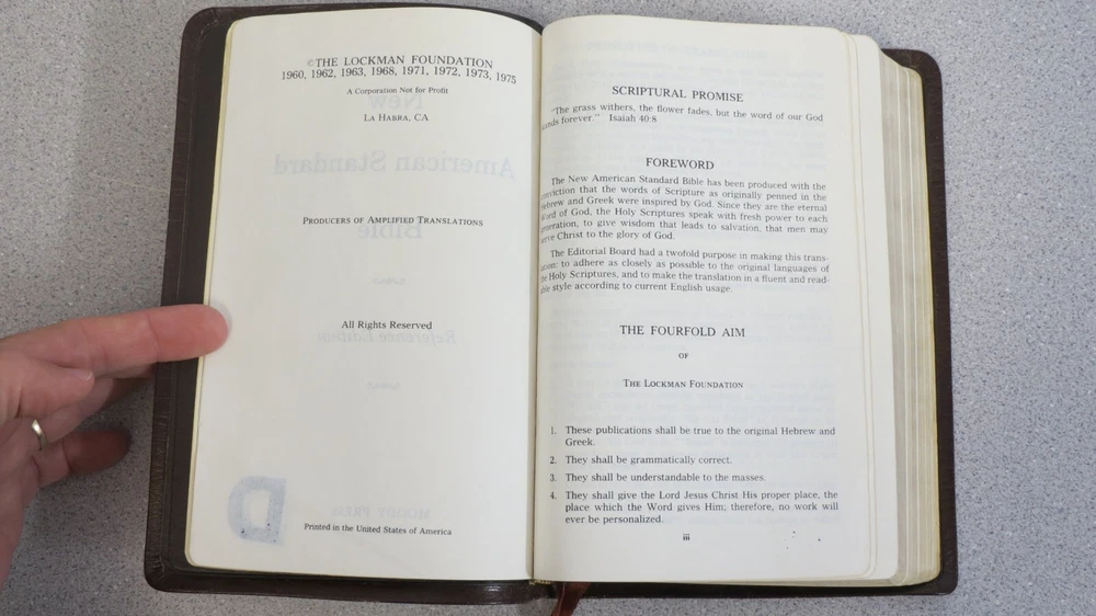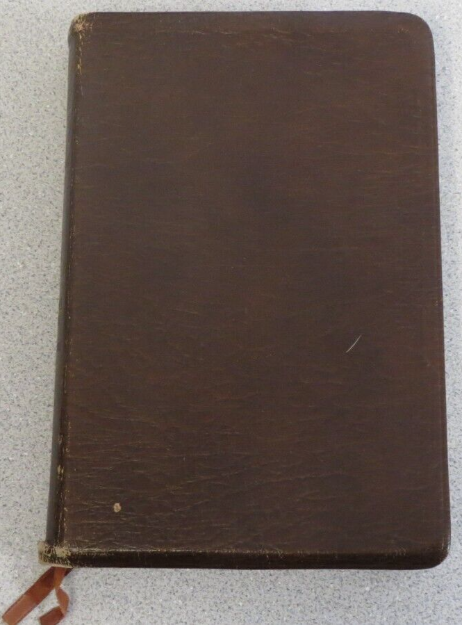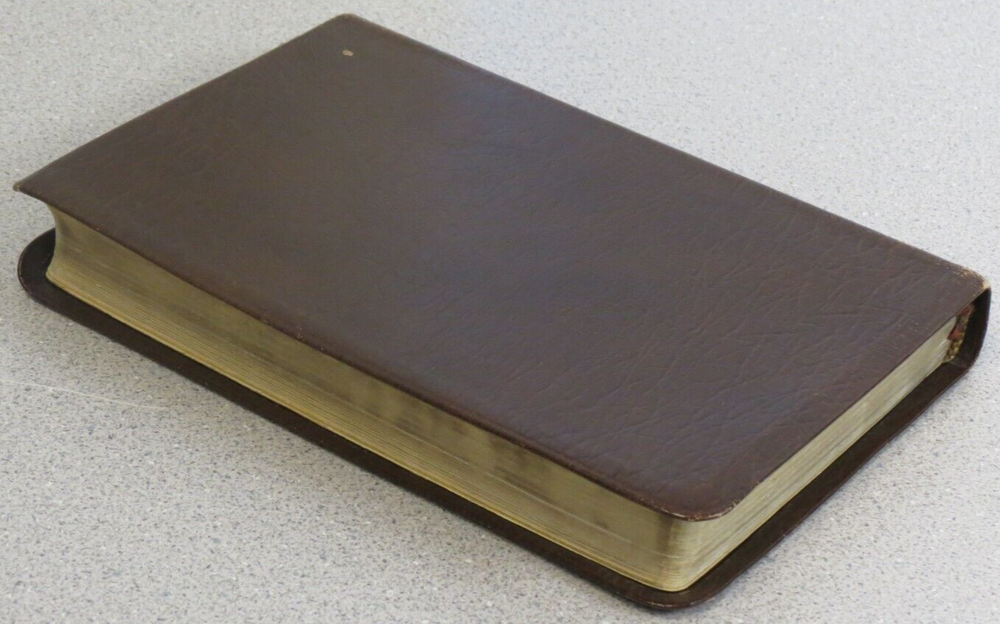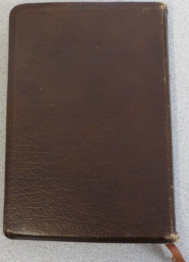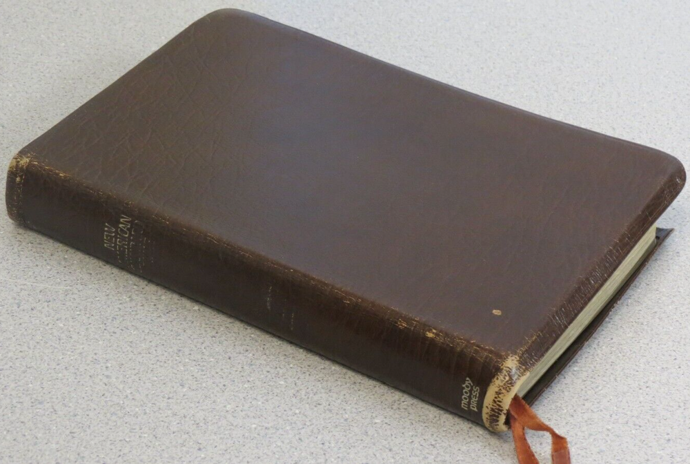 Bible - New American Standard Reference Edition brown cowhide bonded leather lined 1975 Moody approx size: 5.75 x 8.75" cover shows much wear, distress, Stamp "D" on title page, see pics.