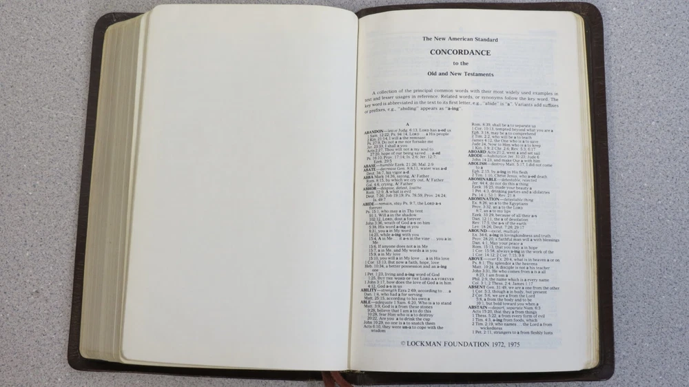 Bible - New American Standard Reference Edition brown cowhide bonded leather lined 1975 Moody approx size: 5.75 x 8.75" cover shows much wear, distress, Stamp "D" on title page, see pics....