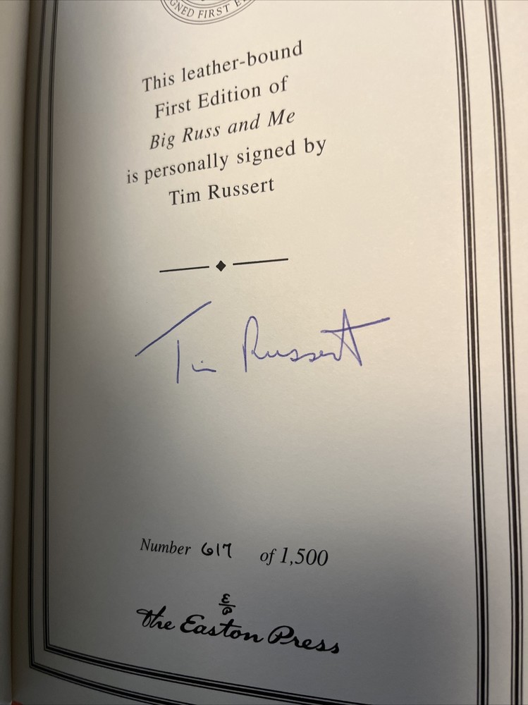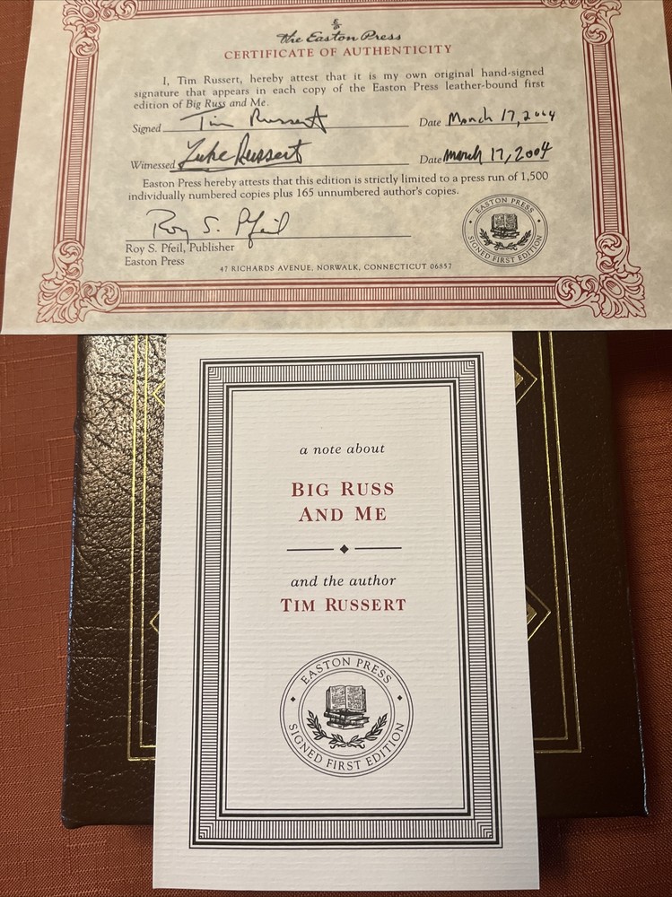 Big Russ and Me, Father and Son: Lessons in Life, Tim Russert, Easton Press, Signed First Edition, Bound in Genuine Leather, Like New, Number 617 of 1,500.