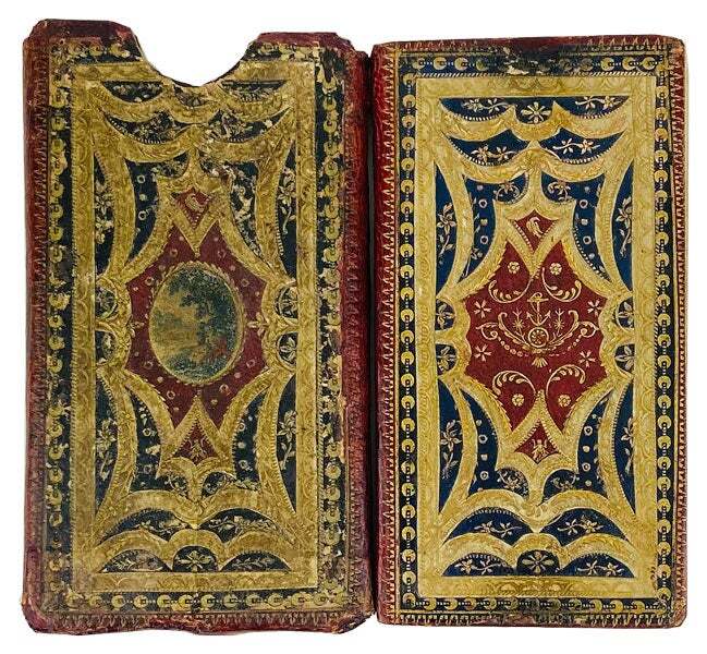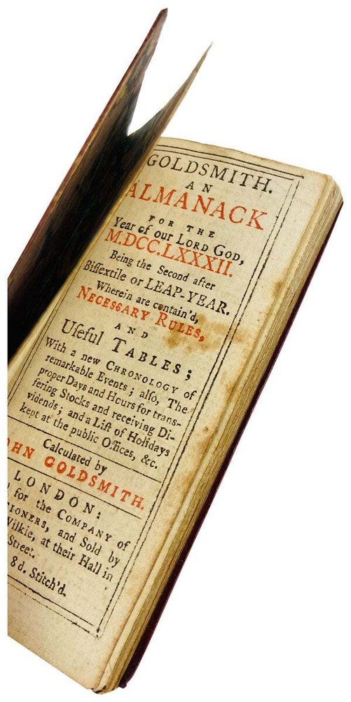 Goldsmith. An Almanack for the Year of Our Lord God, M.DCC.LXXXII. Being the second after bissextile or leap-year. Wherein are contain'd necessary rules, and useful tables; with a new chronology of remarkable events; also, the proper days and hours for transferring stocks and receiving dividends; and a list of holidays kept at the public offices, &c Author: John Goldsmith Title: Goldsmith. An Almanack for the Year of Our Lord God, M.DCC.LXXXII. Being the second after bissextile or leap-year. Wherein are contain'd necessary rules, and useful tables; with a new chronology of remarkable events; also, the proper days and hours for transferring stocks and receiving dividends; and a list of holidays kept at the public offices, &c Publication: London: Printed for the Company of Stationers, and Sold by John Wilkie, 1782 Description: Very Good. London: Printed for the Company of Stationers, and Sold by John Wilkie, [1782]. Small 24mo (10cm.); inlaid red, white, and blue elaborately gilt-tooled morocco with central motif of an anchor surrounded by myriad floral patterns, at its head a bird, at its foot a bee, marbled endpapers; housed in matching chemise with miniature hand-colored decorative elements to both covers depicting the repeating image of a couple sitting beneath a tree on a riverbank; 48pp. [A-B12], the first gathering interleaved with blanks, the second gathering bound out of order but complete; title page and first gathering printed in red and black. Inoffensive pinpoint touchups to upper cover extremities and chemise, chemise leather a bit rubbed and darkened, contemporary ownership signature to front flyleaf, contemporary cricket-shaped stain on p. 13; a Very Good copy in an exquisite contemporary deluxe binding. Below title page imprint: "Price 8 d. Stitch'd." Published under the authorship of John Goldsmith, the 17th-century publisher who first began calculating and issuing almanacs in the 1660s and whose name continued to be used more than a century later. The text of this example in the standard format, opening with a daily table providing the lunar phases and weather forecasts ("Clowdy with rain or snow," "Seasonable weather now," "Fine warm weather, sometimes flying showers," etc.); followed by a list of solar ingresses, eclipses, the dates of the British royal family; holidays; and finally a list of remarkable historical and contemporary events. OCLC locates one copy of this edition as of July, 2020, at the Huntington. ESTC T35691 adds the British Library. No physical copies in COPAC or KVK. Seller ID: 21239 Subject: 18th Century, Bindings, England / English Writers, Reference Capitol Hill Books is a used bookstore located on historic Capitol Hill in Washington DC, with three floors of quality used books, first editions, and rare books. [Note: Our online inventory is stored and managed at a separate location from at our brick and mortar shop. If you have a question about an item listed online, please send a direct message here rather than calling the store so that we can make sure someone familiar with the item in question can respond.] Terms Books described only as First Editions are First Printings unless otherwise specified. All items are guaranteed to be as described or they may be returned within 30 days of receipt for a full refund. All orders ship within two business days. Standard mail is USPS Media Mail. Expedited and international shipping are also available (please contact for estimates). We offer combined shipping on multiple orders. This listing was created by Bibliopolis.