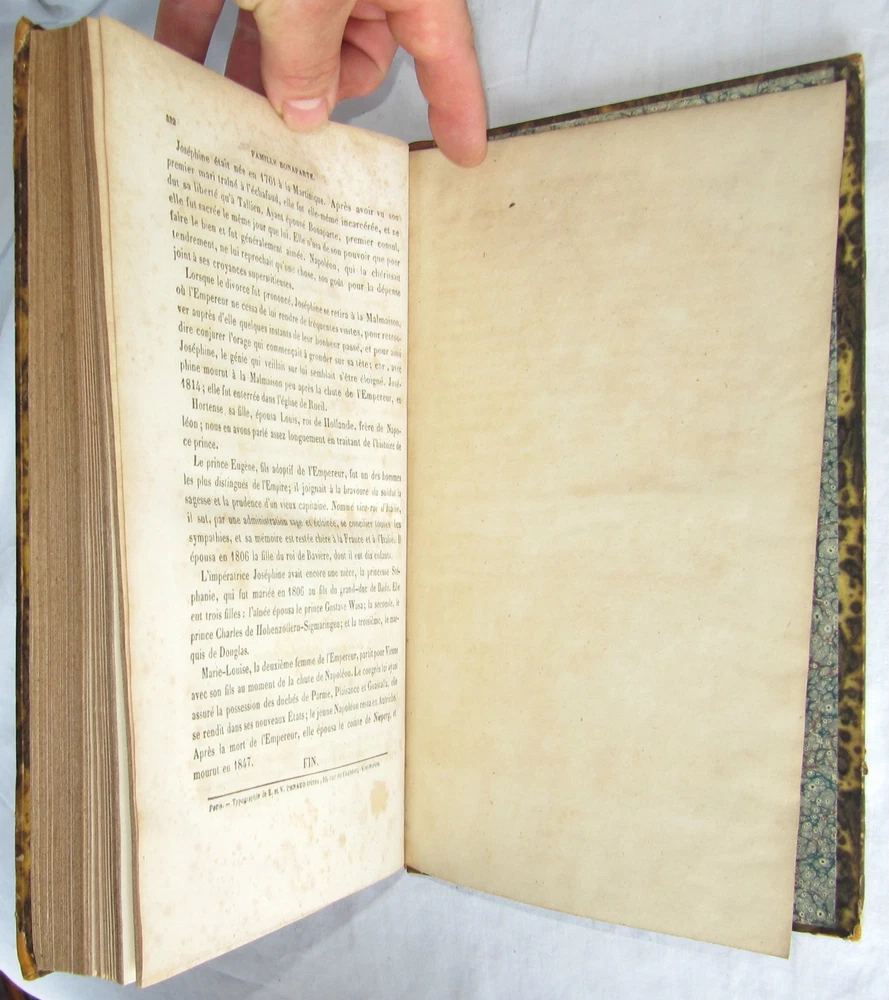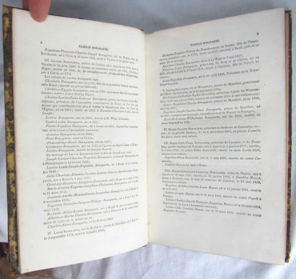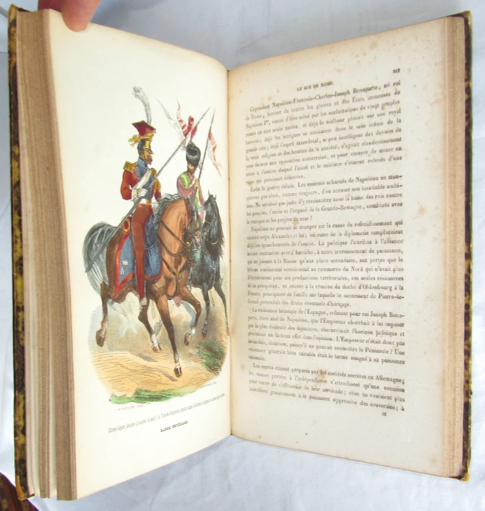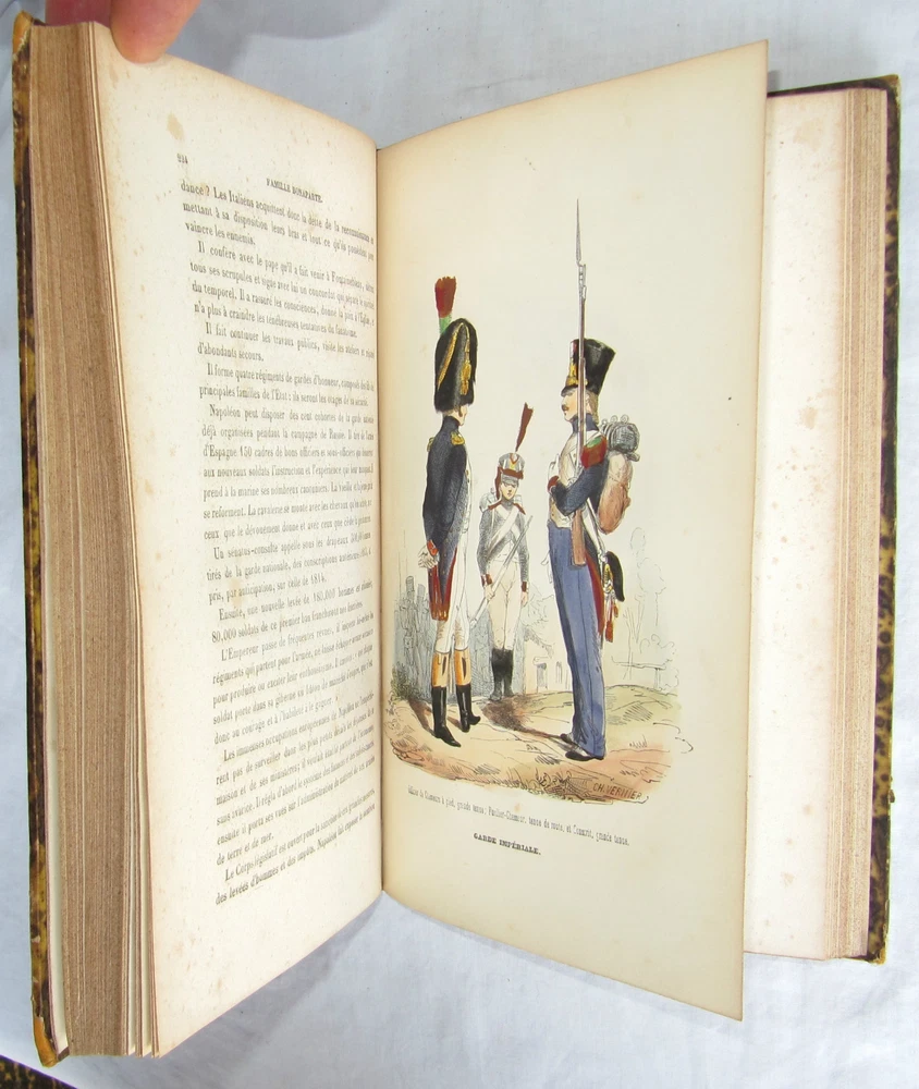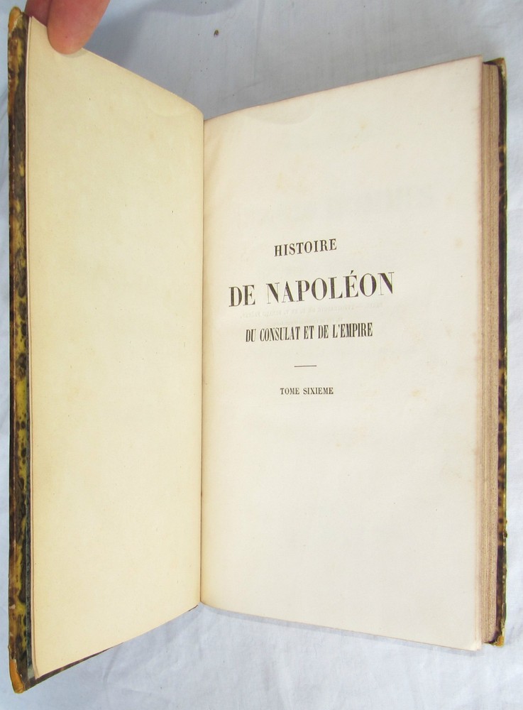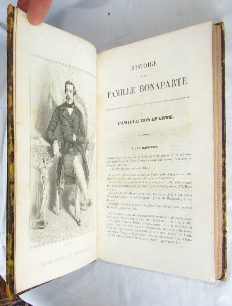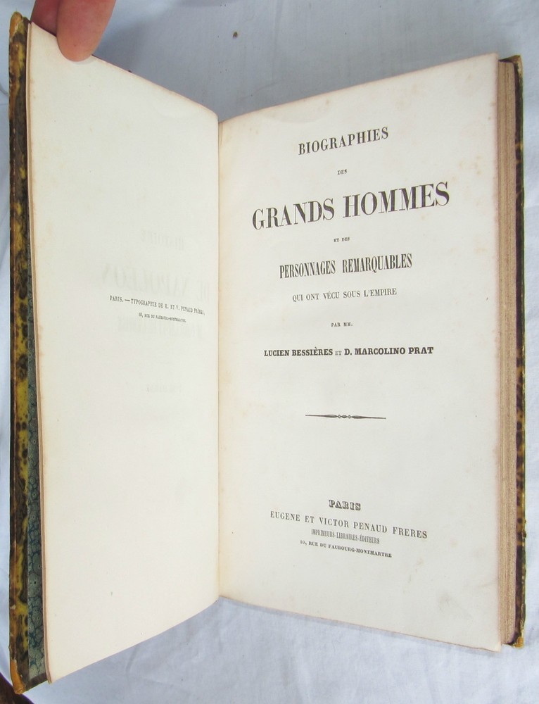 DETAILS: Titles: Histoire De Napoleon Du Consulat Et De L'Empire Tome Sixieme. Biographies Des Grand Hommes Et Des Personnages Remarquables Qui Ont Vecu Sous L'Empire. Par MM. Lucien Bessieres Et D. Marcolino Prat. Histoire De La Famille Bonaparte. Date Published: Circa 1850 . Place Published: Paris . Published By: Eugene Et Victor Penaud Freres . Description: Biographies of prominent members of Napoleon Bonaparte's immediate family, (please see pictures). Illustrated, some in color ! Size: Approx 10 1/8" x 6 1/2" x 1". CONDITION: Overall: Fair to good. Bound in a contemporary, (probably original) binding. Leather spine, hardcover boards! Pages : Good with some occasional moderate foxing and or soiling, (please see pictures). Binding: Very good, still sound. Hinges: Boards still firmly attached. However, front hinge leather splitting, (please see pictures). Hardcovers: Good with some wear, (please see pictures) . Spine: Fair with significant wear, discoloration, soiling, (please see pictures) . WHY SHOULD YOU BUY FROM US? 1. Honest descriptions. 2. Efficient communication. 3. Sympathetic and patient packaging, using appropriate materials. 4. Fast order dispatch, usually within one business day. 5. A sincere commitment to 100% customer satisfaction. IF FOR ANY REASON YOU HAVE A CONCERN WITH OUR PRODUCT OR SERVICE, PLEASE CONTACT US SO WE CAN MAKE IT RIGHT! THANK YOU FOR YOUR INTEREST!