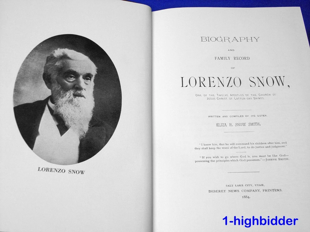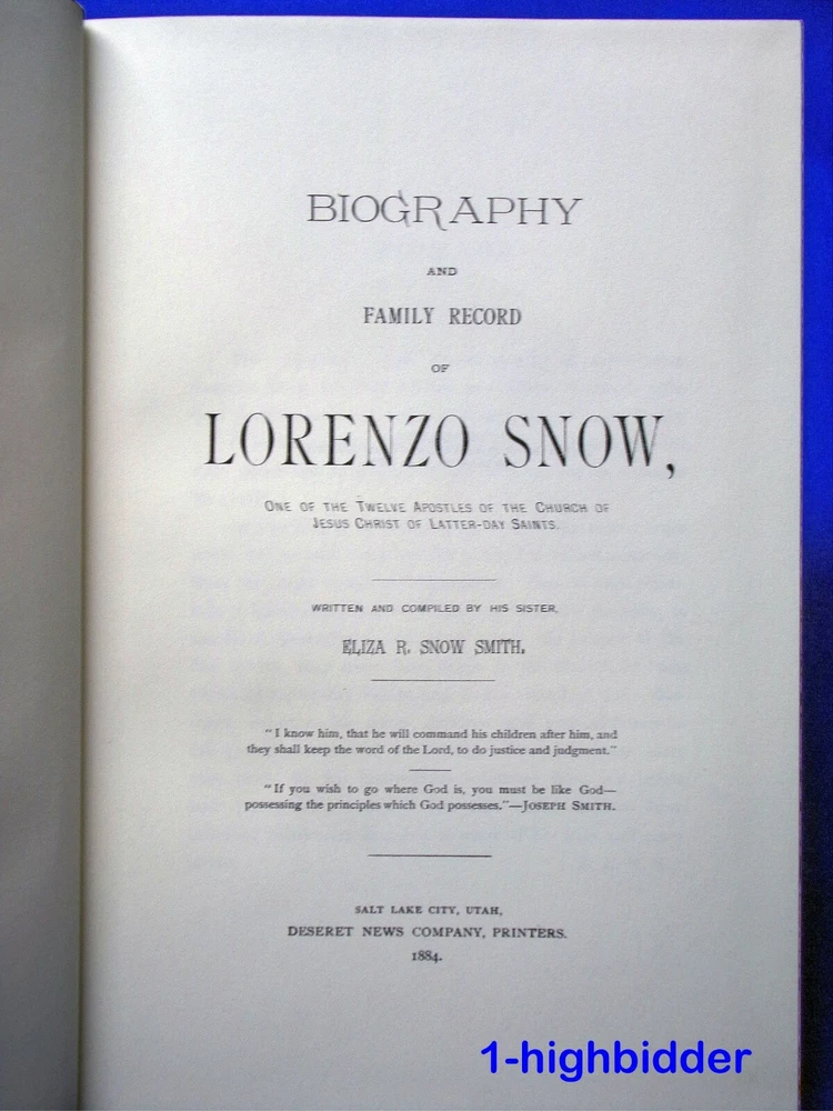 Biography & Family Record of Lorenzo Snow Leather LDS Mormon Employee Gift MINT- ___________________________________________ Biography & Family Record of Lorenzo Snow by Eliza R. Snow Published by The Church of Jesus Christ of Latter-day Saints (1999) About the Book: This book was published by the Church of Jesus Christ of Latter-day Saints and was a special edition printed by the Church with high quality leather, satin end pages, and a sewn-in satin ribbon marker. These were given as a Christmas gift to employees of the Church and were never made available for purchase to the public. This book was originally written and compiled by his sister, Eliza R. Snow Smith in 1884. It measures approximately 9 1/2" tall and 6 3/8" wide. Condition: LIKE NEW 1999 LDS Employee Leather Bound Gift Edition Hardcover Book with Christmas card from the First Presidency (not shown). The binding is tight and all 581 pages within are bright white with NO WRITING, UNDERLINING, HIGH-LIGHTING, RIPS, TEARS, BENDS OR FOLDS. The beautiful leather covers are perfect. You will be happy with this one! Buy with confidence from a seller who takes the time to show you the details and not use just stock photos. Please check out all my pictures and email with any questions! Thanks for looking! About Lorenzo Snow: Lorenzo Snow (April 3, 1814 – October 10, 1901) was an American religious leader who served as the fifth president of The Church of Jesus Christ of Latter-day Saints (LDS Church) from 1898 to his death. Snow was the last president of the LDS Church in the nineteenth century and the first in the twentieth. In 1831, Joseph Smith, the Latter Day Saint prophet, took up residence in Hiram, Ohio, four miles from the Snow farm. The Snow family was Baptist, but soon took a strong interest in the new religious movement. Snow recorded that he heard the Book of Mormon being read aloud in his home in Mantua and met Smith at Hiram in 1831. By 1835, Snow's mother and his older sister Eliza, had joined the Latter Day Saint church. Eliza soon moved to the church headquarters in Kirtland, Ohio, and worked as a school teacher. She, in her biography of Snow, claims to have fostered his interest in Mormonism while he was at Oberlin. Eliza invited Snow to visit her and attend a school of Hebrew newly established by the church. During his visit there, in June 1836, Snow was baptized by John F. Boynton, a member of the Quorum of the Twelve Apostles. While living in Kirtland in 1837, Snow was called to serve a short mission in Ohio, traveling "without purse or scrip." He recorded that relying on the kindness of others for his meals and lodging was difficult for him, as he had always had sufficient means to care for himself. When he returned to Kirtland in 1838, Snow found Smith's followers in turmoil over the failure of the Kirtland Safety Society. Snow and the members of his extended family chose to move to Missouri in the summer of 1838 and join the Latter Day Saints settling near Far West. Snow became seriously ill with a fever, and was nursed for several weeks by his sister Eliza. On his recovery, Snow left for a second mission to Illinois and Kentucky in the fall of 1838. He served there through February 1839, when he learned that the Latter Day Saints had been expelled from their settlements in Missouri. He traveled home by way of his former mission area in Ohio. He was again taken ill and was cared for by members of the church. He remained in Ohio, preaching and working with church members until the fall of 1839. During the school year of 1839–40, Snow taught in Shalersville, Ohio. He sent money to his family, which had by then settled in Nauvoo, Illinois; he joined them in May 1840. Shortly after he arrived in Nauvoo, Snow was asked to serve a mission in England. After an unpleasant sea voyage from New York City, Snow met with some of the members of the Quorum of the Twelve who had opened the British Mission in 1839, including Brigham Young, Heber C. Kimball, and Parley P. Pratt. Snow worked briefly in the Manchester area, and had success in Birmingham, where he baptized people in Greet's Green and organized a branch in Wolverhampton. Snow was assigned to preside over church members in London. During his administration, church membership in the city increased from approximately 100 to 400 members. He was released from his mission by Pratt, who by then was president of an expanding European Mission. Snow arrived home on April 12, 1843, and was accompanied by a shipload of 250 British converts. After visiting with his family, Snow again secured a teaching position for the winter, teaching at Lima, Illinois, thirty miles from Nauvoo. In late spring 1844, he returned to Ohio, preaching and baptizing new converts and distributing recent church publications to members. He was working in Cincinnati, Ohio, when he learned of the assassination of Joseph Smith. Snow closed his Ohio mission and promptly returned to Nauvoo. During the period of disorganization and schism that followed Smith's death, Snow chose to follow the Quorum of the Twelve under Brigham Young. In 1845, Snow was involved in work in the Nauvoo Temple. Snow and his family, with wagons and livestock, joined a group of emigrants and moved across the Mississippi River into Iowa in February 1846. On the way west, Snow again became ill and the family stopped at Mt. Pisgah, Iowa. Three Snow children were born at the Mormon refugee settlement, but none of them survived. Snow was called to preside over the church organization in Mt. Pisgah and actively raised money to assist the bands of emigrants in their move west. The Snow family arrived in the Salt Lake Valley in 1848. Copyright © 2018-2024 TDM Inc. The photos and text in this listing are copyrighted. I spend lots of time writing up my descriptions and despise it when un-original losers cut and paste my descriptions in as their own. It is against ebay policy and if you are caught, you will be reported to ebay and could be