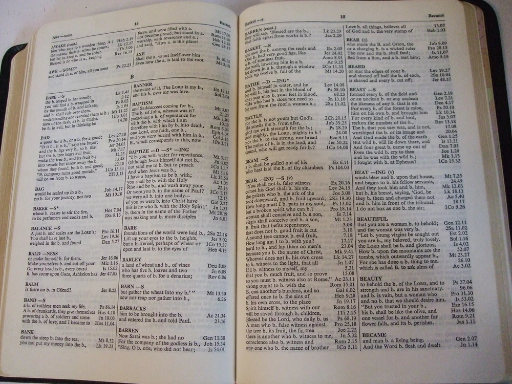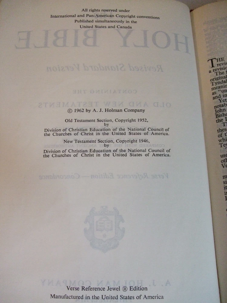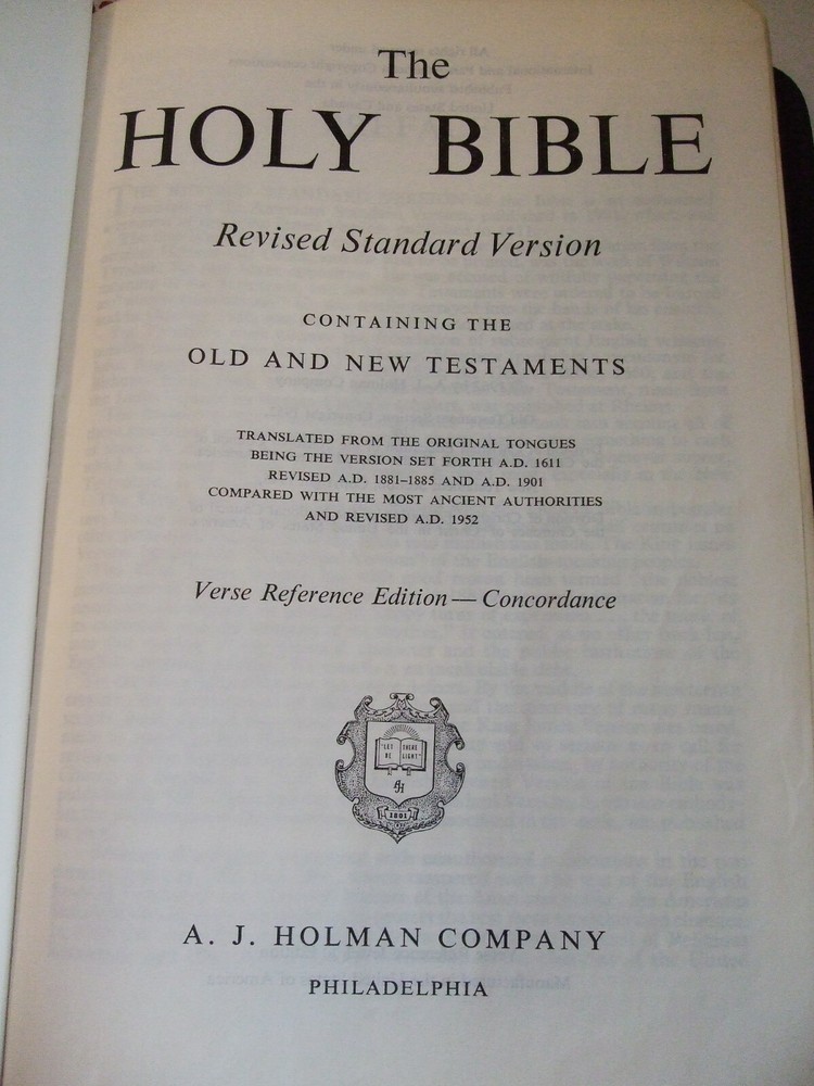 The Holy Bible Revised Standard Version Containing the Old and New Testaments. Verse Reference Edition. Philadelphia, PA: A. J. Holman Company, 1962. Leather, no dust jacket, 1359 pages. 8vo: 8 1/2'' x 6'' Very good- condition: Black Persian grain leather cover, fine India (Bible) paper, gilt edges, black paste down endpapers, and red satin ribbon. Family record is partially filled in. Cover has some stress marks on edges. Bible has concordance and maps. Tightly bound copy with clean interior having no other writing, underlining, or highlighting in margins or text block. Inventory number 9215 POSTAGE and PAYMENT OPTIONS If you want to insure parcel against damage, please request this option and I will adjust your invoice. If you want to upgrade shipping for expedited delivery, just ask. Payment is due within 72 hours of winning the auction/Buy It Now Books are shipped within 3 business days. I have no control over delivery time once the package leaves my hands.