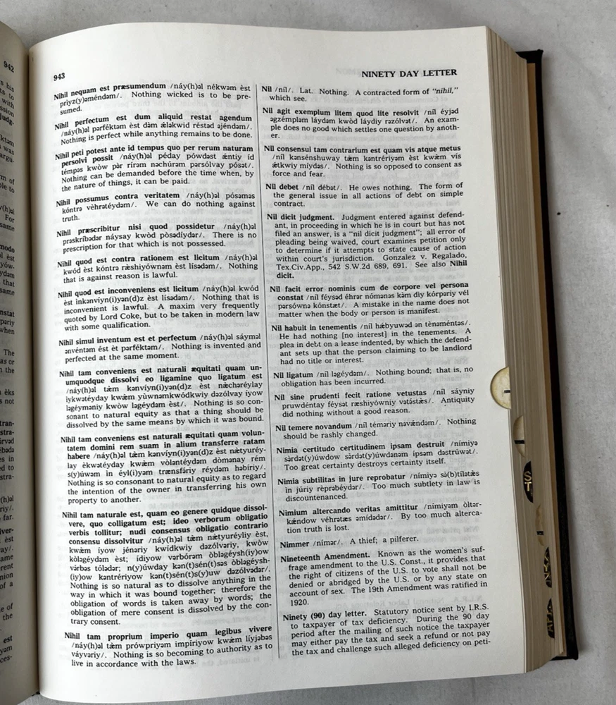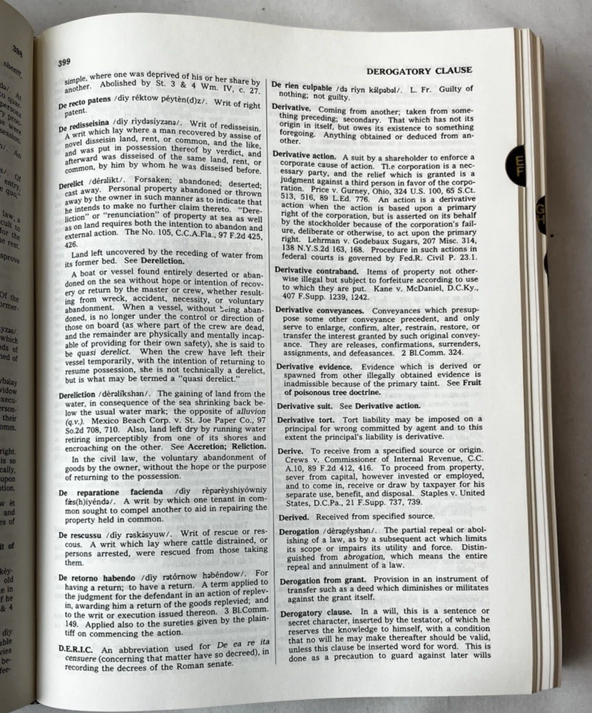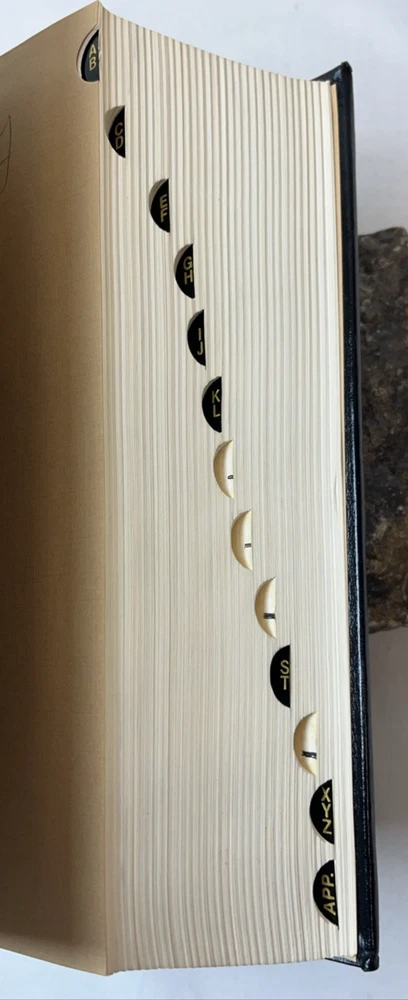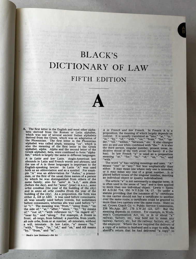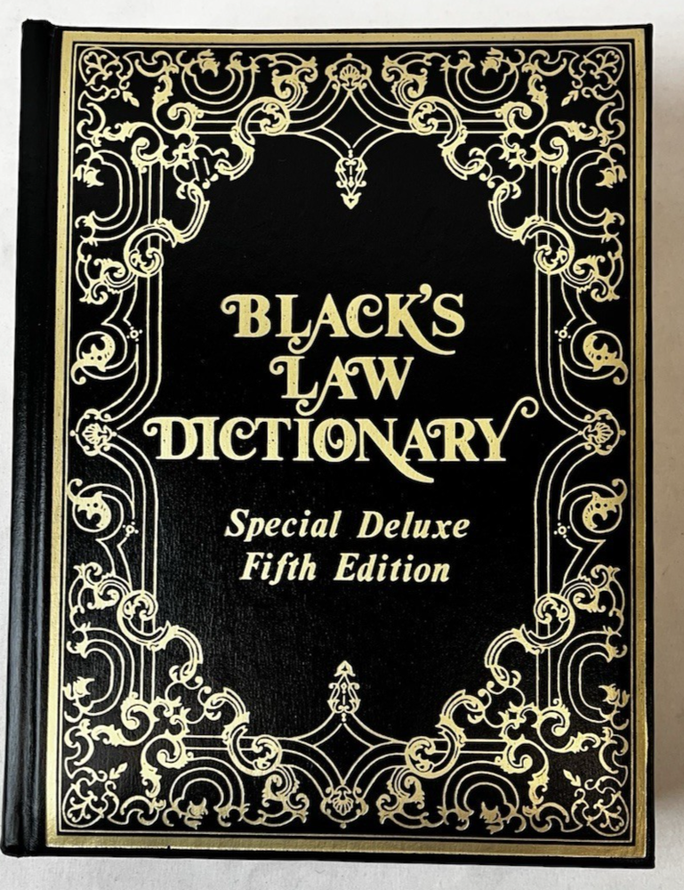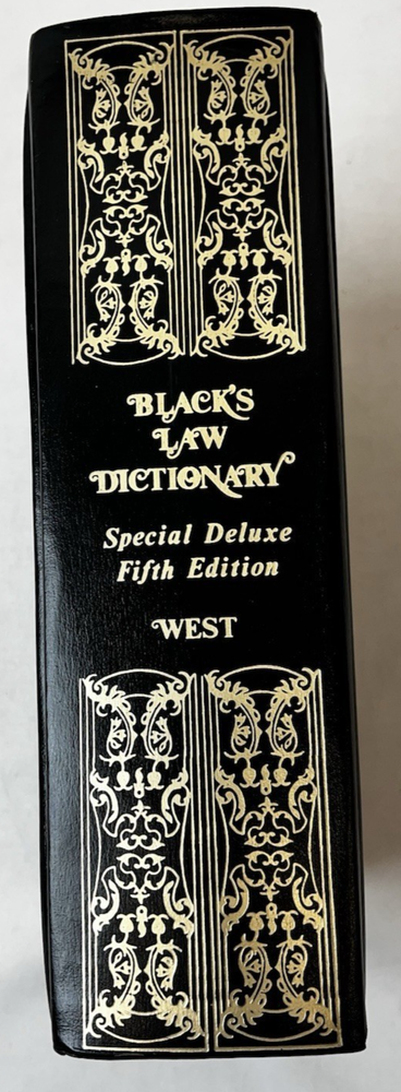 Black's Law Dictionary, 5th Edition, by Henry Campbell Black, M.A. Published in 1979 by West Publishing Co., St. Paul Minn. Light wear to cover, soft at head and tail of spine. Slightly shelf cocked. Previous owner's name written on ffp. Pages are tightly bound, clean, unmarked. Four of the index tab stickers are missing. 1511 pp Measures approximately 10.25 x 7.75 x 3 inches See photos. vk