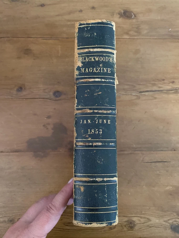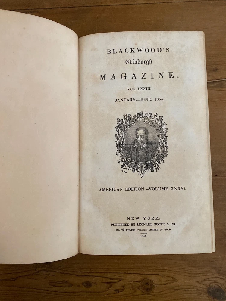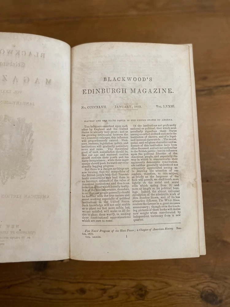 This is a rare and valuable copy of Blackwood's Edinburgh Magazine from January to June 1853. The leather bound volume is filled with captivating articles and stories written by Leonard Scott, the publisher and author. The magazine is in its original form and was printed in New York, making it a great addition to any collection of historical items. The volume covers a range of topics including biography and autobiography, and is a must-have for collectors and enthusiasts alike. Topic is Slavery in America....this is pre-stirring of the American Civil WAR Track Page Views With Auctiva's Counter