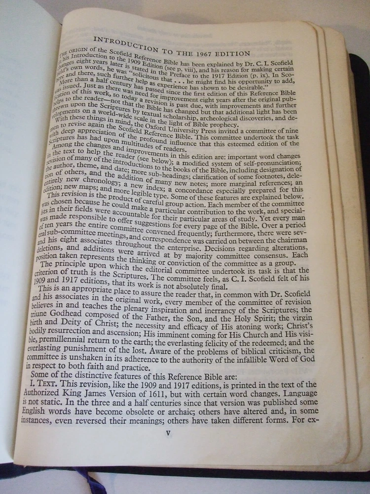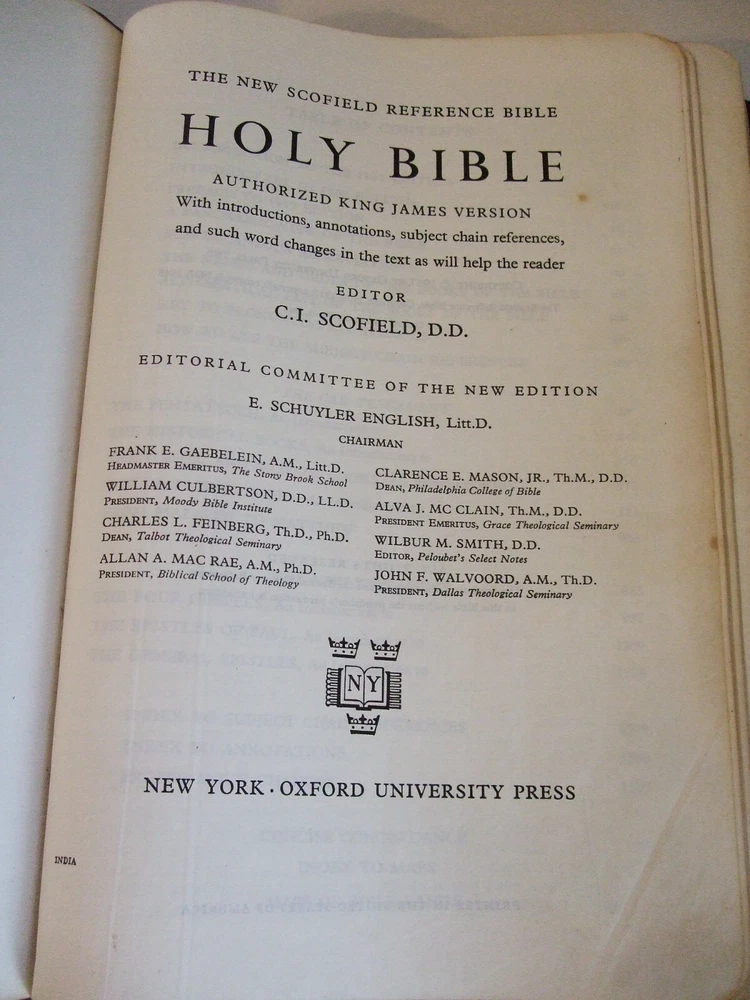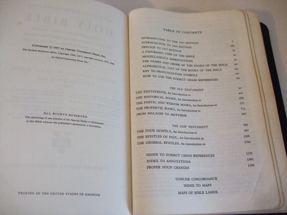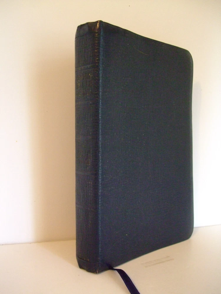 The New Scofield Reference Bible. Holy Bible Authorized King James Version. Scofield, C. I. (Editor) New York, NY: Oxford University Press, 1967. Leather, no dust jacket, 1584 pages. 8vo: 9 1/4'' x 6 1/4'' Good condition: Dark blue natural Morocco cover, dark blue leather lining, dark blue free endpapers, gilt lettering on spine (completely faded), rubbed gilt page edges, fine India (Bible) paper, and dark blue satin ribbon page marker. Page edges have rubbing. Several pages are detached at bottom portion and consequently have edge wear and tears. Front internal hinge were cover and book join is torn at top portion with some separation. The Bible has marginalia and underlining. Inventory number 12184 POSTAGE and PAYMENT OPTIONS Payment is due within 72 hours of winning the auction/Buy It Now Books are shipped within 3 business days. I have no control over delivery time once the package leaves my hands.