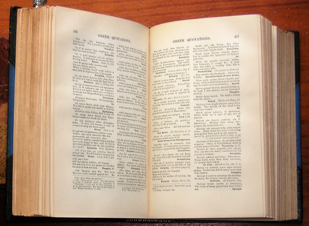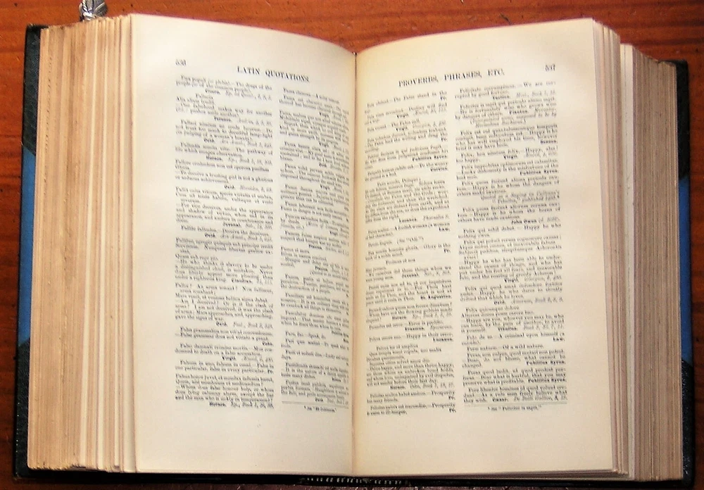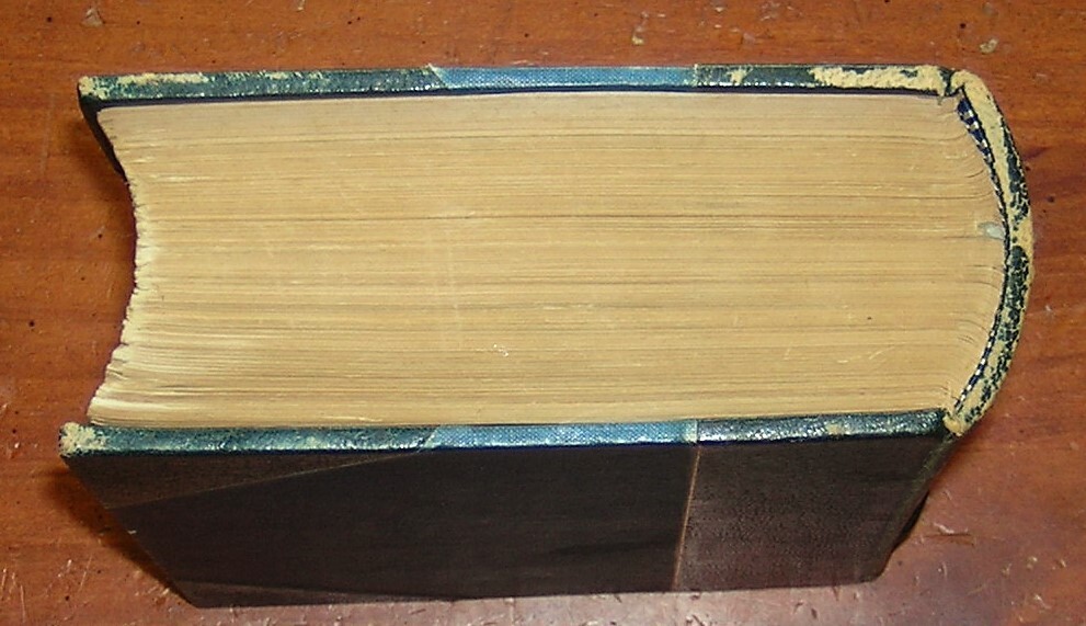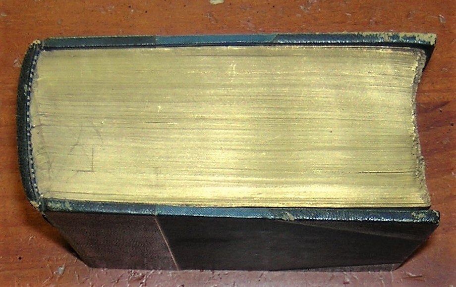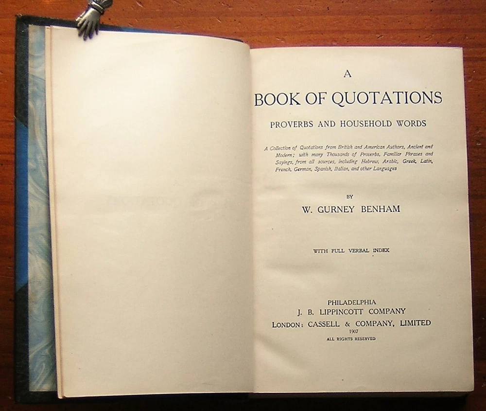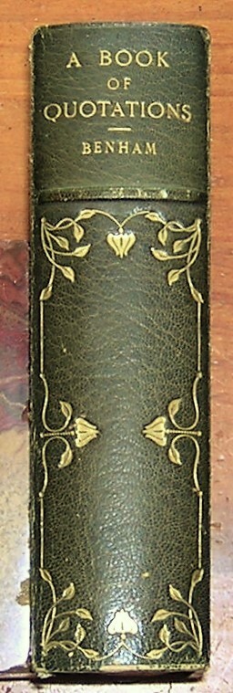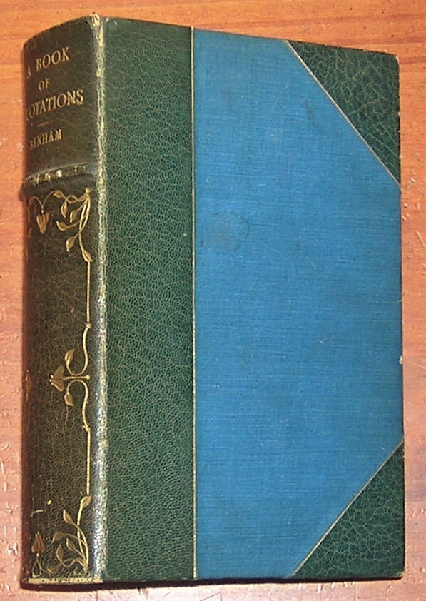 A Book of Quotations, Proverbs and Household Words, by W. Gurney Benham. "With Full Verbal Index." Published in 1907 by J. B. Lippincott Company, Philadelphia. First edition. Hardcover in 3/4 green leather boards, measuring 6 X 9 X 3 inches, 1256 pages, with top edge gilt and marbled endpapers. Nicely gilt ornamented spine, with floral motifs. Includes French, Latin and Greek quotations. Flaws include some external rubbing of the leather, especially along the spine foot, plus smaller nicks along the edges, and a few light stains on the boards. The leather spine is slightly sunned. There's little to no shedding of the leather. Internally, there's a previous owner's bookplate plus a small bookstore sticker on the front endpaper. Small pencil marks (mostly margin brackets) were erased from the first several pages, plus a few pages in the Robert Burns section. Otherwise unmarked. Binding is very secure. A couple of pages were roughly cut open (leaving tears not affecting the text). Page 636 has a small scuff, affecting a quote by Marcus Annaeus Lucanus. There's a clean, since repaired, 4 in. tear on p. 943/944 (see pic #14). And there's a small chip in p. 945/946 in the index, affecting a few of the words in the entries for Creed and Crown, respectively (see pics #15 & 16). Some pages (many toward the back of the book) remain uncut, i.e. are still attached along their top or fore-edges. A good, not very good, copy. Free shipping in the USA. Thank you for looking! Loc: leather drawer #4.