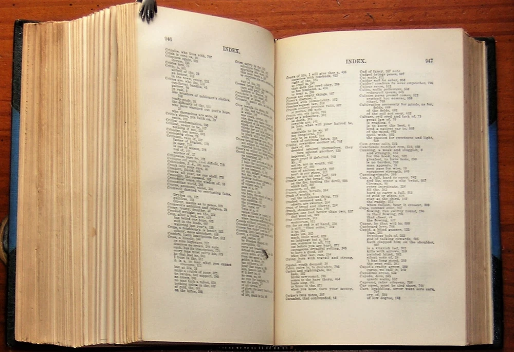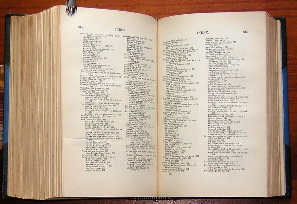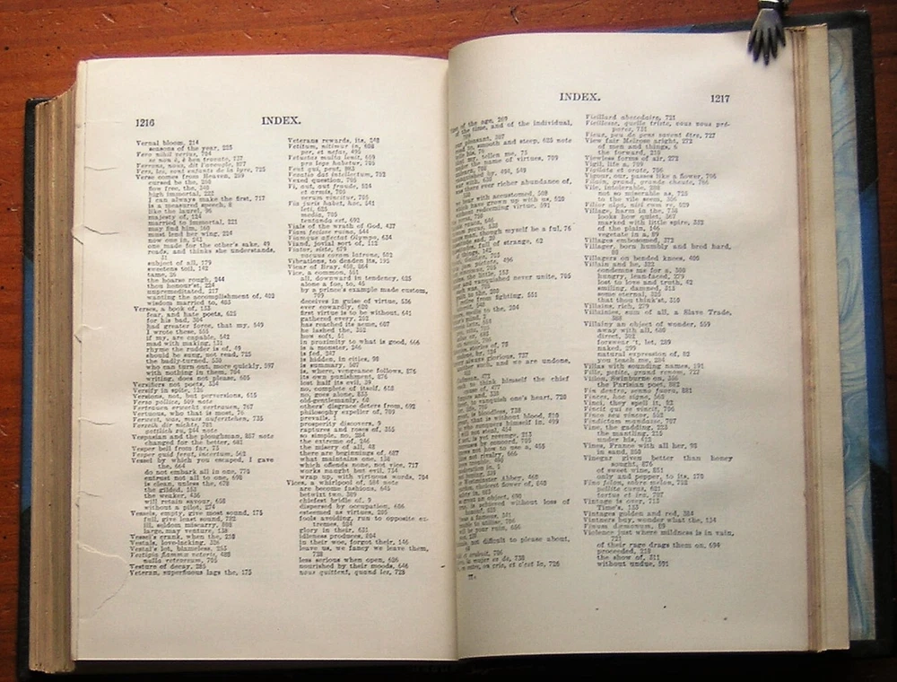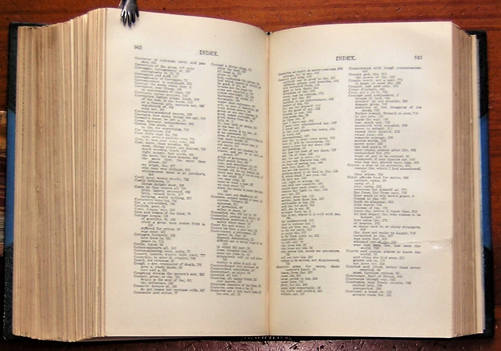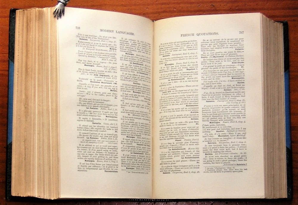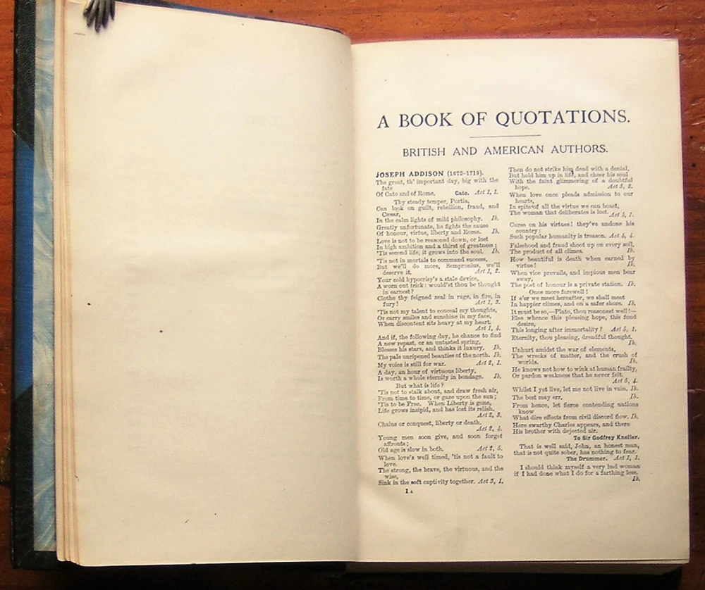 A Book of Quotations, Proverbs and Household Words, by W. Gurney Benham. "With Full Verbal Index." Published in 1907 by J. B. Lippincott Company, Philadelphia. First edition. Hardcover in 3/4 green leather boards, measuring 6 X 9 X 3 inches, 1256 pages, with top edge gilt and marbled endpapers. Nicely gilt ornamented spine, with floral motifs. Includes French, Latin and Greek quotations. Flaws include some external rubbing of the leather, especially along the spine foot, plus smaller nicks along the edges, and a few light stains on the boards. The leather spine is slightly sunned. There's little to no shedding of the leather. Internally, there's a previous owner's bookplate plus a small bookstore sticker on the front endpaper. Small pencil marks (mostly margin brackets) were erased from the first several pages, plus a few pages in the Robert Burns section. Otherwise unmarked. Binding is very secure. A couple of pages were roughly cut open (leaving tears not affecting the text). Page 636 has a small scuff, affecting a quote by Marcus Annaeus Lucanus. There's a clean, since repaired, 4 in. tear on p. 943/944 (see pic #14). And there's a small chip in p. 945/946 in the index, affecting a few of the words in the entries for Creed and Crown, respectively (see pics #15 & 16). Some pages (many toward the back of the book) remain uncut, i.e. are still attached along their top or fore-edges. A good, not very good, copy. Free shipping in the USA. Thank you for looking! Loc: leather drawer #4.