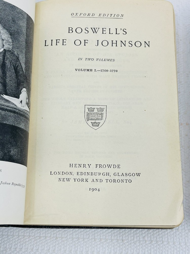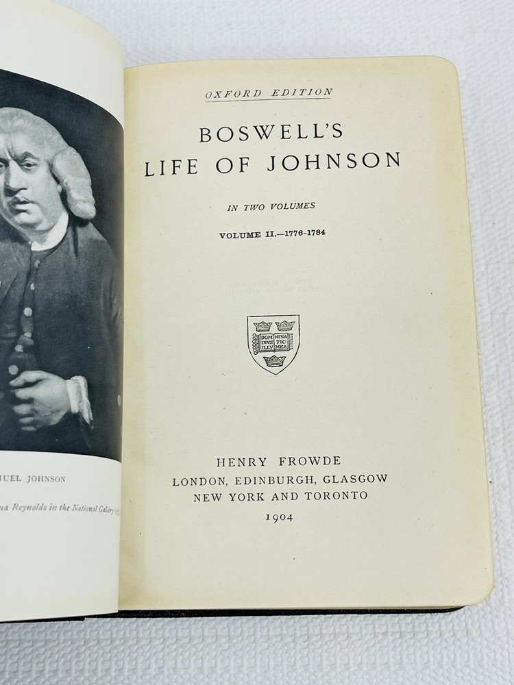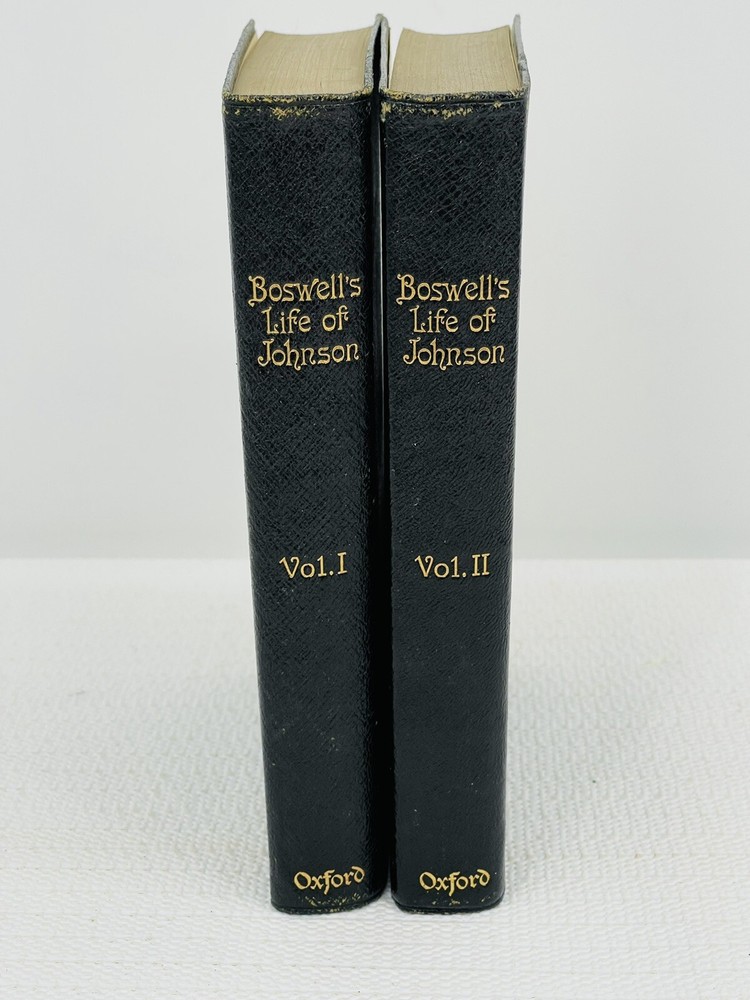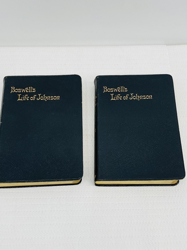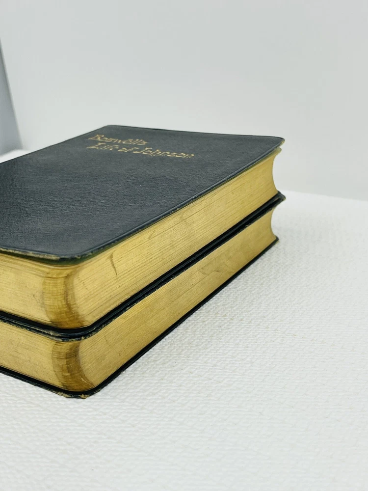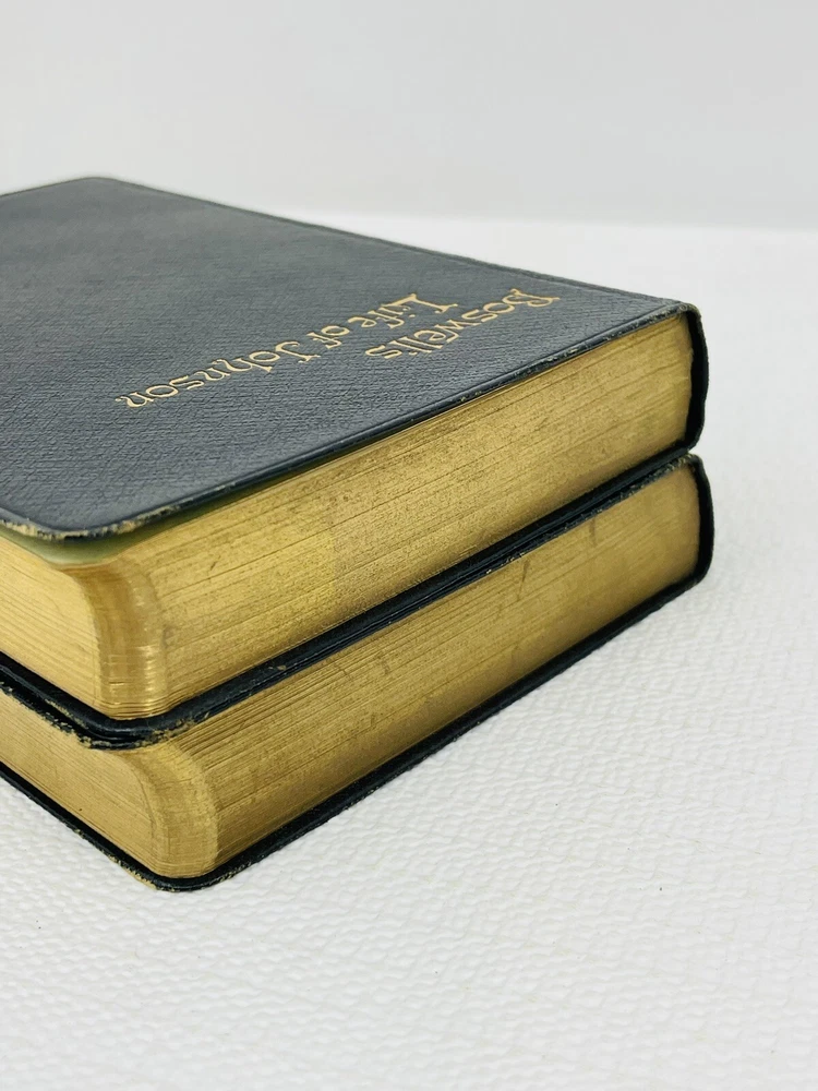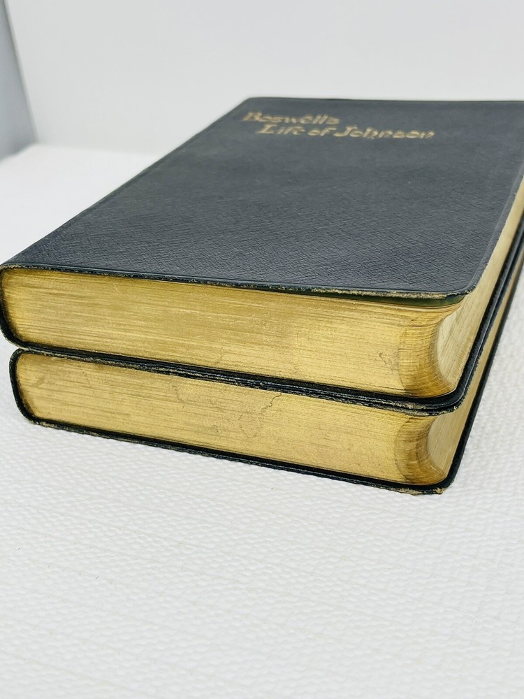 Boswell’s Life of Johnson OXFORD 1904 Frowde 2 Volumes Leather Bound RARE. Malone’s 3rd Edition Each Book Measures 5 3/16” x 7 1/4” x 1 Gold Edge Gilding Additional Information or Pictures available upon Request This rare collector's edition of James Boswell's "Life of Johnson" is a highly sought after addition to any book collection. The two leather bound volumes, published by Oxford's Frowde in 1904, contain the fascinating biography and autobiography of Samuel Johnson. The binding and language are both in English, making it accessible to a wide audience. The book's special attributes include its leather bound cover, which adds to its antique charm. This book falls under the categories of "Books & Magazines" and "Antiquarian & Collectible." It is a valuable addition to any collection and a must-have for history buffs and bibliophiles alike.