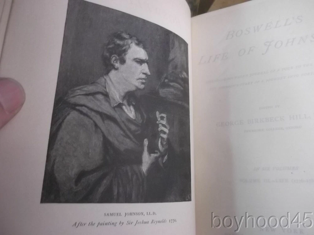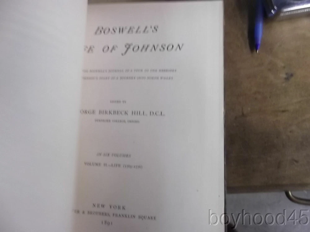 Boswell's Life of Johnson ed. by George Birkbeck Hill--6 Volumes-LEATHER Description Boswell's Life of Johnson ed. by George Birkbeck Hill--6 Volumes-LEATHER I am selling the complete 6-volume set of "Boswell's Life of Johnson" edited by George Birkbeck Hill. Published by Harper & Brothers, NY, 1891. This edition published on the 100th Anniversary of the original publication of this work. This set is bound in half leather. Books show light corner wear/scuffing. Two volumes show touch of wear to leather at heads of spines. Two volumes show some scrapes/scuffs that appear in my photos. Clean, tight and a solid, Very Good set!! Books measure 6 1/8 X 8 7/8. A few complete copies of this set can be found on other internet booksites for upwards of $290 for sets bound in standard cloth bindings!!!! I will offer this lovely, complete 6-volume half leather set for only $285.00 plus $10.00 S&H in the US. PLEASE NOTE: SHIPPING FOR THIS 6-VOLUME SET WILL BE $10.00. Shipping costs to Canada will be considerably less than the general international rate quoted. Thanks for shopping mellowpagesrarebooks.com Payment I accept the following forms of payment: PayPal Shipping & Handling I will ship Priority for an additional fee upon request. PLEASE NOTE: SHIPPING COSTS FOR MULTI-VOLUME SETS OR OVERSIZED BOOKS WILL EXCEED THE STANDARD "US SHIPPING" ECONOMY RATE OF $5.00. COST OF SHIPPING OVERSIZED BOOKS OR MULTI-VOLUME SETS ARE SPECIFIED WITHIN THE TEXT OF THE LISTING. Canadian buyers are not subject to stated international shipping costs and will pay less than the amount stated. US Shipping $4.00 USPS Media Mail® International Shipping $100.00 USPS Priority Mail International FREE scheduling, supersized images and templates. Get Vendio Sales Manager. FREE scheduling, supersized images and templates. Get Vendio Sales Manager. Condition Notes: A very nice 6-volume set! Payment Payment Options: Paypal Shipping Shipping Options: Domestic shipping: Fixed Shipping Charges. International shipping: Fixed Shipping Charges. Shipping Carrier Domestic International Shipping Locations Usps Book Rate $4.00 - - Usps Priority Intl - $100.00 Worldwide I will ship to: United States, Worldwide Vendio provides powerful selling automation for sellers of all sizes.